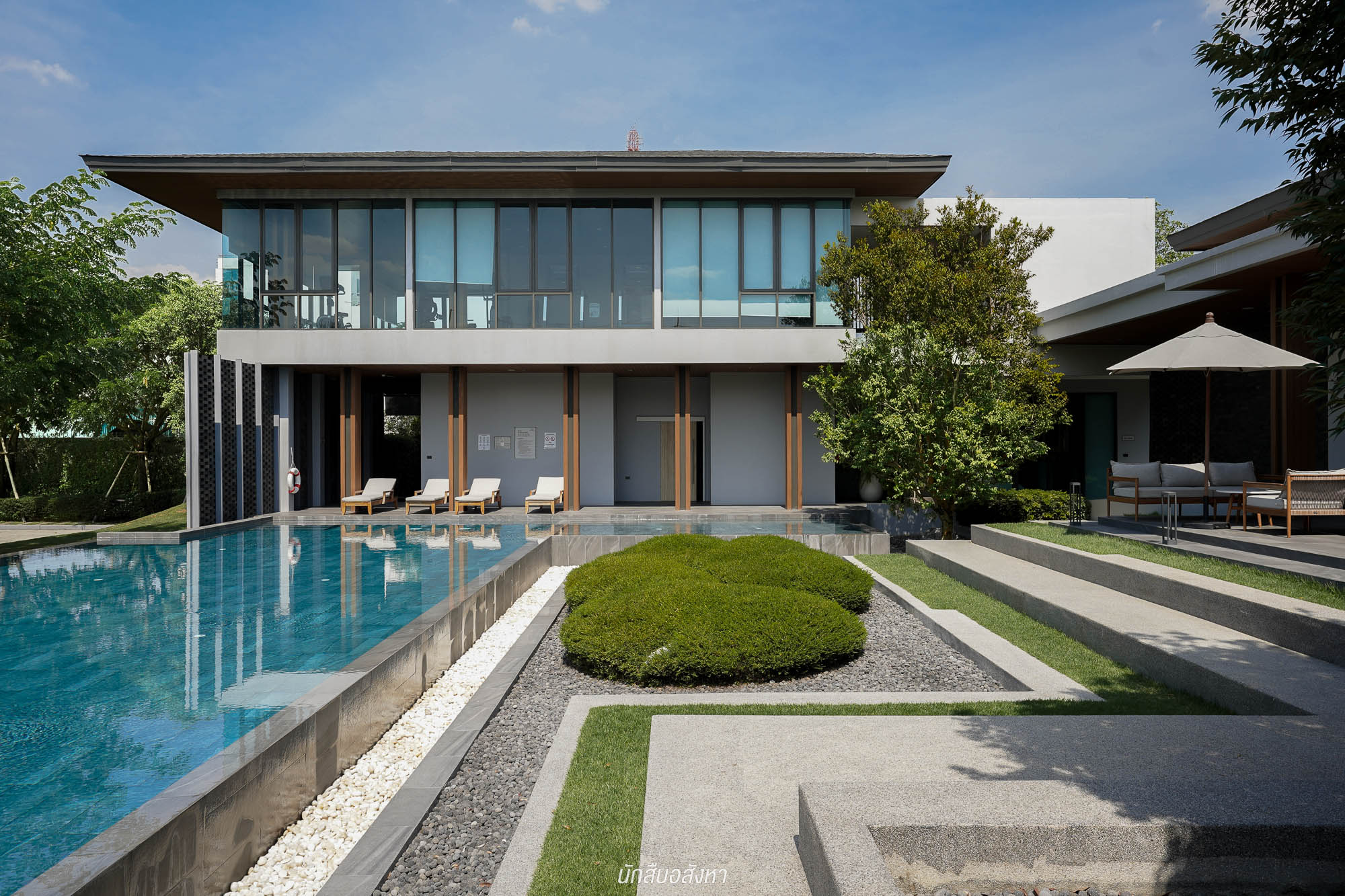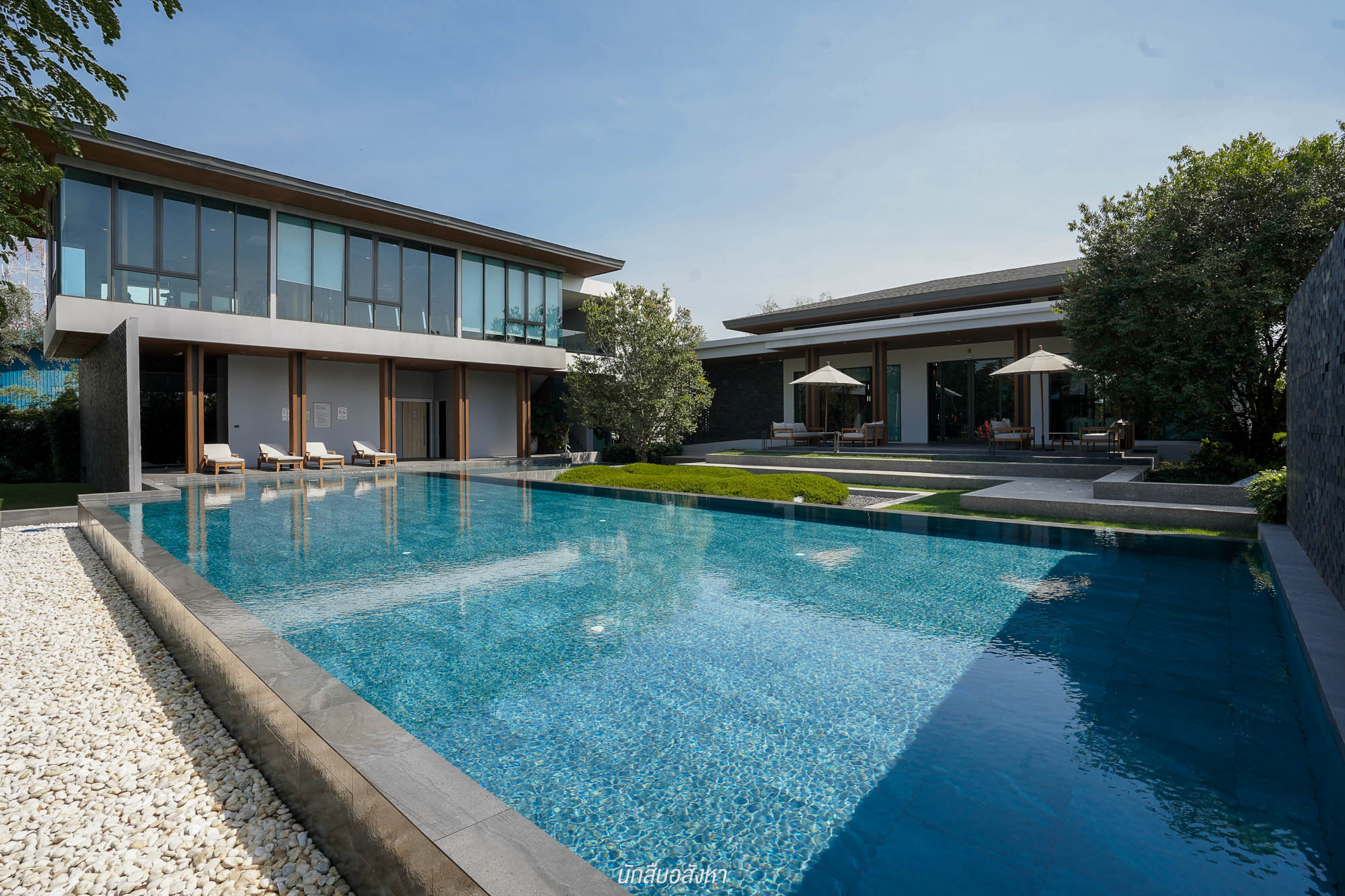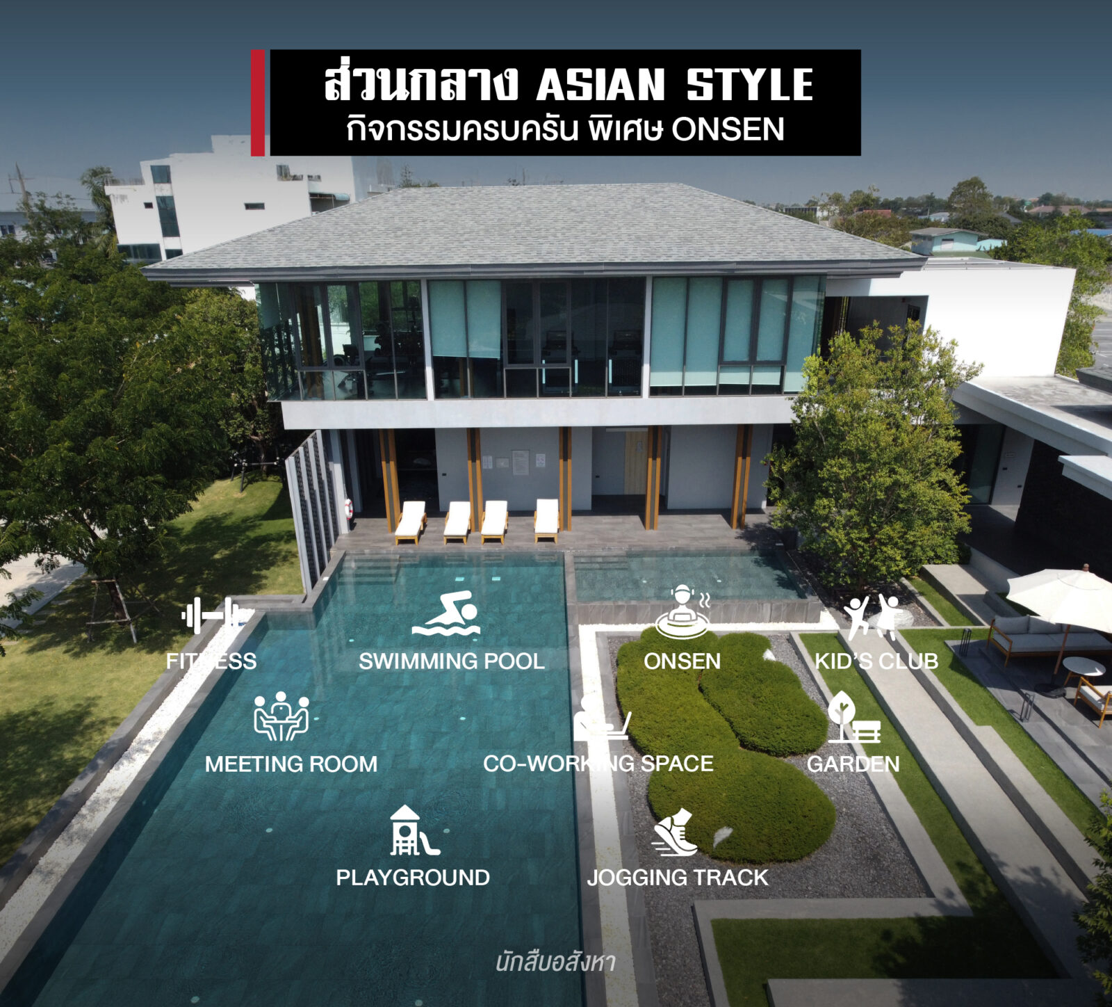และเมื่อผ่าน Main Gate เข้ามาจะเจอกับ อาคารสโมสร ขนาดใหญ่ ประกอบไปด้วย สระว่ายน้ำ ระบบเกลือ แยกสระเด็ก – ผู้ใหญ่ เป็นสัดส่วน,ฟิตเนส , Kid’s Club , Co-working space และพิเศษ Onsen