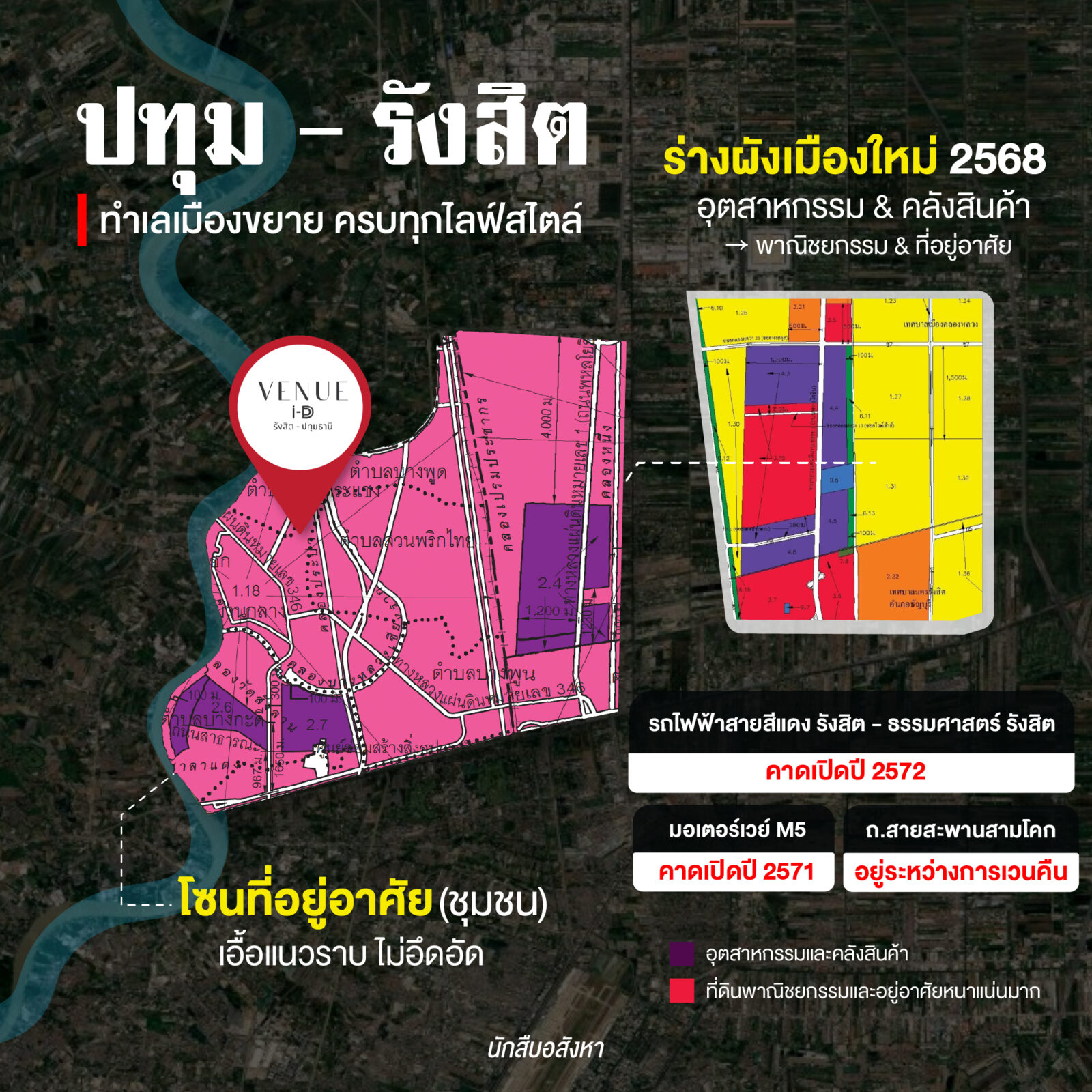 และสำหรับพื้นที่ที่กำลังเป็นกระแส อย่างโซนท่าโขลง – คลองหลวง – รังสิต ล่าสุดได้มีการเปลี่ยนแปลงผังเมือง จากผังสีม่วง (อุตสาหกรรมและคลังสินค้า) เป็นผังสีแดง (พาณิชยกรรมและที่อยู่อาศัยหนาแน่นมาก) ซึ่งโซนนี้เป็นที่ดินของ CPN ที่เคยมีข่าวว่าจะพัฒนาที่ดินเป็น Mixed-use อย่าง Central M / เซ็นทรัล รังสิต แต่ด้วยปัญหาด้านผังเมือง พมีการเปลี่ยนแปลง คาดว่าอีกไม่นาน คงได้ฤกษ์พัฒนาแลนมาร์กแห่งใหม่ ฝั่งรังสิตแน่นอน ทีนี้เรามาดูกันครับว่า ปัจจุบันทำเลรังสิต เติบโตอย่างไร และในอนาคตจะมีโครงการอะไรเข้ามารองรับการขยับขยายเมืองกันบ้าง