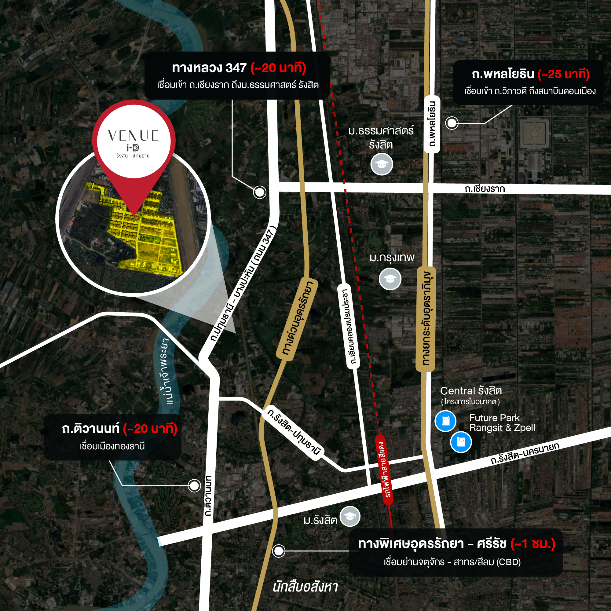 ทีนี้เรามาดูตำแหน่งที่ตั้งของโครงการ ‘เวนิว ไอดี รังสิต-ปทุมธานี (Venue ID Rangsit – Pathumtani)’ กันบ้าง โครงการตั้งอยู่ติดถ.ปทุมธานี-บางปะหัน หรือทางหลวง 347 ซึ่งเป็นทำเลที่เดินทางสะดวก สามารถเชื่อมต่อถนนได้หลากหลายเส้นทาง ไม่ว่าจะเป็น
