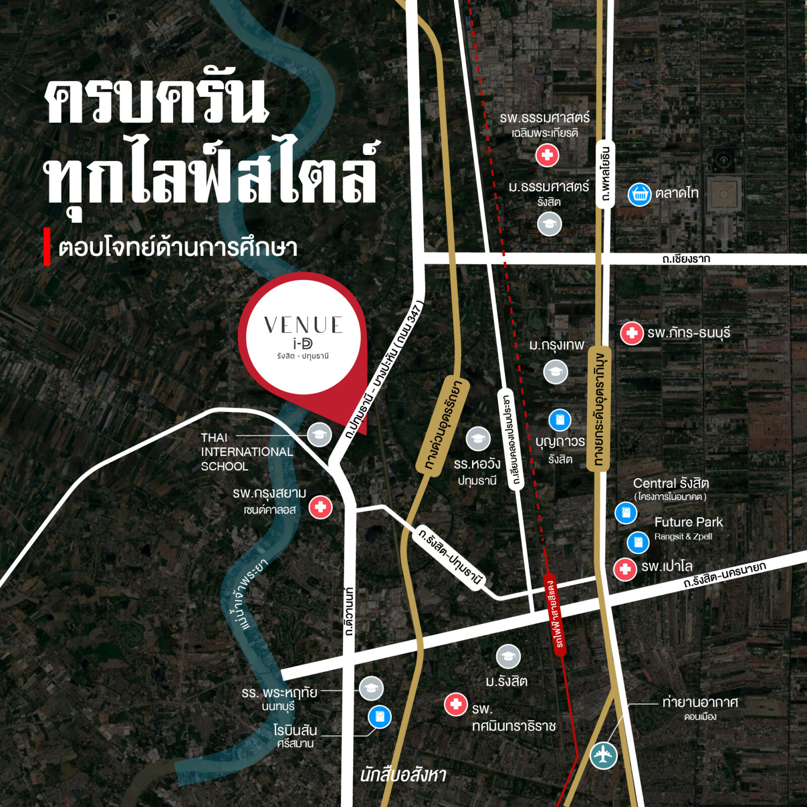 ■ ทางหลวง 347 เชื่อมเข้า ถ.เชียงราก ถึงม.ธรรมศาสตร์ รังสิต ภายใน 20 นาที* เหมาะกับครอบครัวที่มีบุตรหลาน เรียนอยู่ในโซนม.ธรรมศาสตร์ หรือม. กรุงเทพ หรือบุคลากรทำงานในมหาวิทยาลัย
