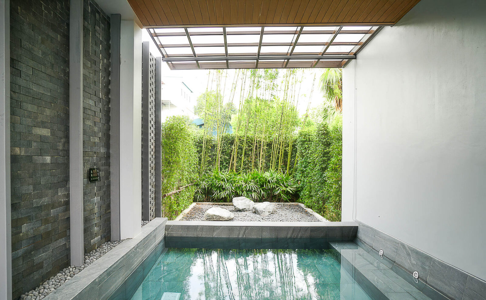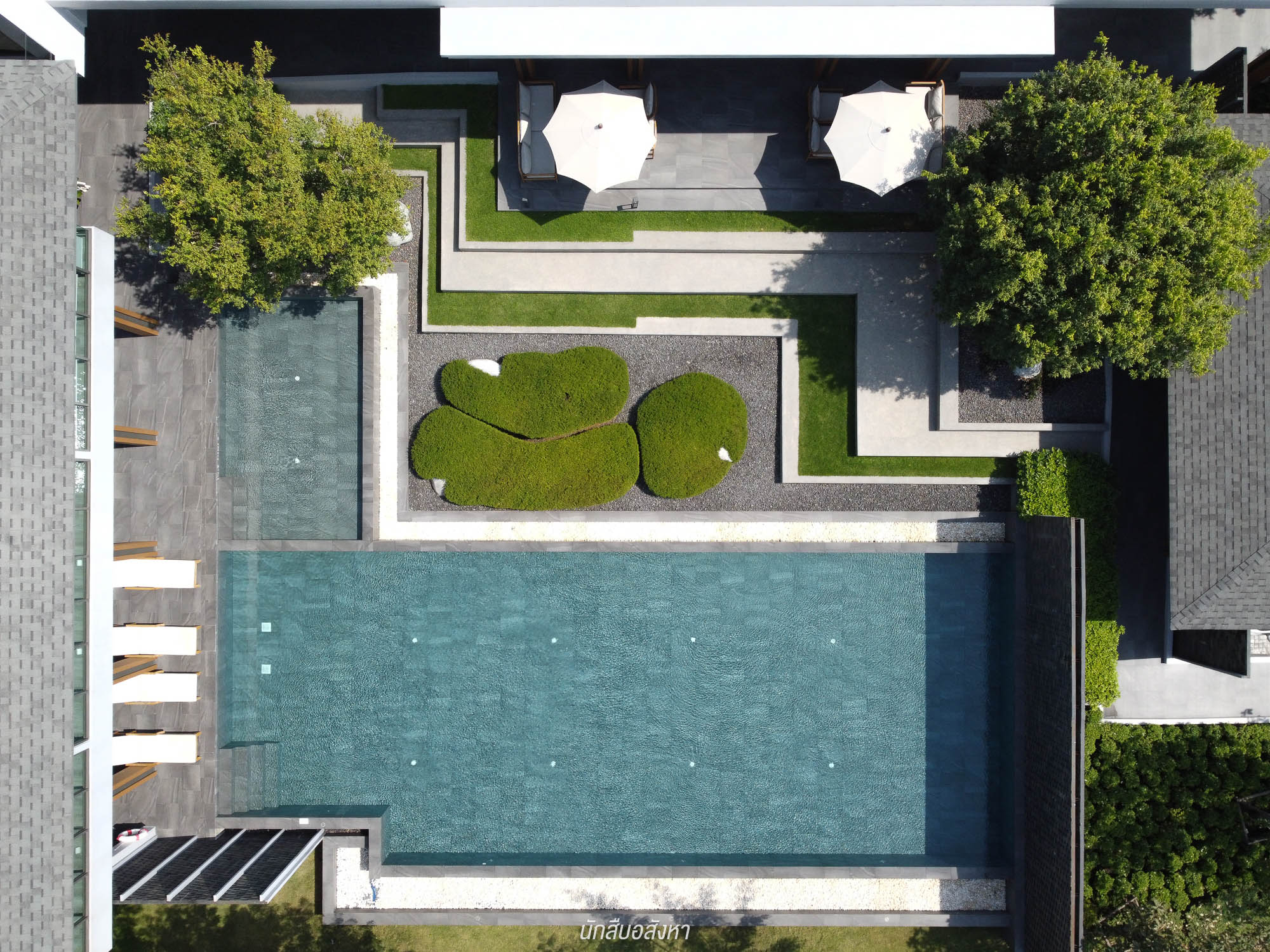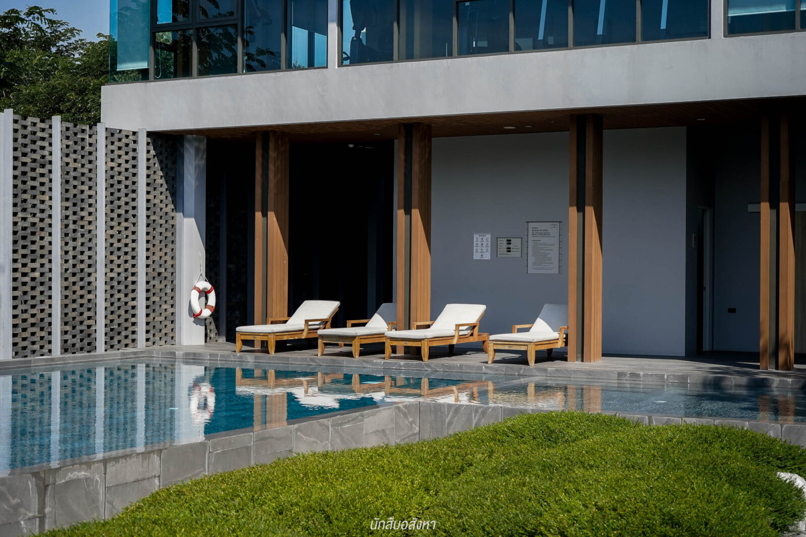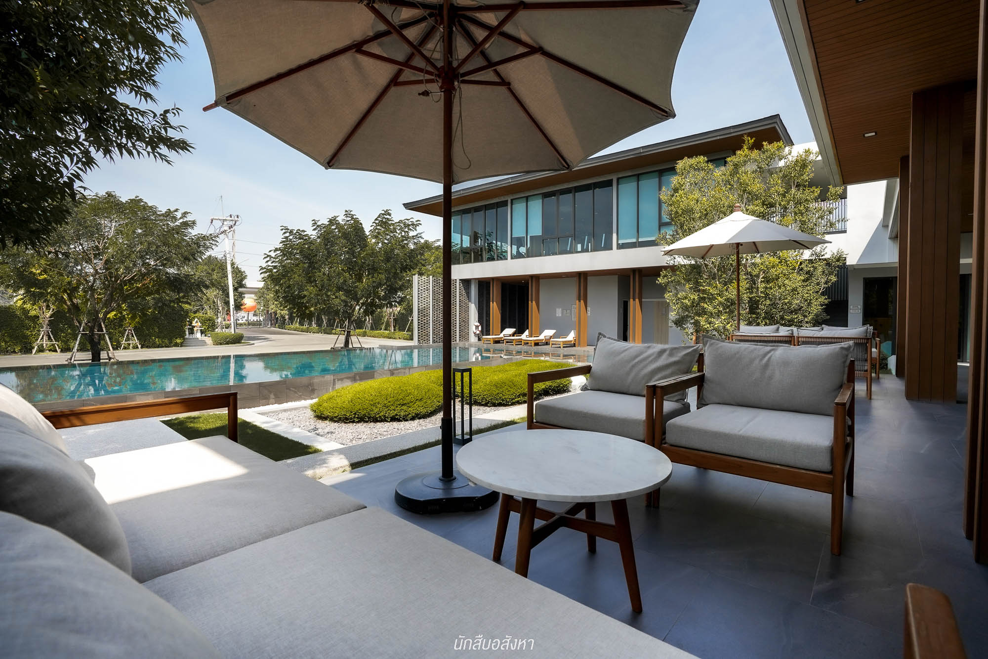 ส่วนด้านนอก จะมีพื้นที่ Semi-Outdoor ที่นั่งพักผ่อน สามารถมานั่งเล่นช่วงเย็นได้ ส่วนสระว่ายน้ำ กลางแจ้ง จะเป็นสระระบบเกลือ ที่มีการแยกสระเด็ก – ผู้ใหญ่ ไว้ให้เรียบร้อย ริมสระด้านในวาง Daybed ไว้รองรับ