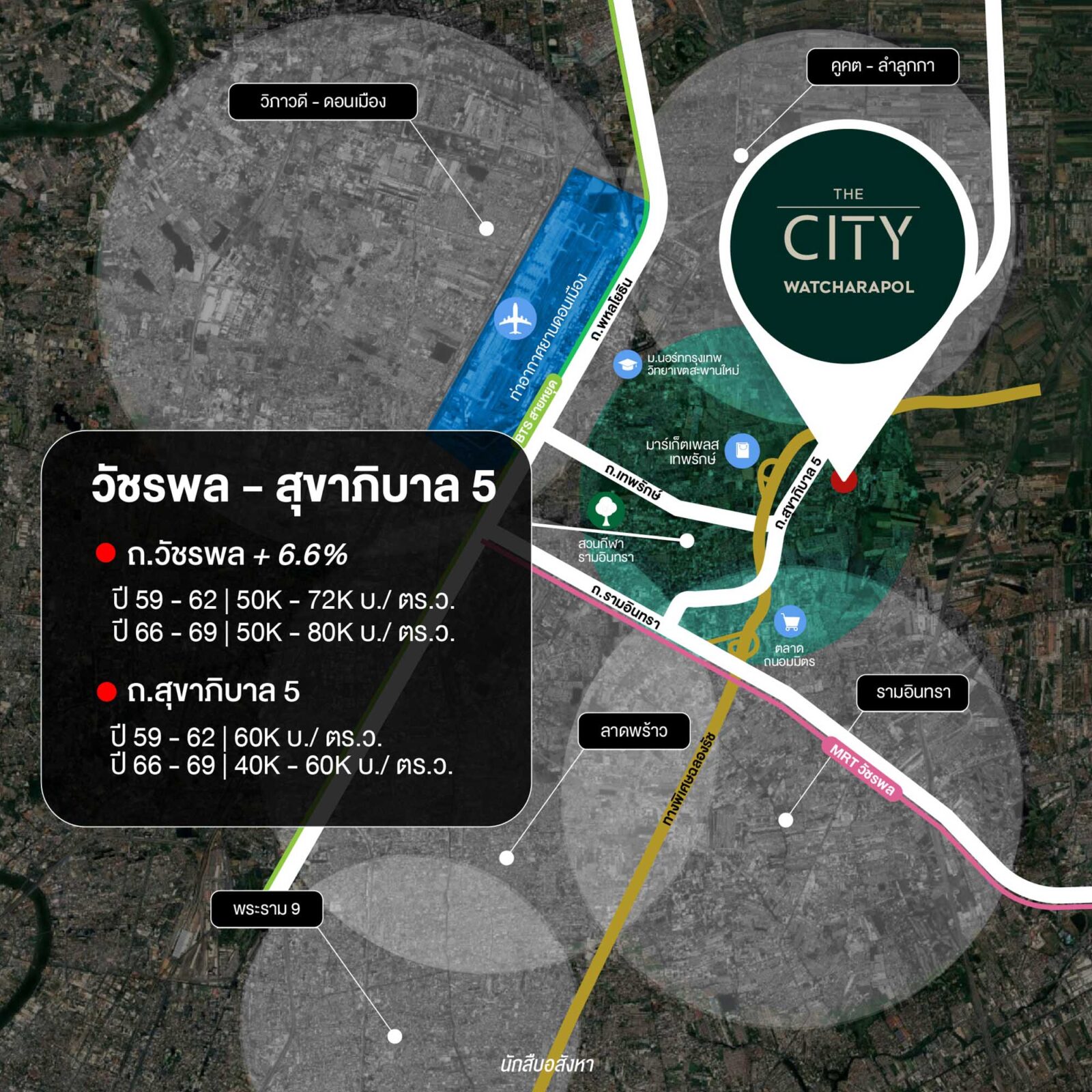 คราวนี้เรามาดูตำแหน่งที่ตั้งโครงการกันบ้าง THE CITY วัชรพล ตั้งอยู่ติด ถ.สุขาภิบาล 5 ใกล้ทางด่วนเฉลิมมหานคร ด่านสุขาภิบาล 5 เพียง 1 กม.* เข้าสู่ CBD – พระราม 9 ได้เลย และยังใกล้ ถ.เทพรักษ์ เพียง 2 นาที* ซึ่งสามารถเชื่อมไปออก ถ.พหลโยธิน – ถ.วิภาวดีรังสิต วิ่งตรงเข้าย่านบางเขน ลาดพร้าว ได้เช่นกัน เส้นนี้จะมีรถไฟฟ้าสายสีเขียว (สุขุมวิท) ต่อเดียวเข้าใจกลางเมืองได้เลย หรือจะเชื่อมไปยังสนามบินดอนเมือง เส้นทางนี้ก็สามารถไปได้เช่นกันครับ หรือหากใครจะไปโซนรามอินทราก็ใช้เส้นสุขาภิบาล 5 ลัดเลาะไปออกซ.รามอินทรา 65 ได้ครับ เส้นนี้ก็เชื่อมกับรถไฟฟ้าสายสีชมพู