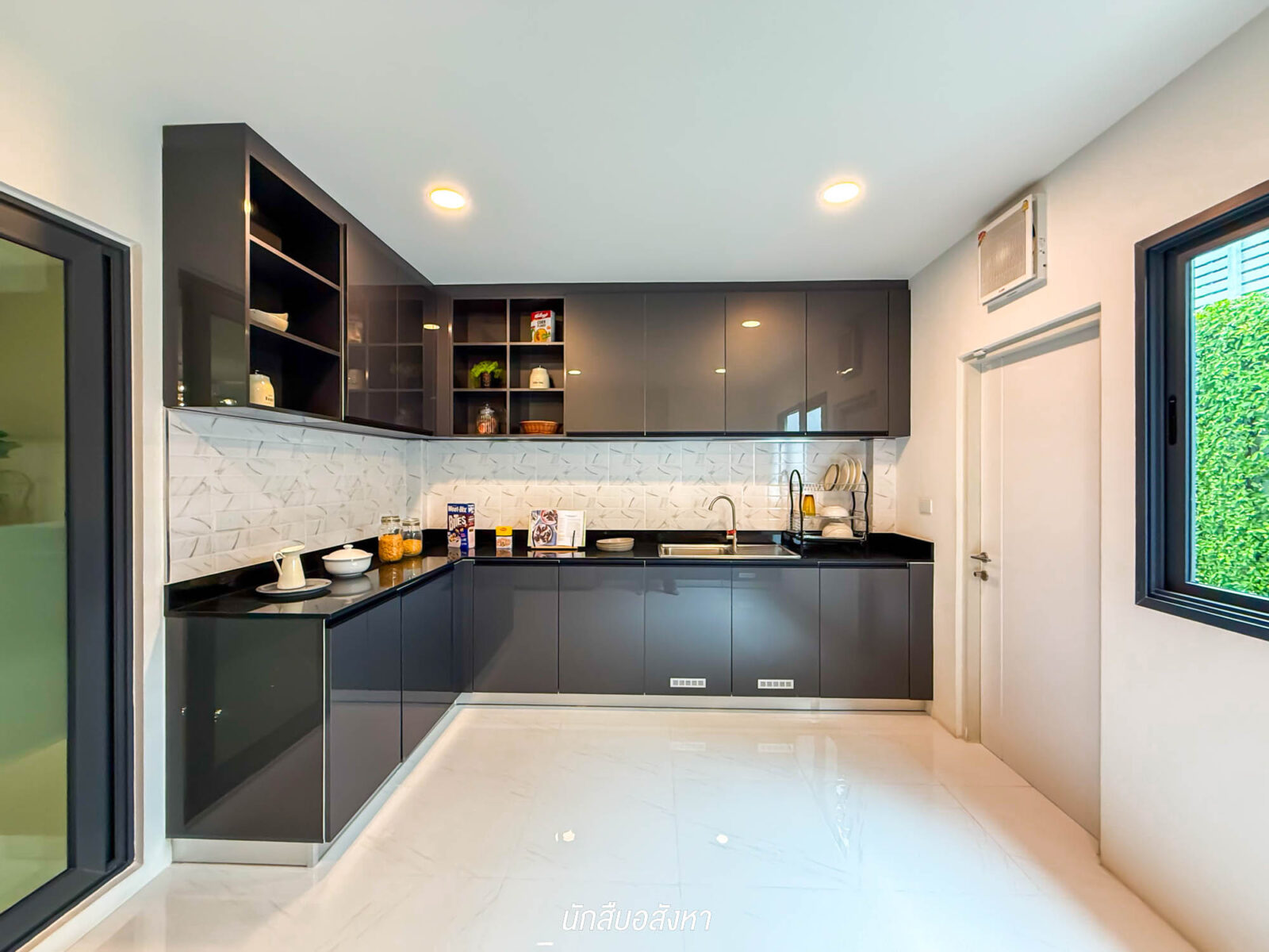 ถัดมาฝั่งซ้ายมือหรือบริเวณกลางบ้าน จะเป็นส่วนของห้องครัว โครงการให้พื้นที่มาค่อนข้างเยอะ เป็นครัวที่สามารถใช้งานได้จริง หากกังวลเรื่องกลิ่นอาจจะกั้นประตูห้องเพิ่ม แต่แนะนำให้กั้นด้วยกระจกบานเลื่อน เพื่อให้ภายในบ้านไม่อึดอัดจนเกินไป