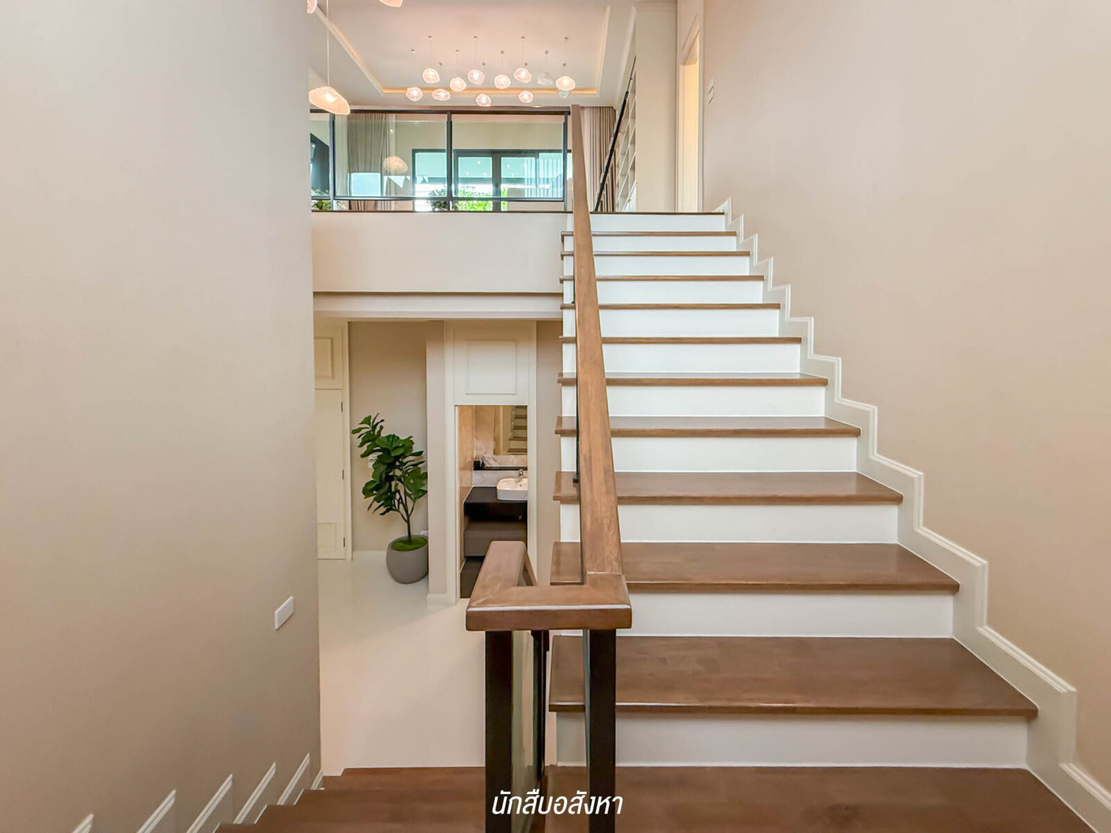 บริเวณบันได โครงสร้างคอนกรีตเสริมเหล็ก ปูพื้นปิดผิวลูกตั้ง และลูกนอนด้วยไม้ยางพาราอัดประสาน และมีราวจับให้ตลอดแนว + บริเวณผนังมีช่องแสงด้วย ทำให้ตนกลางวันแทบไม่ต้องเปิดไฟเลย