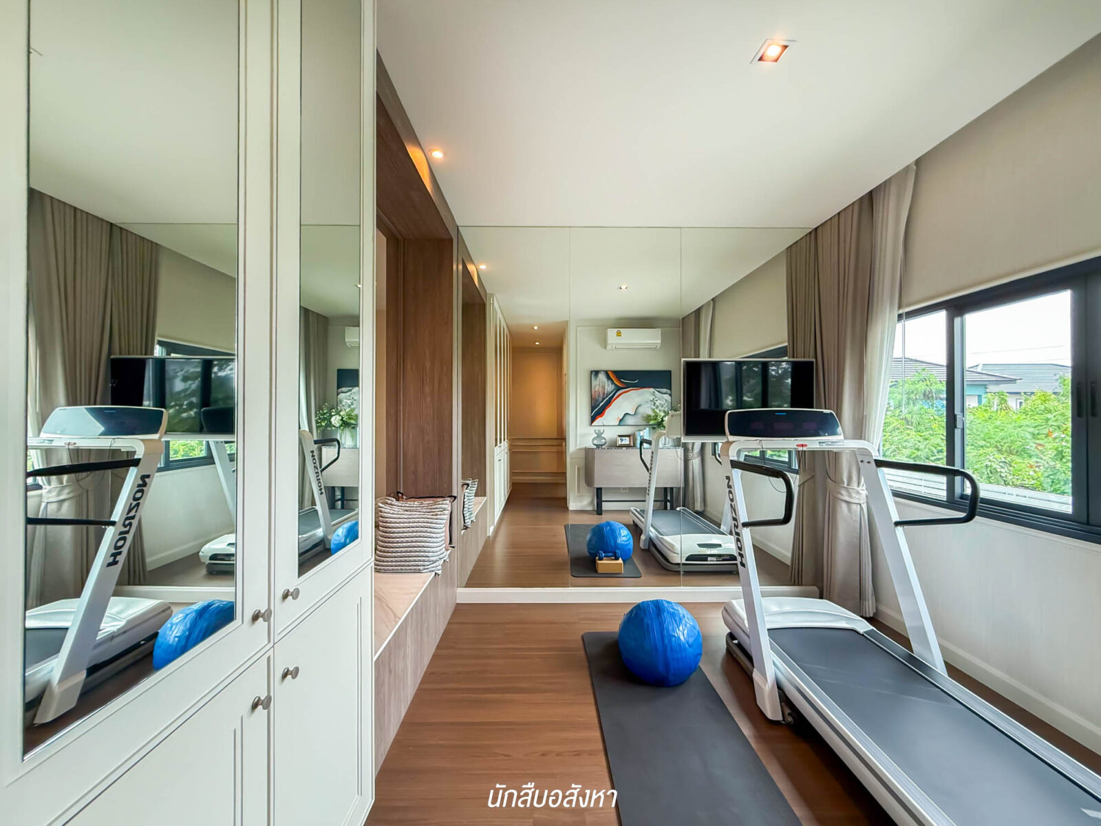 ห้องนอนที่ 4 พิเศษหน่อย อยู่ด้านหลังบ้าน โครงการดีไซน์ให้เป็นห้อง Fitness กว้างกำลังพอดี ใครสมาชิกไม่เยอะมาก สามารถนำไปประกอบเป็นไอเดียได้ครับ และไม่ต้องกังวลว่าอยู่หลังบ้านแสงจะน้อย โครงการเข้าดีไซน์หน้าต่างบ้านใหญ่มาให้ด้วย รับแสงธรรมชาติได้แบบเต็ม ๆ