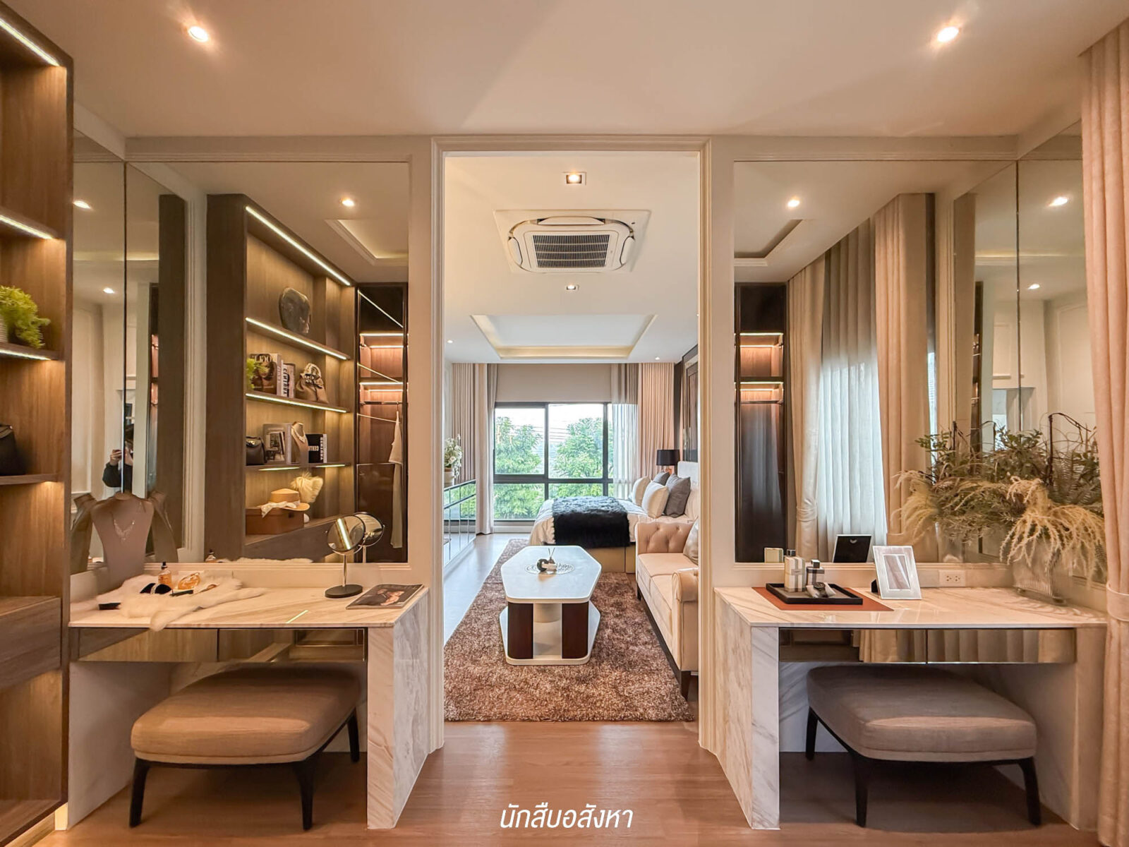 ถัดมาด้านในสุดของห้องจะเป็น Walk-in Closet กว้าง สามารถ Built – in ตู้เสื้อผ้าได้ทั้ง 2 ฝั่ง โดยที่ยังมีพื้นที่เหลือ สำหรับทำเป็นโต๊ะเครื่องแป้ง มาพร้อม Master Bathroom ขนาดใหญ่ ถูกจัดแบ่งการใช้งานเป็นสัดส่วน แยกส่วนเปียกและส่วนแห้ง มีอุปกรณ์