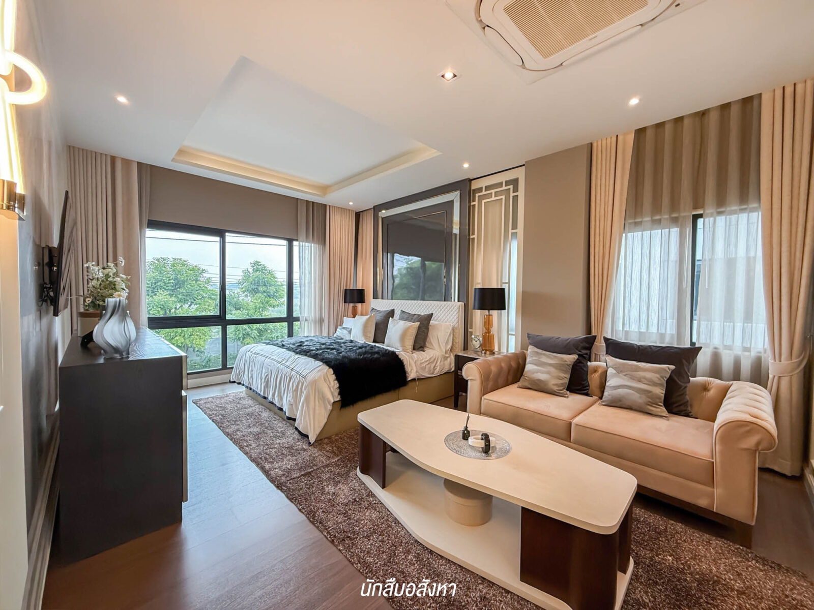 เริ่มที่ห้องแรก Master Bedroom จะอยู่อีกฝั่งหนึ่งของตัวบ้าน ขนาดกว้างขวาง สามารถวางเตียง King Size ได้ มีพื้นที่เหลือใช้งานรอบ ๆ เตียงได้สะดวก จะจัดเป็นมุมพักผ่อนส่วนตัวเพิ่ม เหมือนกันกับบ้านตัวอย่าง จัดโซฟาพักผ่อนไว้ให้เป็นไอเดีย