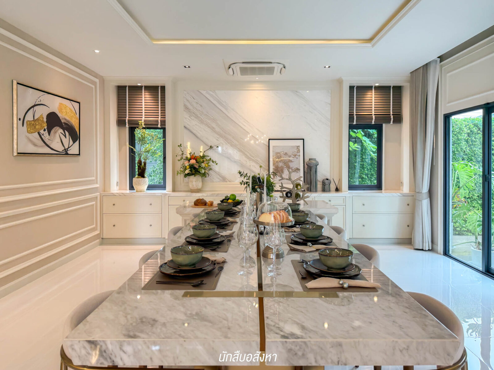 ติดกันเลยจะเป็นพื้นที่รับประทานอาหารของบ้าน ขนาดกว้างกำลังพอดี สามารถวางโต๊ะรับประทานอาหา ขนาด 8 – 10 ที่นั่งได้สบาย ๆ พร้อมทั้งยังมีพื้นที่โดยรอบให้เดินได้สะดวก ส่วนด้านข้างมีประตูหน้าต่างบานเลื่อนขนาดใหญ่