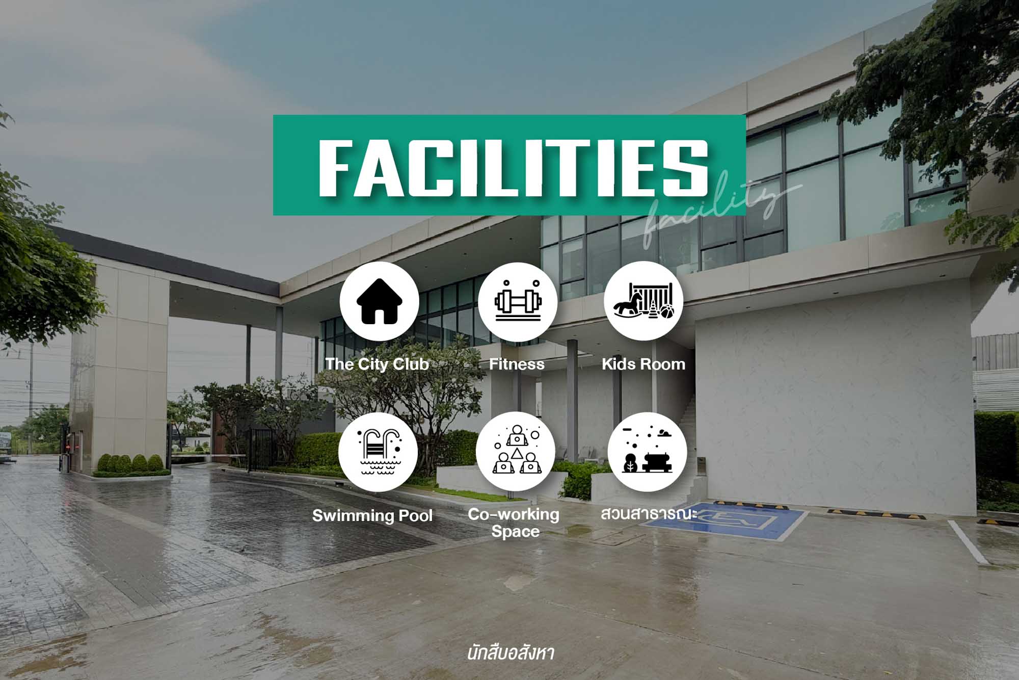 มาดูพื้นที่ส่วนกลางกันบ้าง โครงการจัดมาให้ครบทุกฟังก์ชันที่เป็นพื้นฐาน ไม่ว่าจะเป็น คลับเฮาส์, สระว่ายน้ำ, Fitness, Co-Working Space และยังมีพื้นที่สีเขียว
