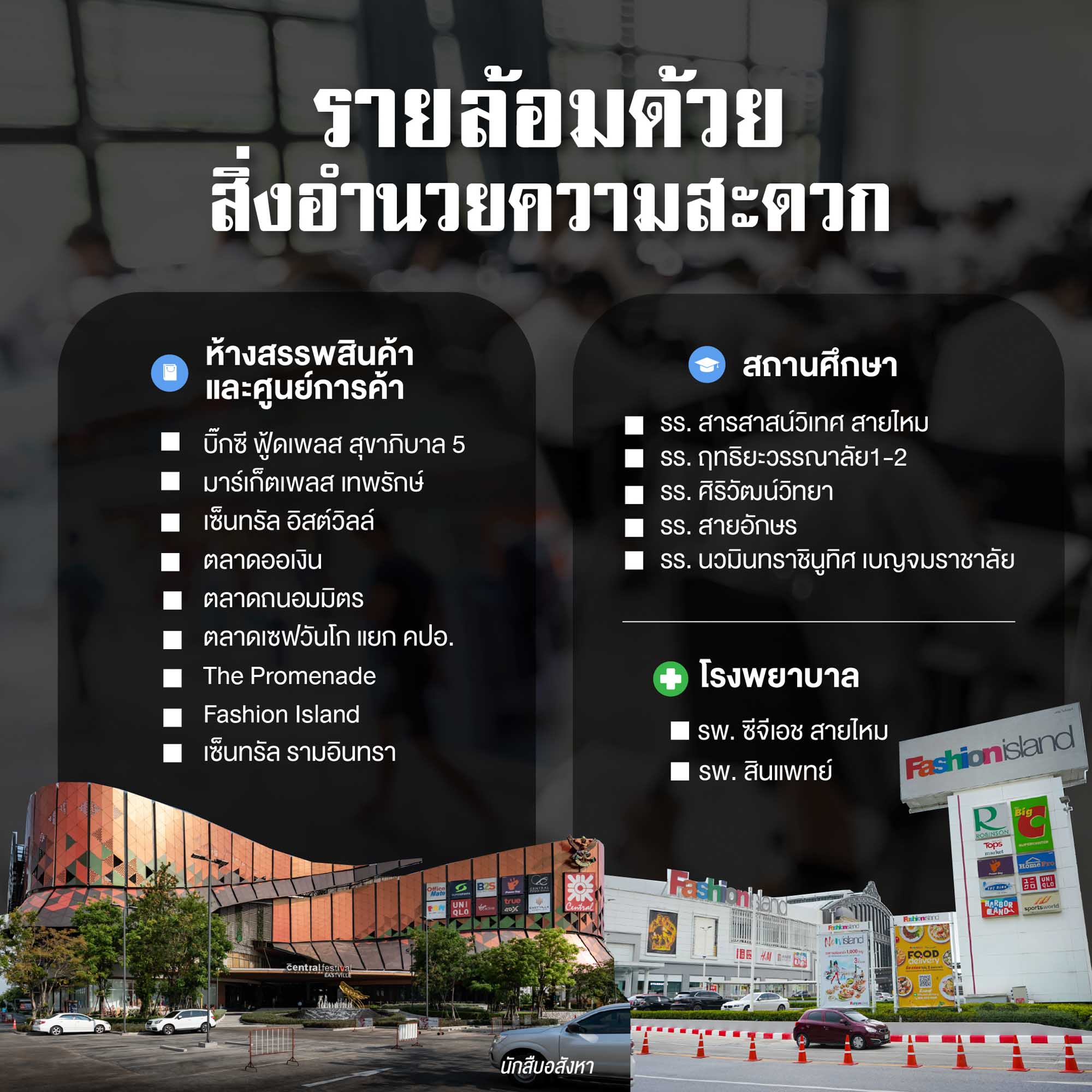 ส่วนห้างสรระพสินค้าขนาดใหญ่ จะอยู่ในระยะที่ห่างออกไปหน่อย ต้องอาศัยรถส่วนตัวในการเดินทาง ใกล้สุดจะเป็นโซนรามอินทรา แถวนั้นจะเป็นย่านที่อาศัย + เป็นโซนที่กำลังขยายตัวจากการเข้ามาของรถไฟฟ้า มีทั้ง The Promenade, Fashion Island, Central รามอินทรา และ Central Festival East Ville เป็นต้น
