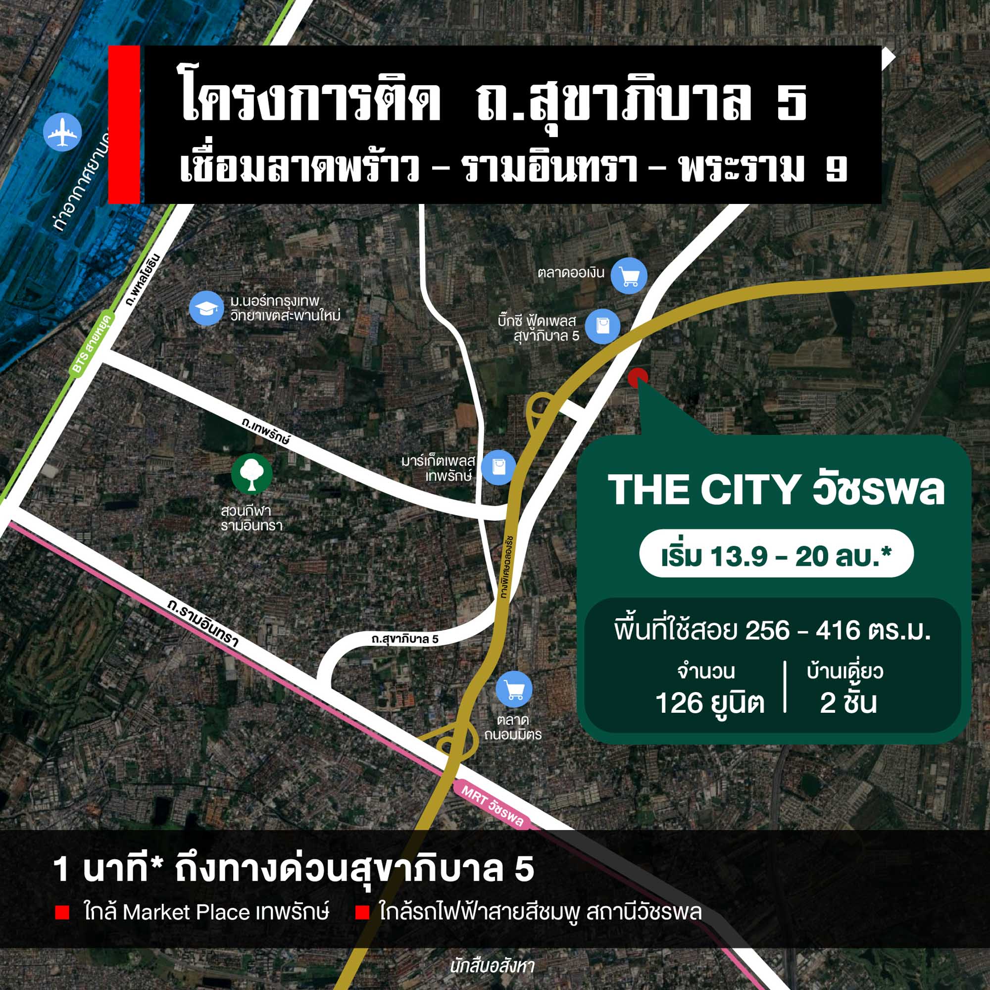 คราวนี้เรามาดูตำแหน่งที่ตั้งโครงการกันบ้าง THE CITY วัชรพล ตั้งอยู่ติด ถ.สุขาภิบาล 5 ใกล้ทางด่วนเฉลิมมหานคร ด่านสุขาภิบาล 5 เพียง 1 กม.* เข้าสู่ CBD – พระราม 9 ได้เลย และยังใกล้ ถ.เทพรักษ์ เพียง 2 นาที* ซึ่งสามารถเชื่อมไปออก ถ.พหลโยธิน – ถ.วิภาวดีรังสิต วิ่งตรงเข้าย่านบางเขน ลาดพร้าว ได้เช่นกัน เส้นนี้จะมีรถไฟฟ้าสายสีเขียว (สุขุมวิท) ต่อเดียวเข้าใจกลางเมืองได้เลย หรือจะเชื่อมไปยังสนามบินดอนเมือง เส้นทางนี้ก็สามารถไปได้เช่นกันครับ หรือหากใครจะไปโซนรามอินทราก็ใช้เส้นสุขาภิบาล 5 ลัดเลาะไปออกซ.รามอินทรา 65 ได้ครับ เส้นนี้ก็เชื่อมกับรถไฟฟ้าสายสีชมพู
