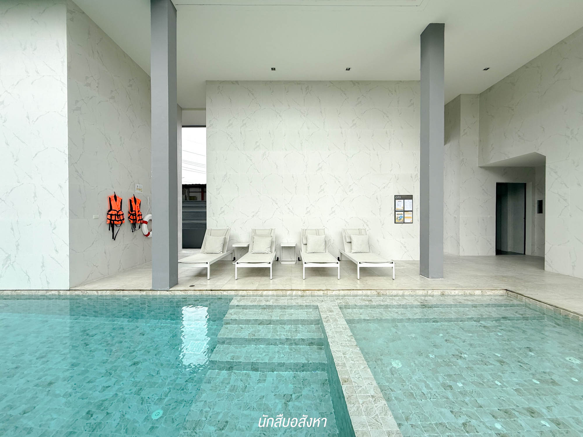ถัดเข้ามาจะเจอกับคลับเฮาส์ 2 ชั้น ซึ่งคลับเฮาส์ออกแบบให้เป็นส่วนหนึ่งของซุ้มประตูด้วย ทางเข้าจะมีทางลาดสำหรับรถเข็นให้เข้าไปใช้งานสะดวกมากขึ้น พอเดินเข้ามาจะเจอกับสระว่ายน้ำ ระบบเกลือ แยกสระเด็กและสระผู้ใหญ่ไว้ชัดเจน บริเวณสระว่ายน้ำจะมีกำแพงและแนวต้นไม้กั้นจากสายตาคนภายนอก เพิ่มความเป็นส่วนตัว และให้ความร่มรื่นได้เป็นอย่างดี