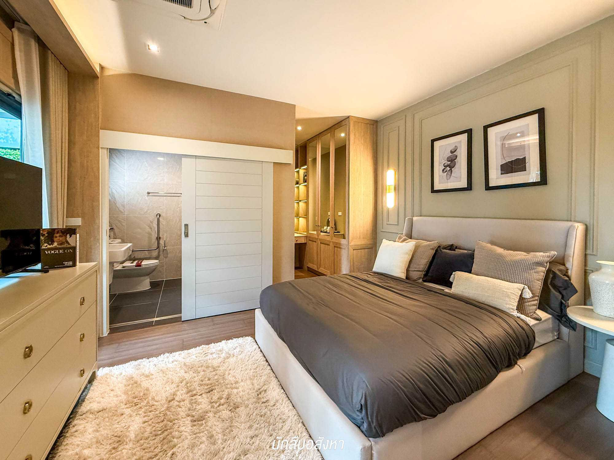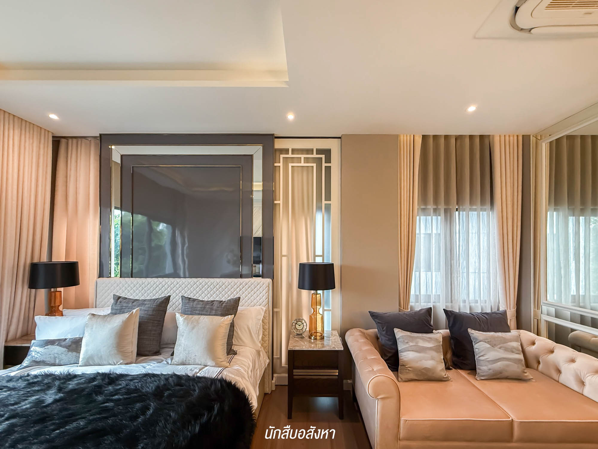 เริ่มที่ห้องแรก Master Bedroom จะอยู่อีกฝั่งหนึ่งของตัวบ้าน ขนาดกว้างขวาง สามารถวางเตียง King Size ได้ มีพื้นที่เหลือใช้งานรอบ ๆ เตียงได้สะดวก จะจัดเป็นมุมพักผ่อนส่วนตัวเพิ่ม เหมือนกันกับบ้านตัวอย่าง จัดโซฟาพักผ่อนไว้ให้เป็นไอเดีย