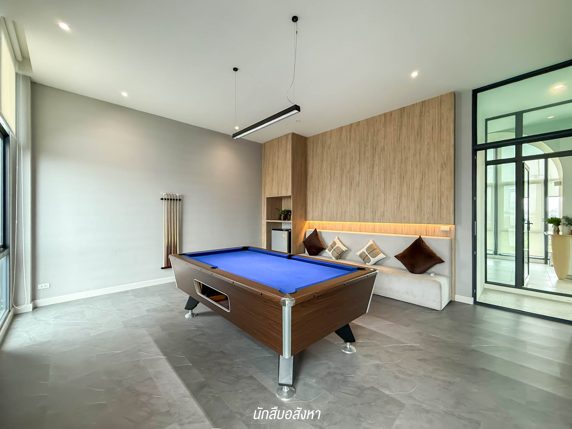 มีประตูเชื่อมต่อกับหลังบ้าน ซึ่งจะต่อเติมครัวก็ได้เช่นกัน เพราะโครงการลงเสาเข็มไว้ให้เรียบร้อยแล้ว ส่วนวัสดุที่ใช้ พื้นปูด้วยกระเบื้องแกรนิตโต้ และติดไฟแบบดาวส์ไลท์ มีความสูงจากพื้นถึงฝ้า อยู่ที่ 2.6 เมตร