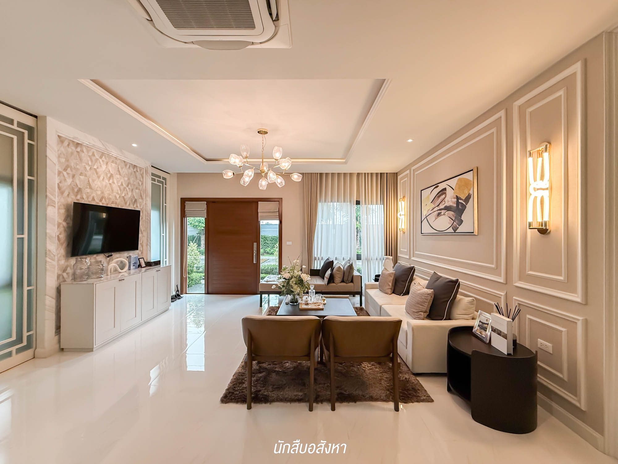 เมื่อเข้ามาภายในบ้าน ลริเวณชั้น 1 ถูกดีไซน์พื้นที่ทั้งชั้นให้เป็น Connecting Space เชื่อมต่อตั้งแต่ พื้นที่รับแขก – พื้นที่รับประทานอาหาร – พื้นที่พักผ่อน และโซนแรกที่เจอ จะเป็นพื้นที่รับแขก ถูกจัดให้อยู่ด้านหน้าสุดของตัวบ้าน พื้นที่ค่อนข้างกว้าง ระยะดูทีวีมีความห่างกำลังพอดี วางทีวีขนาดใหญ่ได้