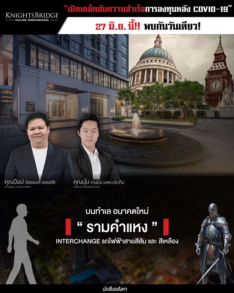 เชื่อว่าหลายคนได้รับผลกระทบจากสถานการณ์การแพร่ระบาดของ COVID – 19 กันแน่นอนครับ โดยเฉพาะกลุ่มของนักลงทุนที่เรียกได้ว่าได้รับผลกระทบเข้าเต็มๆ ซึ่งในวันที่ 27 มิ.ย. นี้ พบกันวันเดียวเท่านั้นครับกับงานฟรี Exclusive Talk ความรู้เรื่องการลงทุนในอสังหาฯ โดย 2 ผู้เชี่ยวชาญตัวจริงที่จะมา “เปิดเคล็ดลับความสำเร็จการลงทุนหลัง COVID-19” บนทำเล อนาคตใหม่ “รามคำแหง” Interchange รถไฟฟ้าสายสีส้มและสีเหลือง