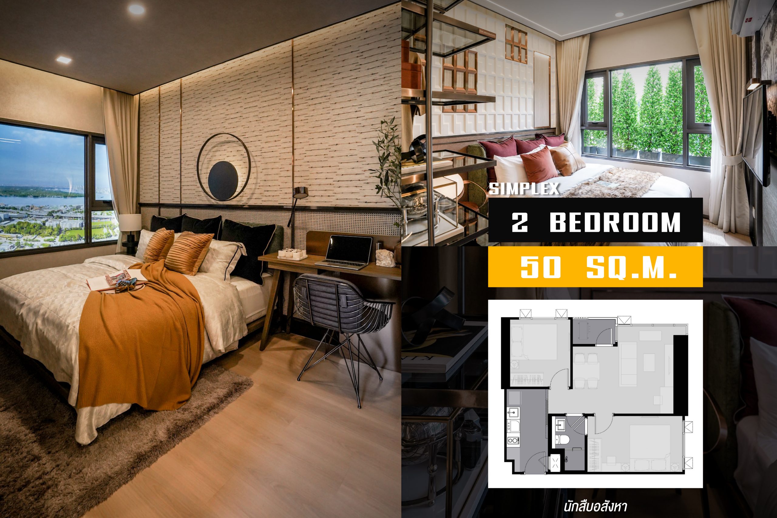 ในส่วนของห้อง SIMPLEX แบบ 2 Bedrooms ขนาดพื้นที่ใช้สอย 50 ตร.ม. จะประกอบไปด้วย ฟังก์ชัน 2 ห้องนอน 1 ห้องน้ำ ซึ่งจะได้รับพื้นที่และห้องนอนที่มากกว่า รองรับสมาชิกได้มากกว่า ไม่สร้างความอึดอัด สามารถอยู่ร่วมกันได้อย่างสะดวกสบาย เหมาะสำหรับการอยู่อาศัยทั้งในรูปแบบคู่รักและรูมเมท ซึ่งถ้าหากต้องการความเป็นส่วนตัว ก็สามารถแยกห้องได้ ในขณะเดียวกัน ก็ยังรู้สึกอบอุ่นใจ เนื่องจากในห้อง ยังมีโซนต่าง ๆ ให้ใช้พื้นที่ร่วมกัน อาทิ ห้องนั่งเล่น ห้องครัว และโซนรับประทานอาหาร เป็นต้นครับ