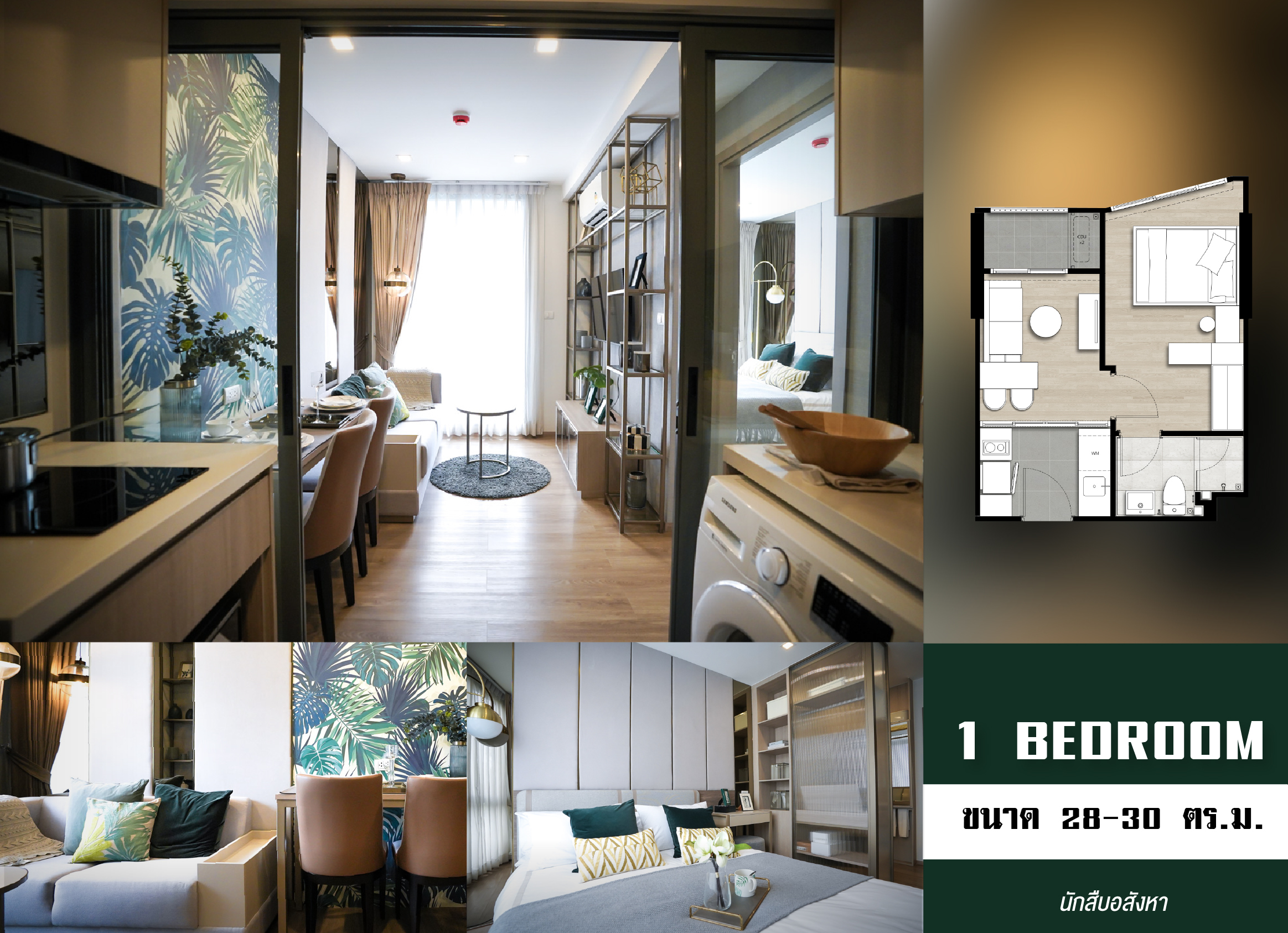 เริ่มต้นด้วย 1 Bedroom ขนาดห้องโดยประมาณ 30 ตร.ม. เมื่อเข้ามาแล้วจะเห็นเลยว่า แปลนห้องถูกจัดสรรพื้นที่แยกโซนต่าง ๆ ไว้เป็นสัดส่วนทั้งหมด เริ่มต้นด้วยครัวปิดที่อยู่บริเวณทางเข้า กั้นด้วยประตูกระจกบานเลื่อนเชื่อมต่อโซนห้องนั่งเล่นและระเบียงห้อง ส่วนทางด้านขวาจะเป็นห้องนอนพร้อมห้องน้ำในตัว