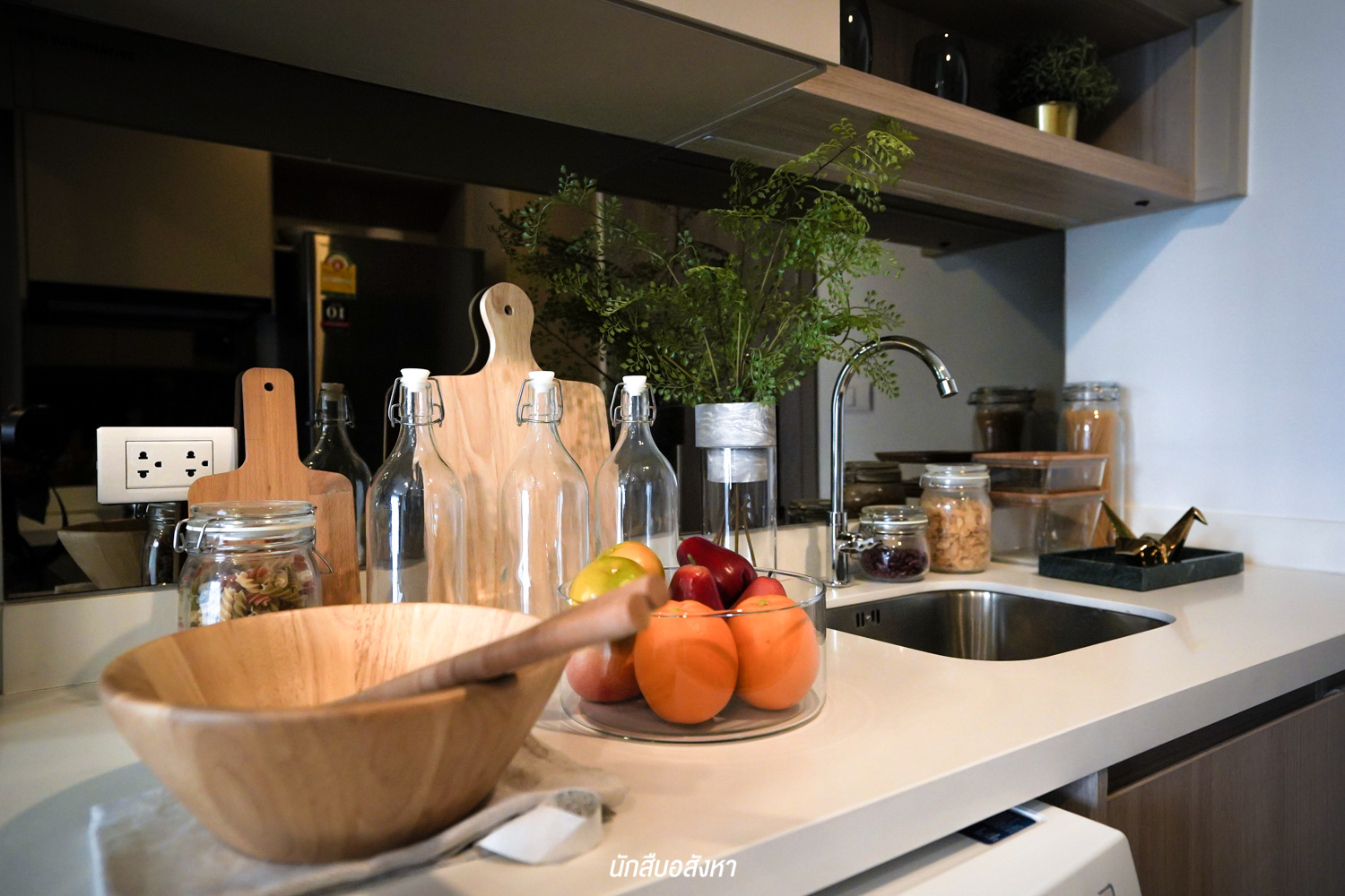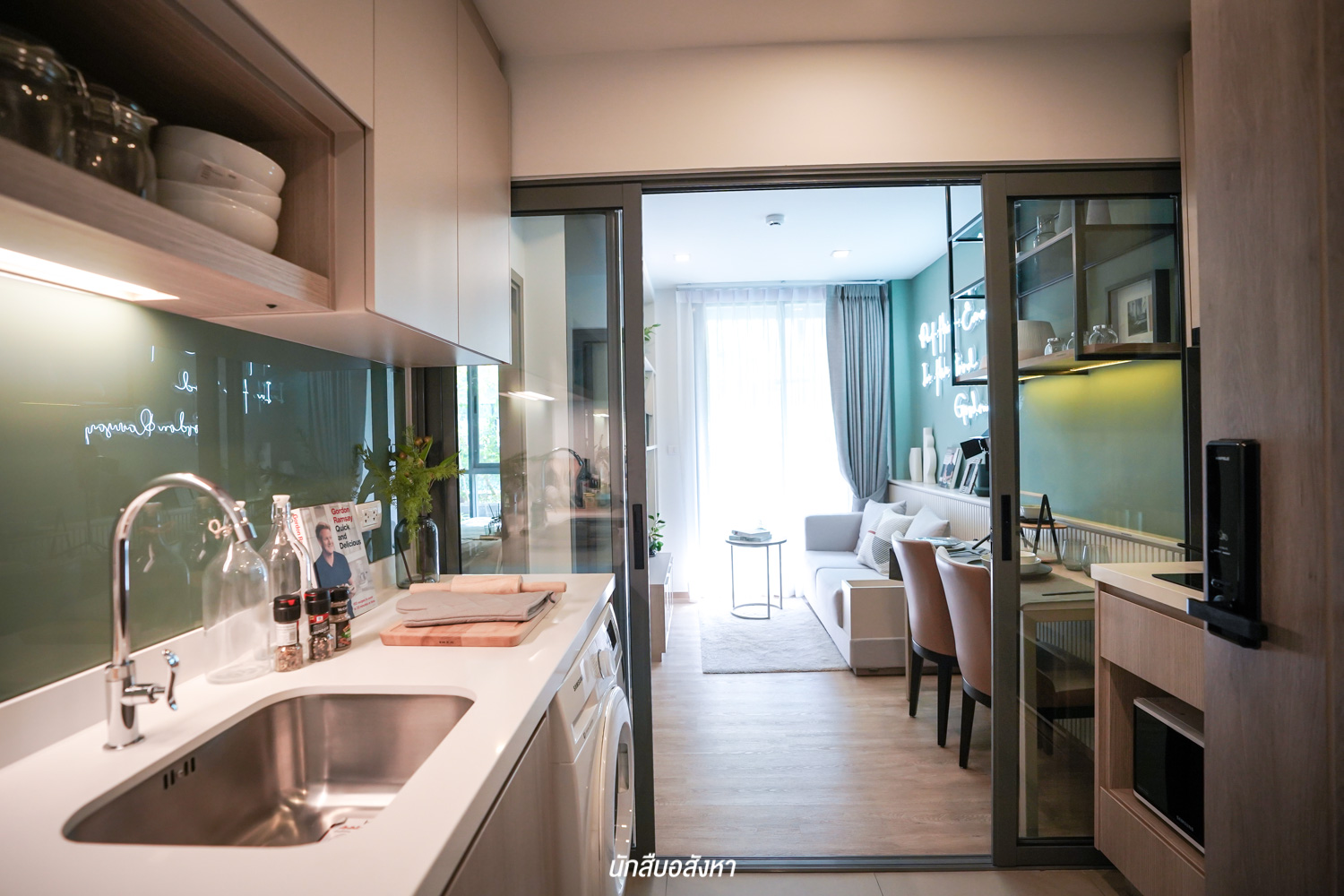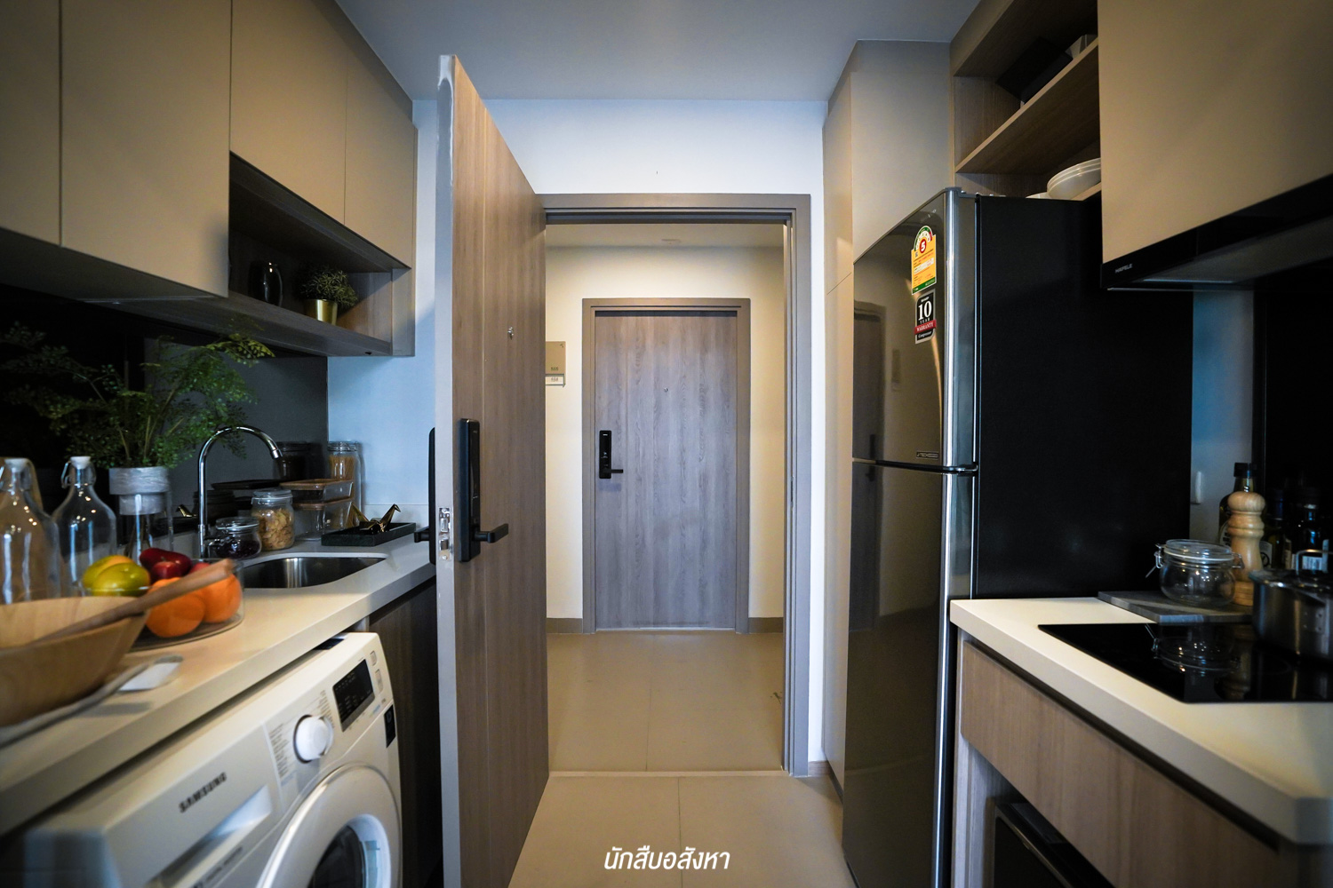 ครัวปิดตรงทางเข้าห้อง เป็นไฮไลท์หนึ่งที่ลูกบ้านชอบมากครับ ด้วยไลฟ์สไตล์ชีวิตแบบ New Normal กลับถึงบ้านก็ต้องล้างมือ และวางสิ่งของต่าง ๆ ไว้ก่อนที่จะเข้าไปยังโซนพักผ่อน ซึ่งห้องครัวที่มีประตูปิดกั้นแบบนี้ ตอบโจทย์มาก ๆ