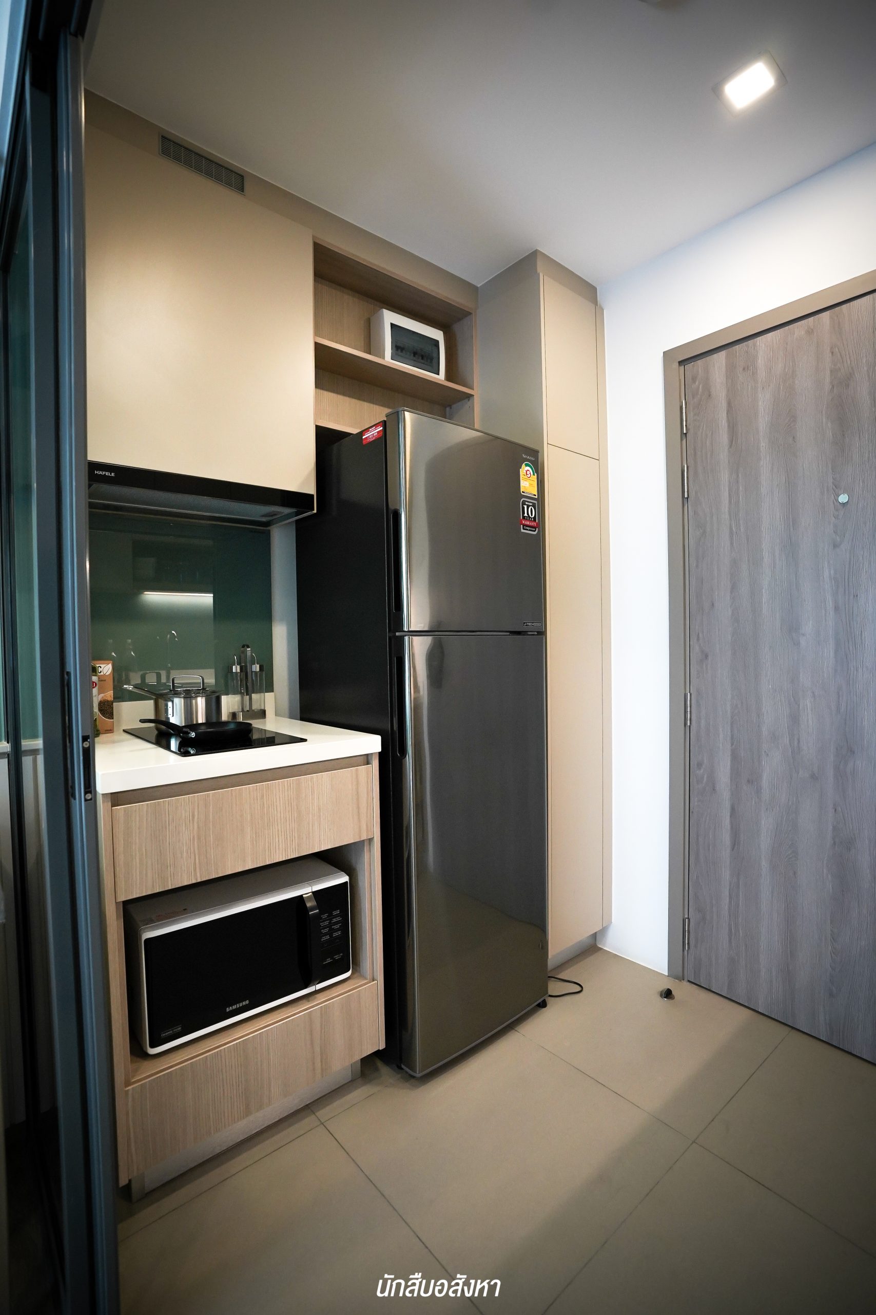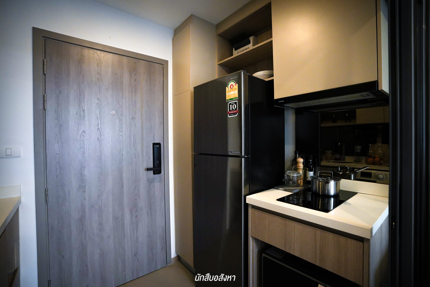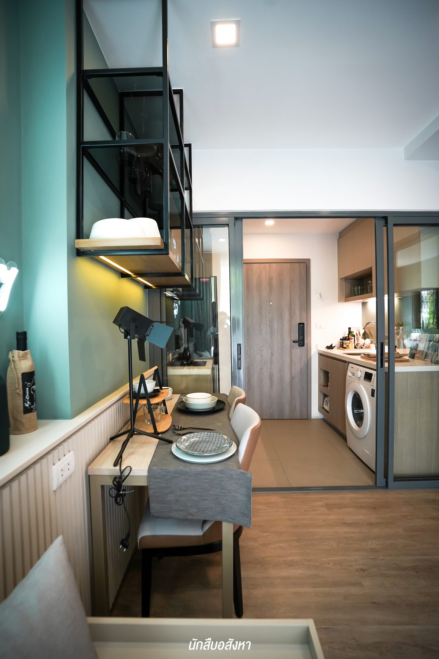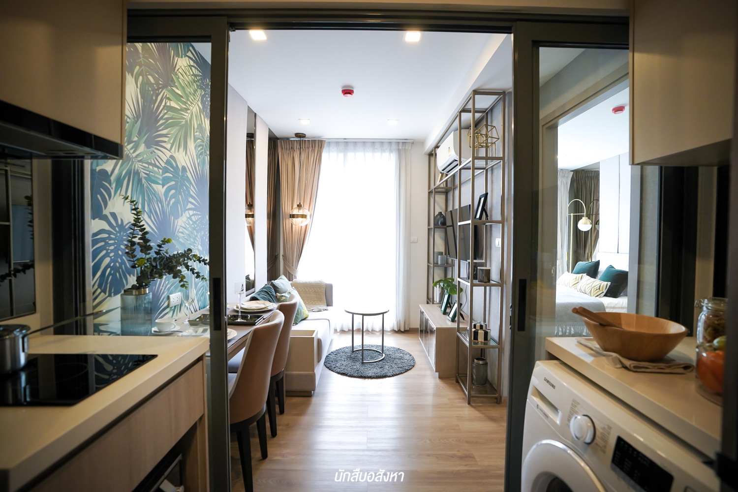 ครัวปิดตรงทางเข้าห้อง เป็นไฮไลท์หนึ่งที่ลูกบ้านชอบมากครับ ด้วยไลฟ์สไตล์ชีวิตแบบ New Normal กลับถึงบ้านก็ต้องล้างมือ และวางสิ่งของต่าง ๆ ไว้ก่อนที่จะเข้าไปยังโซนพักผ่อน ซึ่งห้องครัวที่มีประตูปิดกั้นแบบนี้ ตอบโจทย์มาก ๆ
