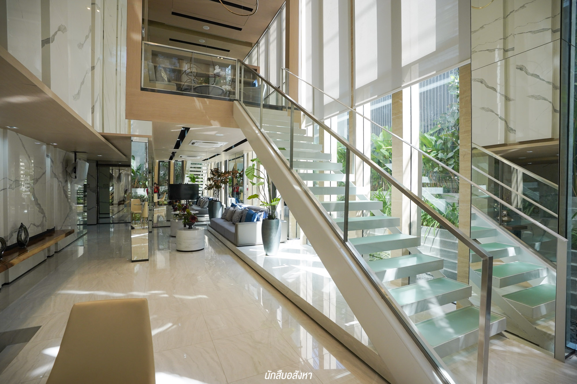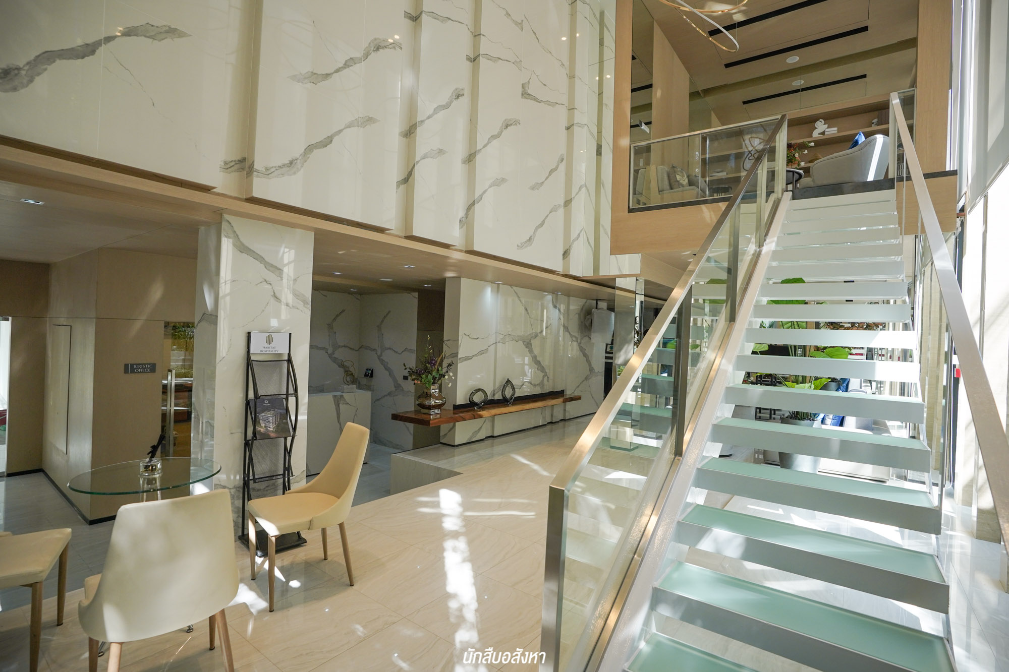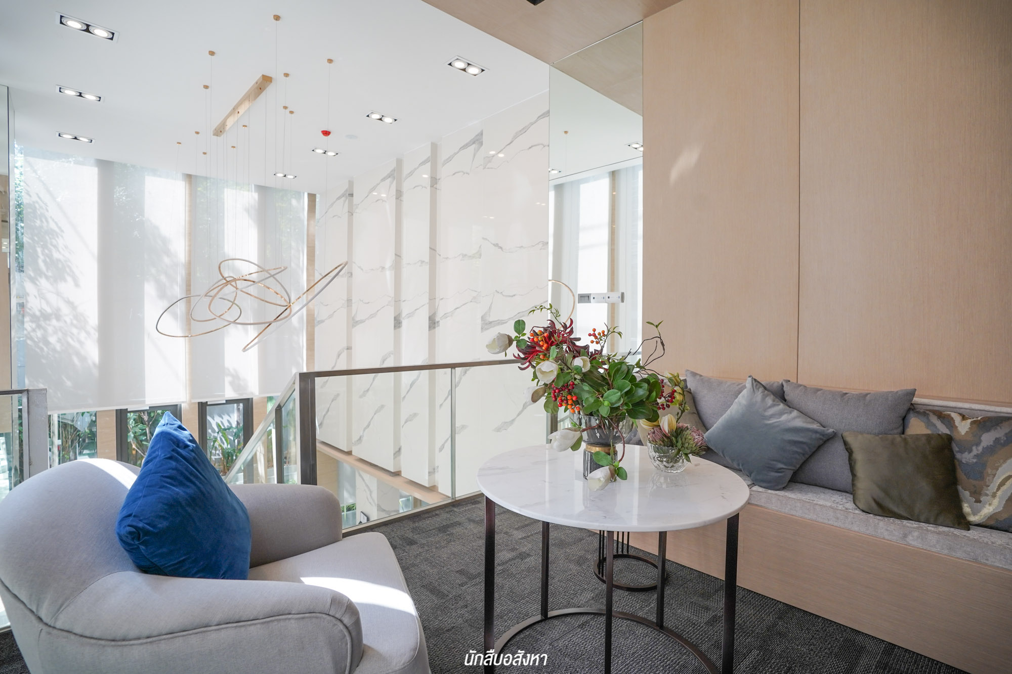 พื้นที่บริเวณ Lobby พร้อมโซฟา สำหรับนั่งเล่นหรือนัดคุยงานบริเวณนี้ครับ และมีกระจกล้อมรอบ ทำให้แสงธรรมชาติส่องเข้ามา ช่วยให้เห็นวิวและพื้นที่สีเขียวโดยรอบ