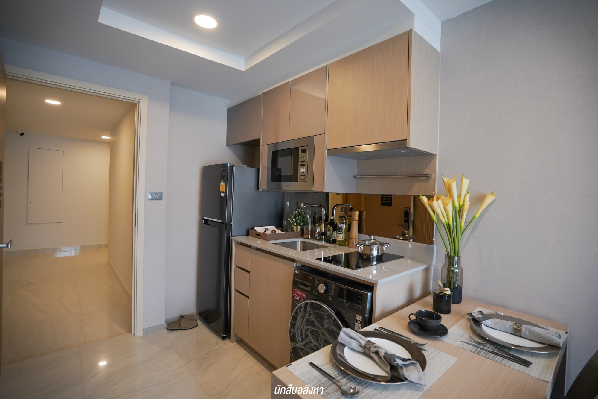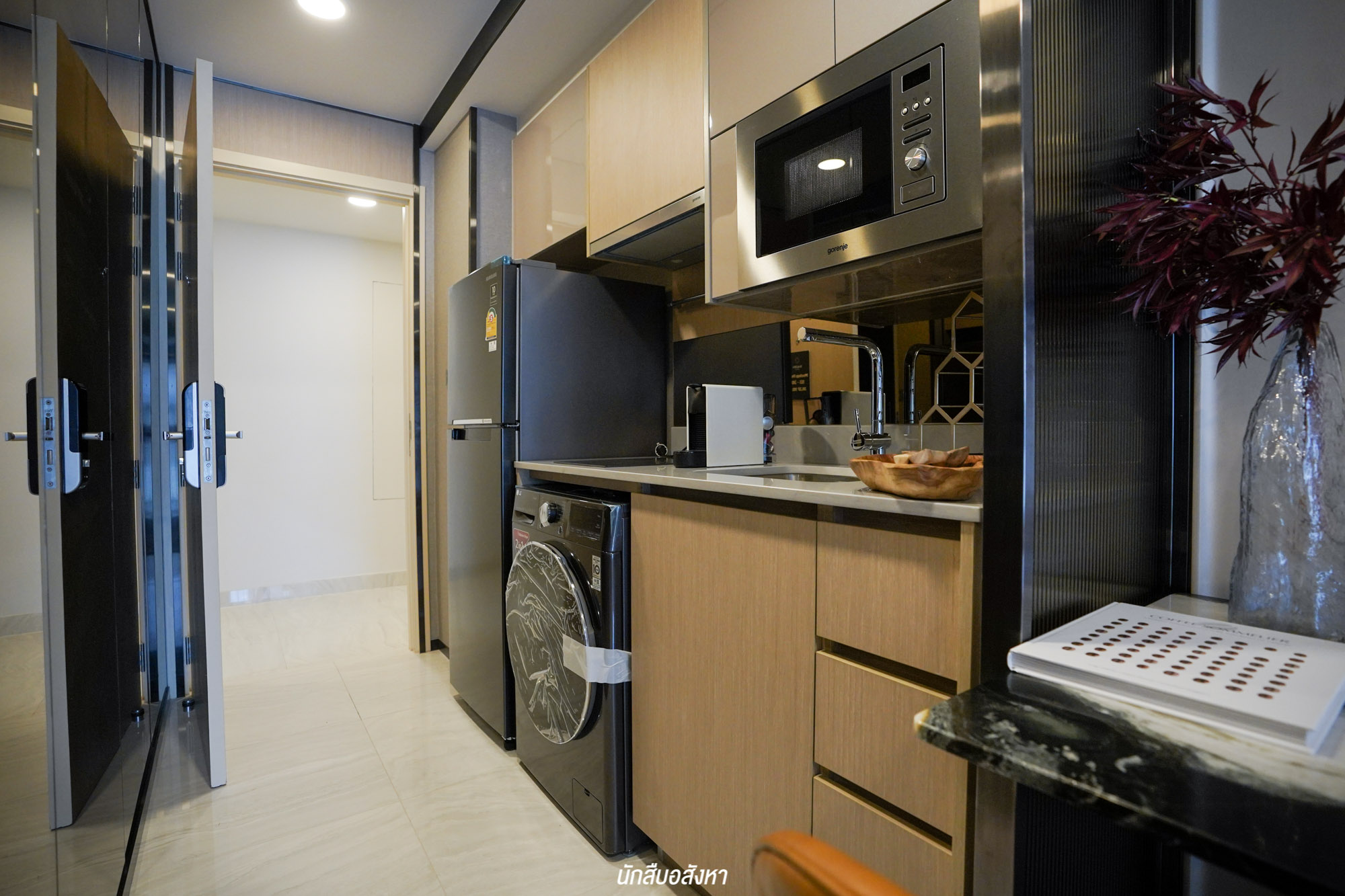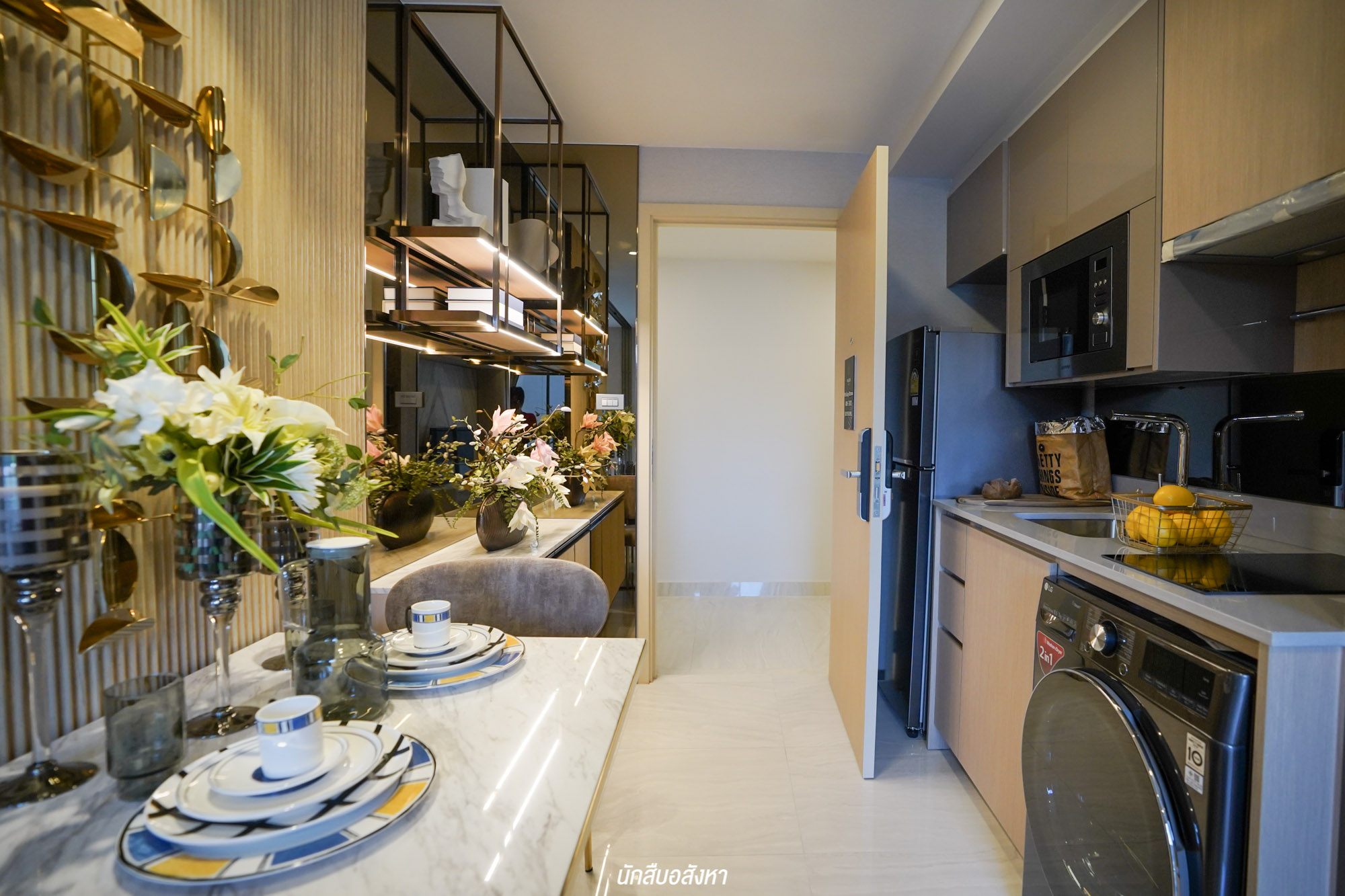เมื่อเข้ามาพบกับพื้นที่ครัวเปิด โดยมีพื้นที่เหลือเดินผ่านใช้งานสะดวก ซึ่งทางโครงการให้เฟอร์นิเจอร์ Built-in เคาน์เตอร์ครัวป็นแนวยาว สามารถวางเตาแบบเซรามิคแบบ 2 หัว และซิงค์ล้างจานแบบ 1 หลุม อีกทั้งยังเหลือพื้นที่ด้านข้างสำหรับวางตู้เย็นได้อีกด้วยครับ