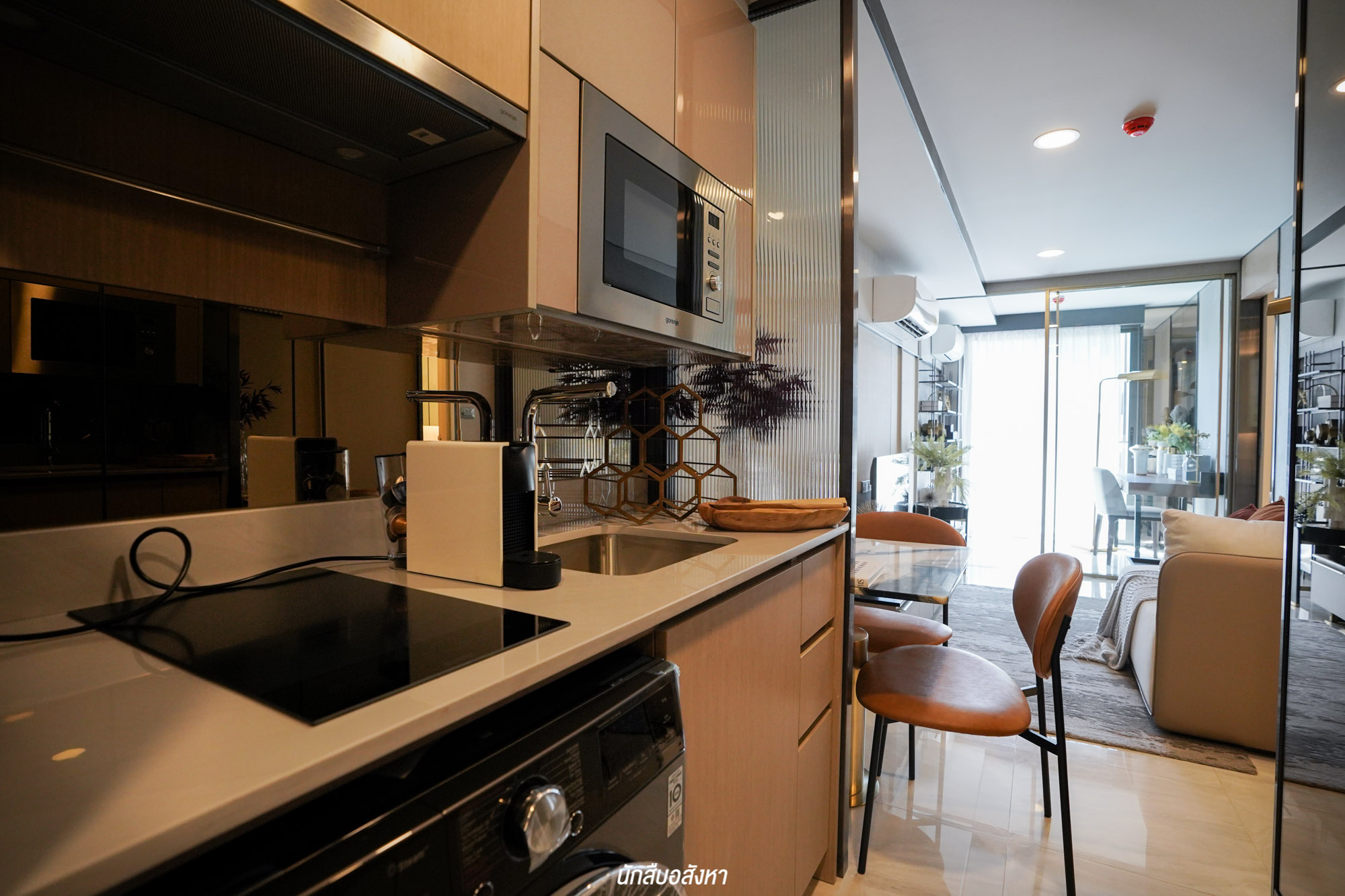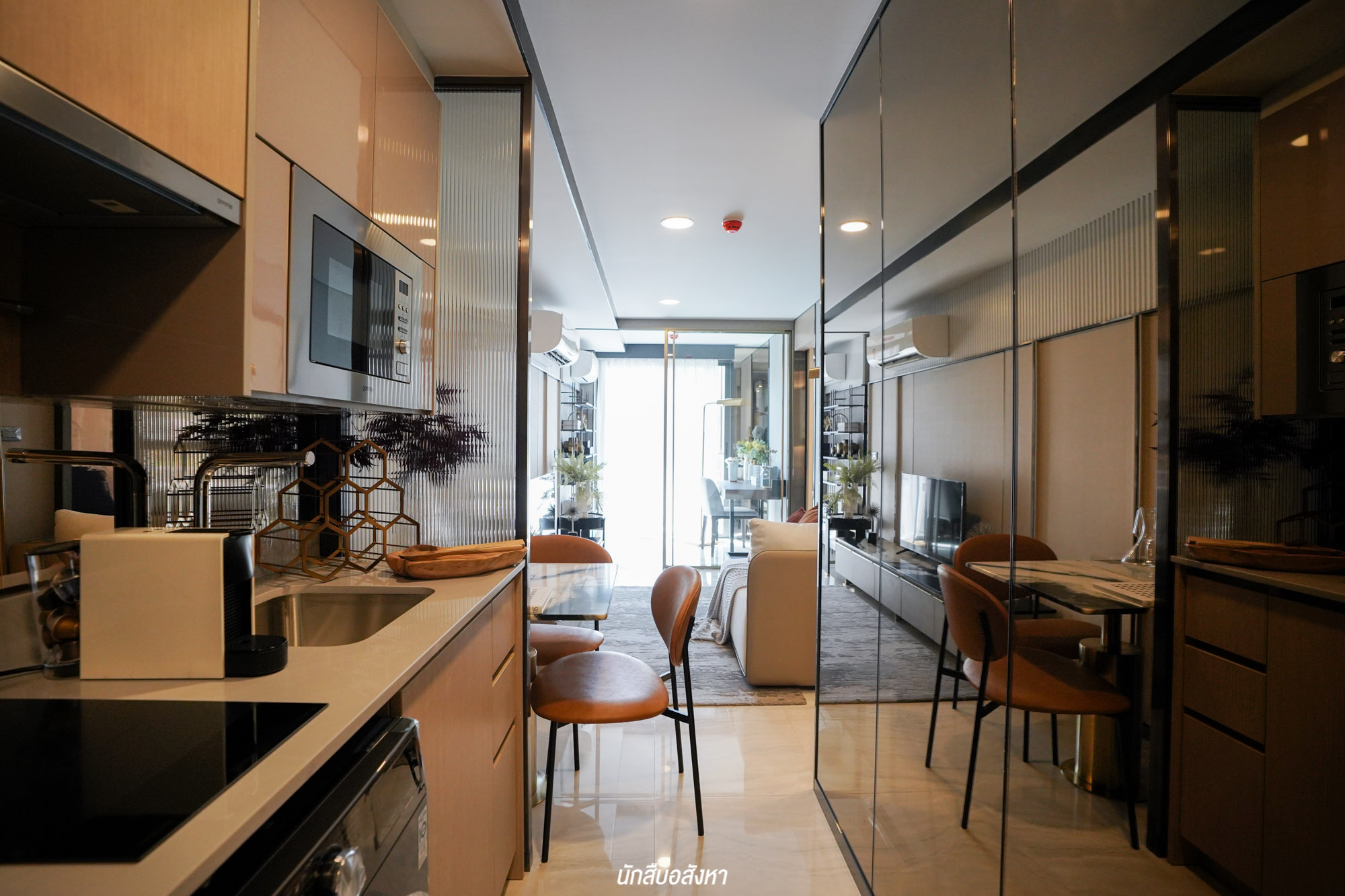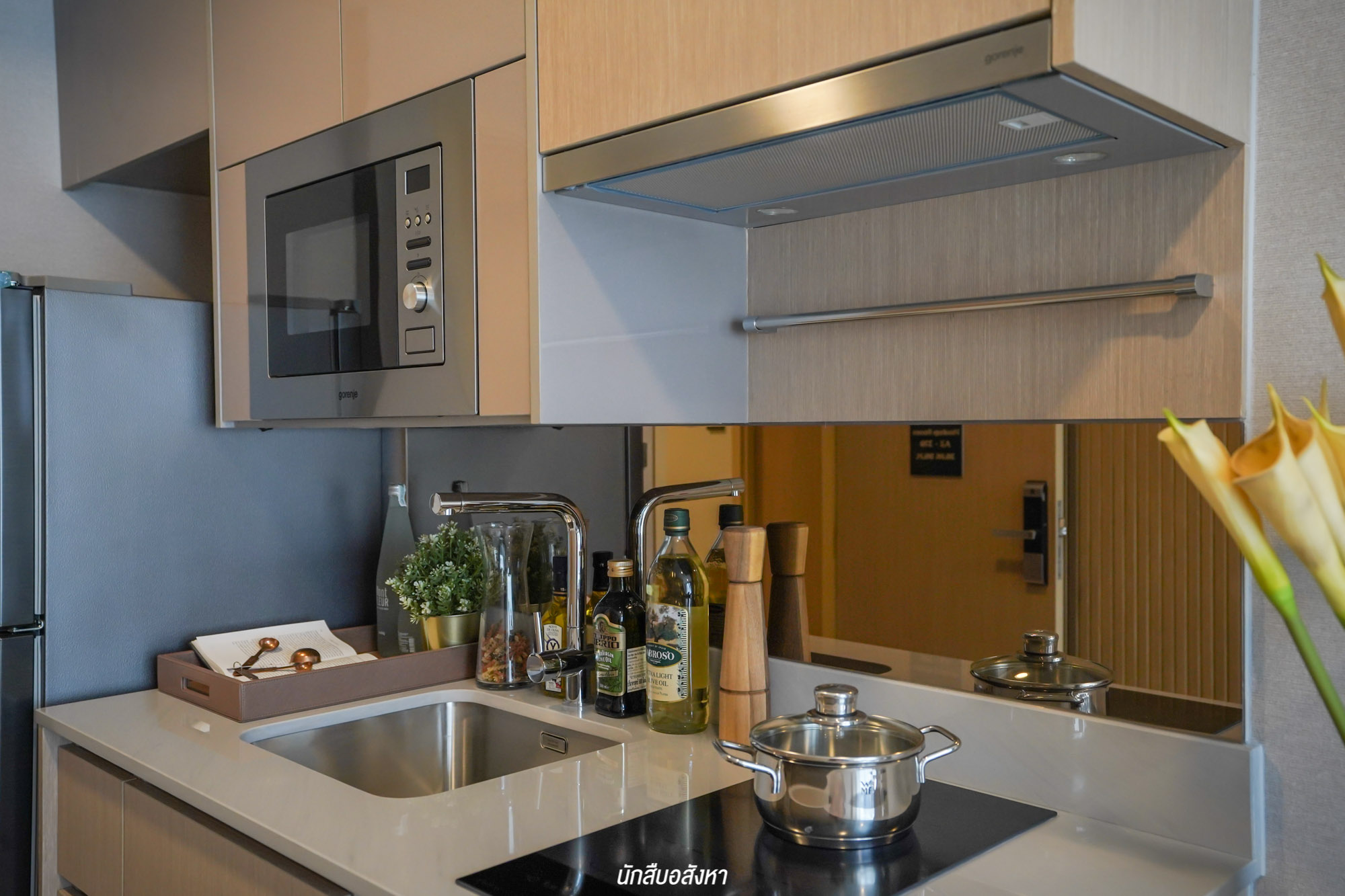 เมื่อเข้ามาพบกับพื้นที่ครัวเปิด โดยมีพื้นที่เหลือเดินผ่านใช้งานสะดวก ซึ่งทางโครงการให้เฟอร์นิเจอร์ Built-in เคาน์เตอร์ครัวป็นแนวยาว สามารถวางเตาแบบเซรามิคแบบ 2 หัว และซิงค์ล้างจานแบบ 1 หลุม อีกทั้งยังเหลือพื้นที่ด้านข้างสำหรับวางตู้เย็นได้อีกด้วยครับ