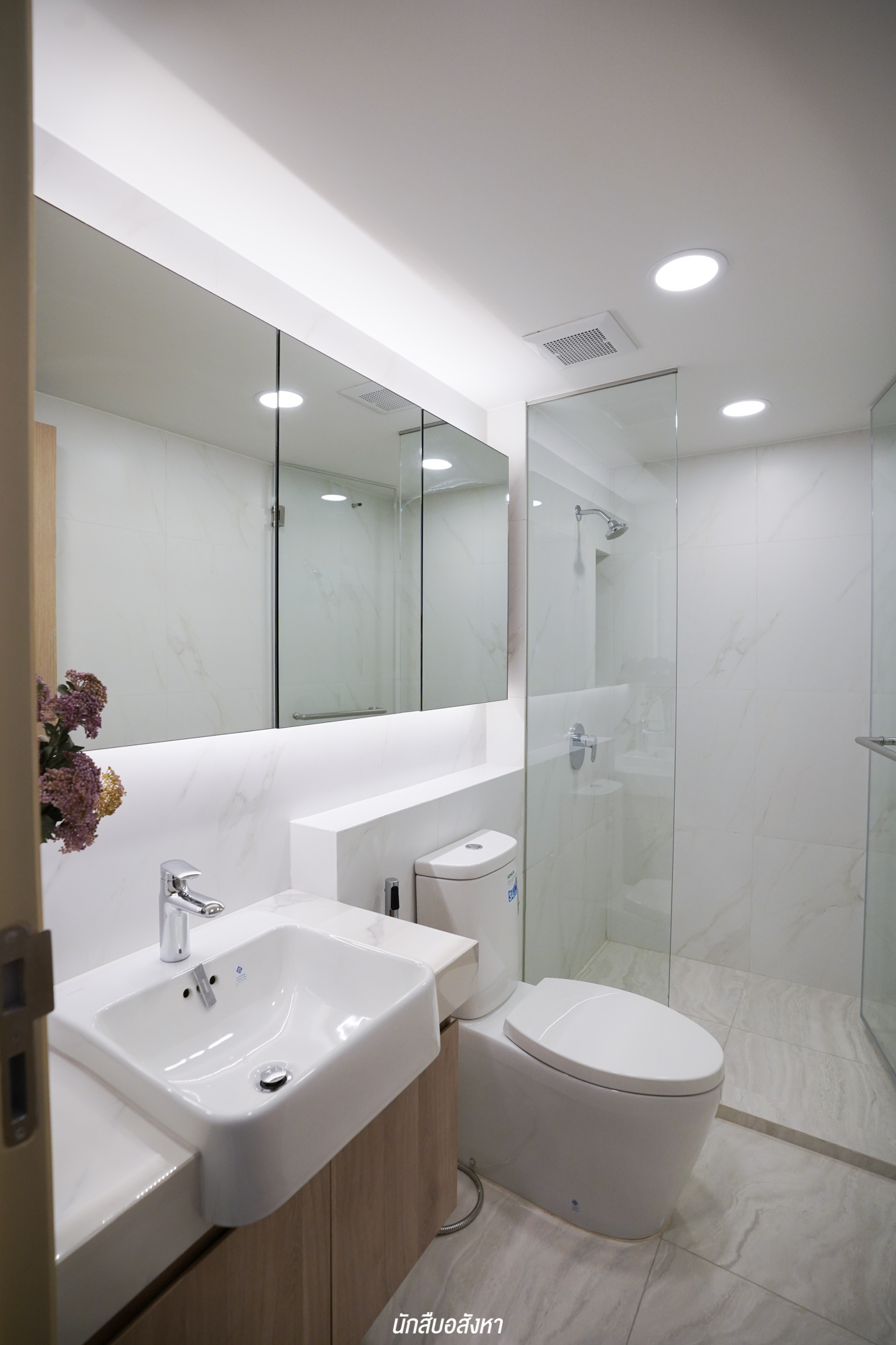 ติดกับโซนนั่งเล่น เป็นห้องน้ำครับ ซึ่งตำแหน่งของห้องน้ำนี้ เมื่อมีแขกมาเยี่ยม สามารถใช้ห้องน้ำนี้ได้เลย เพิ่มความสะดวกและความเป็นส่วนตัว ไม่ต้องผ่านห้องนอนครับ โดยภายในห้องน้ำแยกโซนแห้ง โซนเปียก ด้วยฉากกั้นอย่างเป็นสัดส่วน