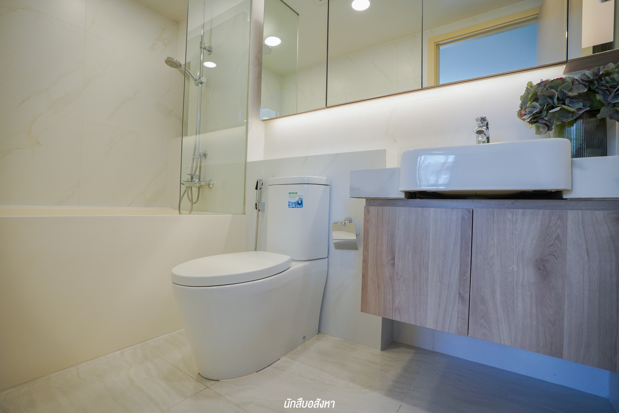 ห้องน้ำอยู่ในห้องนอน ช่วยเพิ่มความสะดวกในการใช้งาน โดยภายในห้องน้ำมีขนาด ระยะการใช้งานได้สะดวกสบายครับ อุปกรณ์ครบครันตามมาตรฐาน โถสุขภัณฑ์จาก KOHLER และ อ่างอาบน้ำจาก LAVENZ พร้อมติดตั้งฝักบัว Hand & Rain Shower ครับ