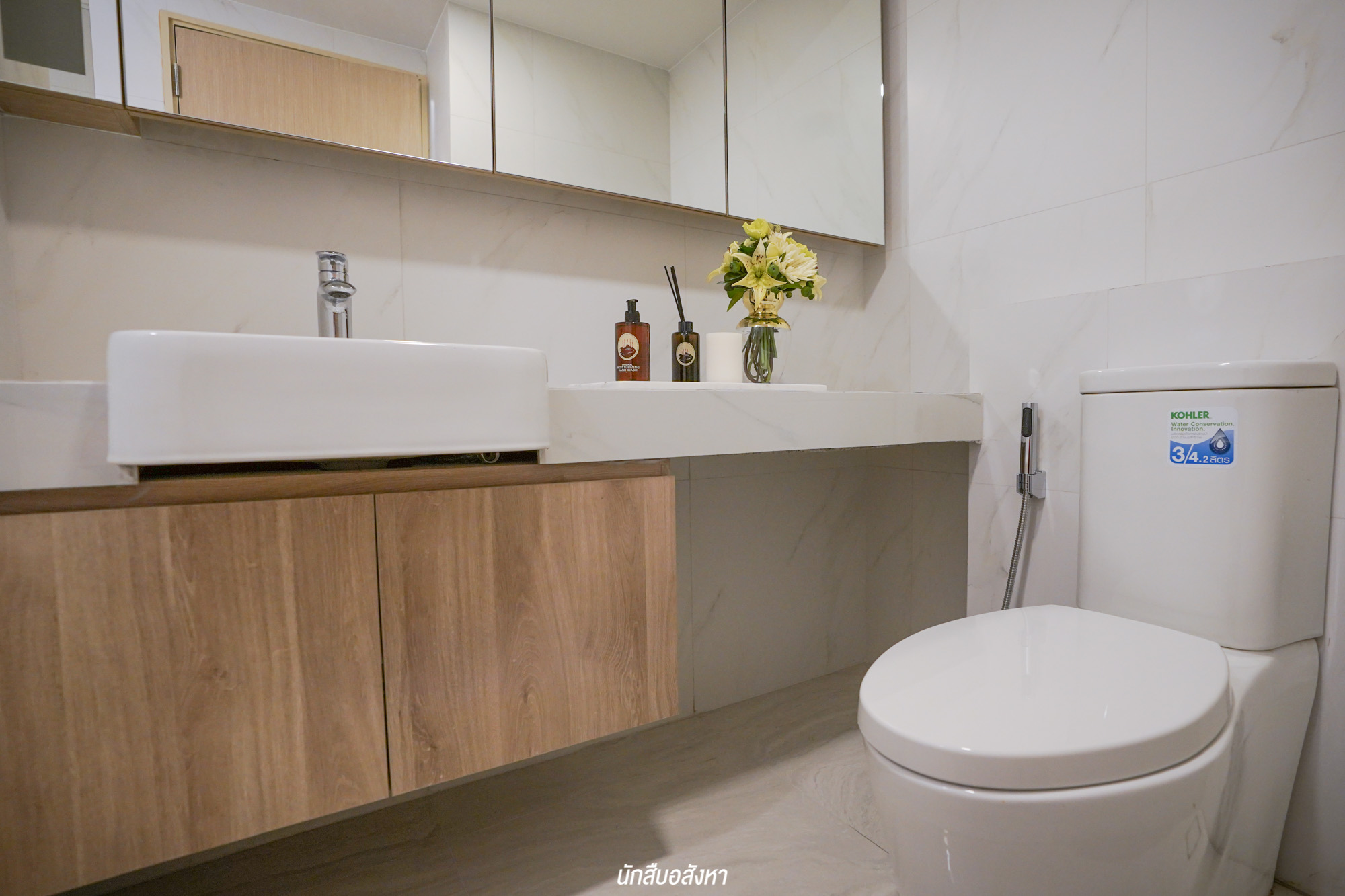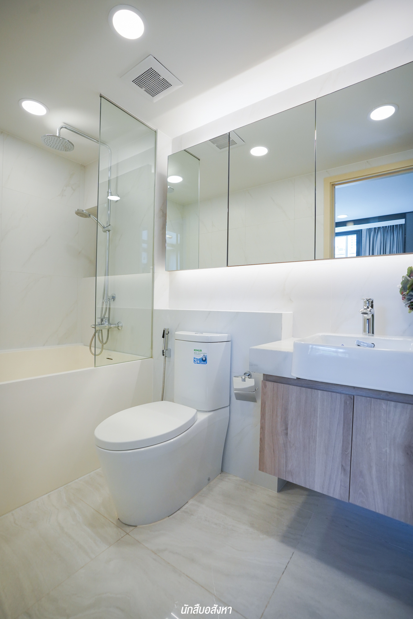ในส่วนของห้องน้ำจะอยู่ภายในห้องนอน ทำให้สามารถใช้งานได้สะดวก พร้อมสุขภัณฑ์จาก KOHLER, อ่างอาบน้ำจาก LAVENZ ครับ