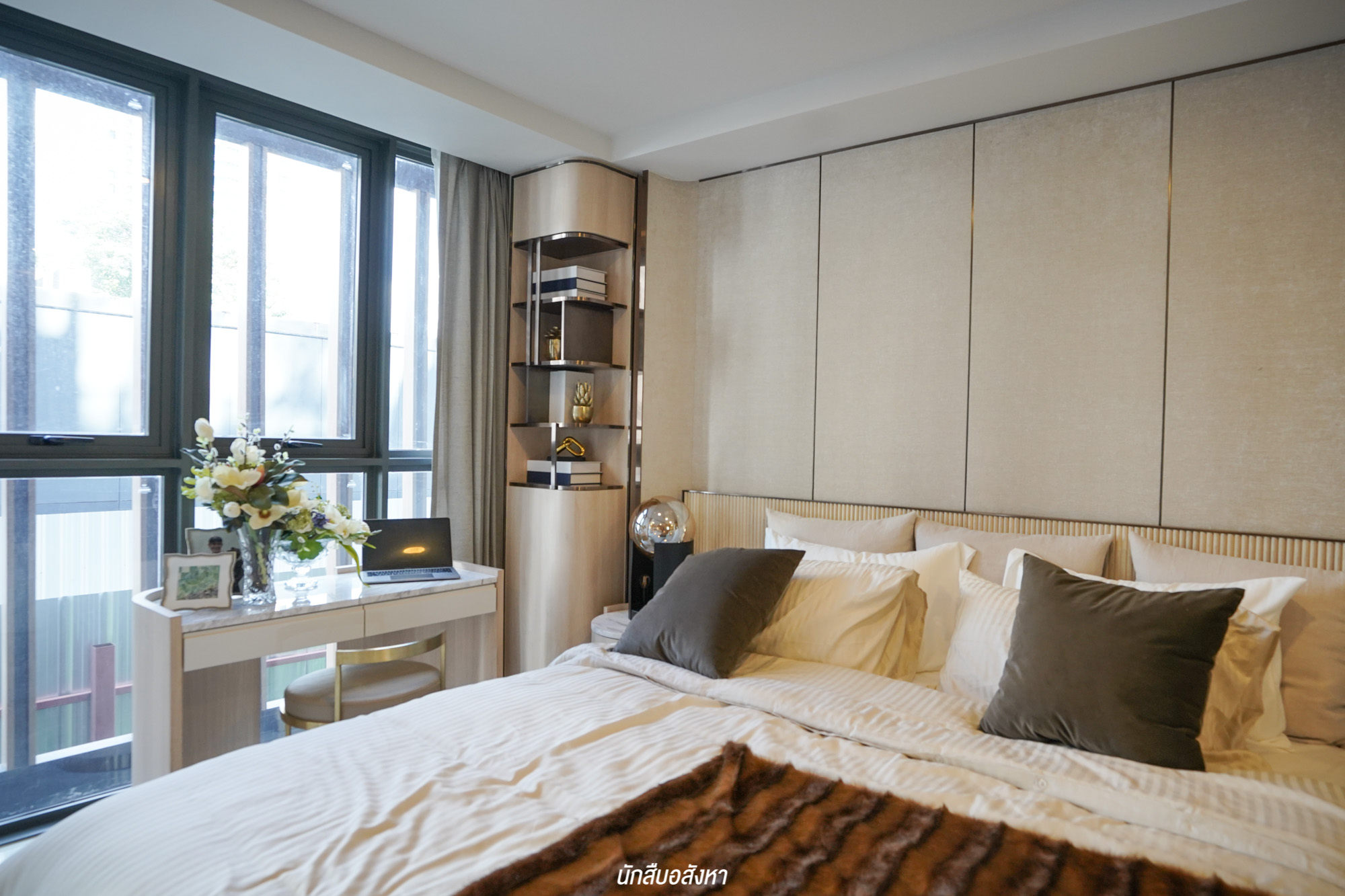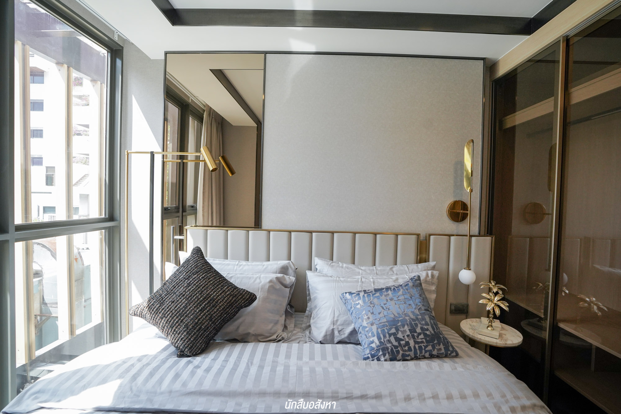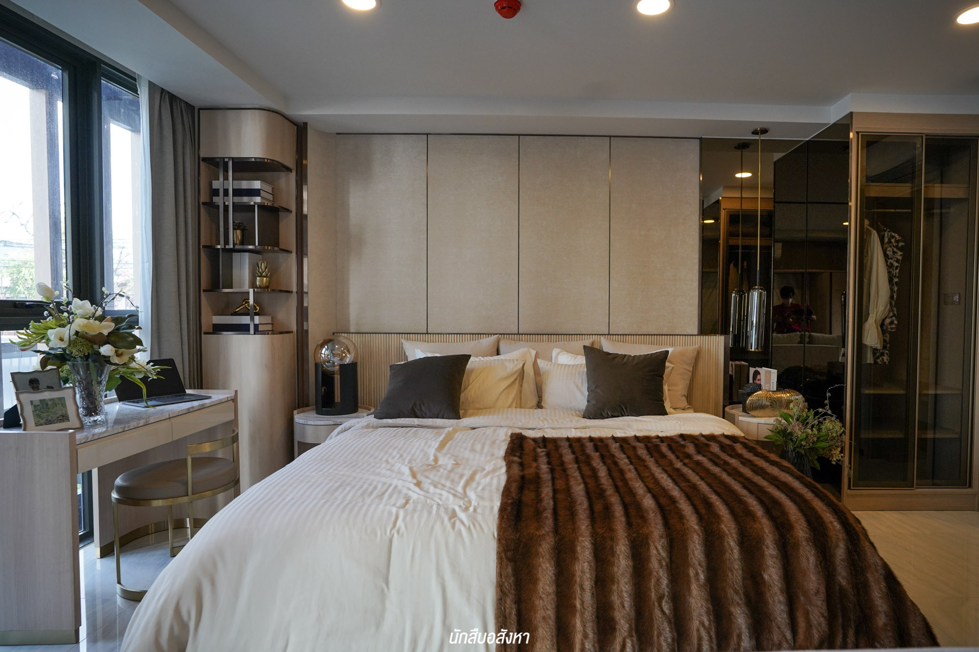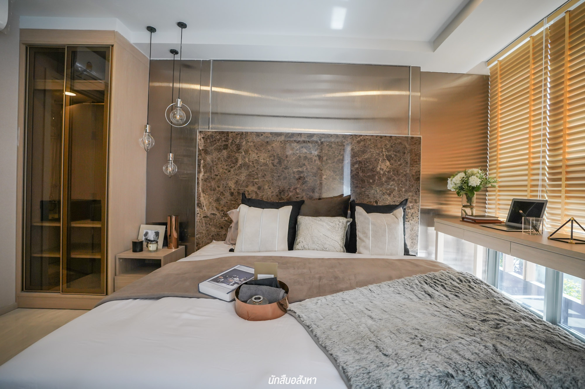 เข้ามาด้านในจะเป็นส่วนของห้องนอน มีการกั้นอย่างเป็นสัดส่วนด้วยกระจกบานเลื่อน ภายในห้องกว้างสามารถวางเตียงขนาด 5 ฟุตได้สบายๆ อีกทั้งเหลือพื้นที่ข้างเตียงสำหรับวางโต๊ะทำงาน โต๊ะข้างเตียง และตู้เสื้อผ้าได้ครับ พร้อมกระจกบานใหญ่ ช่วยให้แสงธรรมชาติเข้ามาในช่วงกลางวัน ช่วยให้ห้องโปร่ง สบาย ไม่รู้สึกอึดอัด