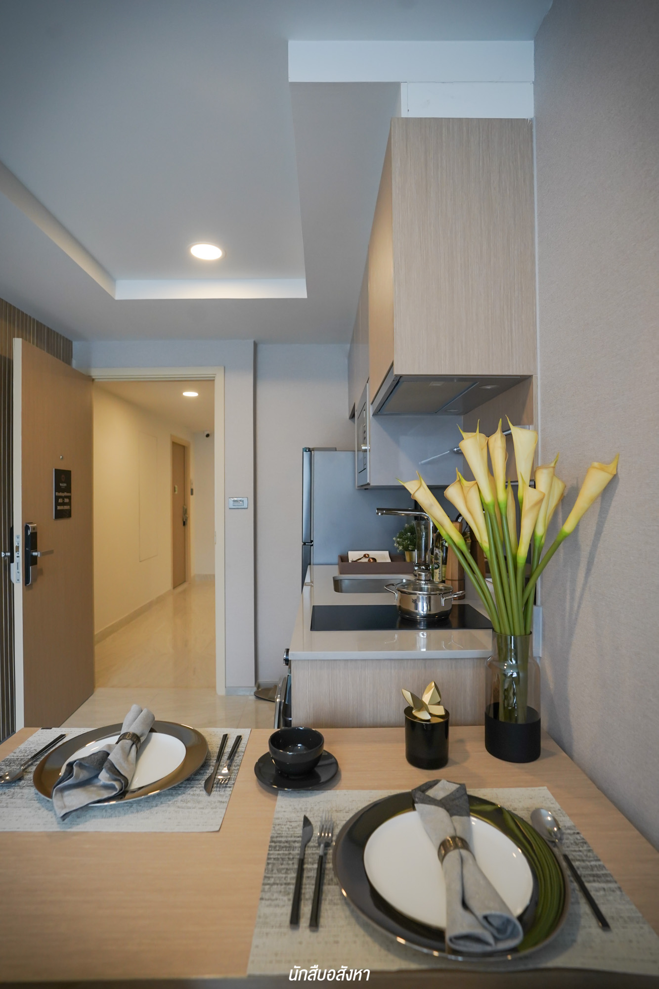 เมื่อเข้ามาพบกับส่วนพื้นที่ครัว แบบครัวเปิด พร้อมชุด Built-in เคาน์ทเตอร์ พร้อมซิงค์ล้างจานแบบ 1 หลุม, เตาแบบเซรามิคแบบ 2 หัว และชั้นด้านบนสามารถจัดเก็บของได้ อีกทั้งยังเหลือพื้นที่ด้านข้างสำหรับวางตู้เย็นได้อีกด้วยครับ และพื้นที่ทางซ้ายสามารถวางตู้รองเท้า ตู้จัดเก็บของได้ครับ
