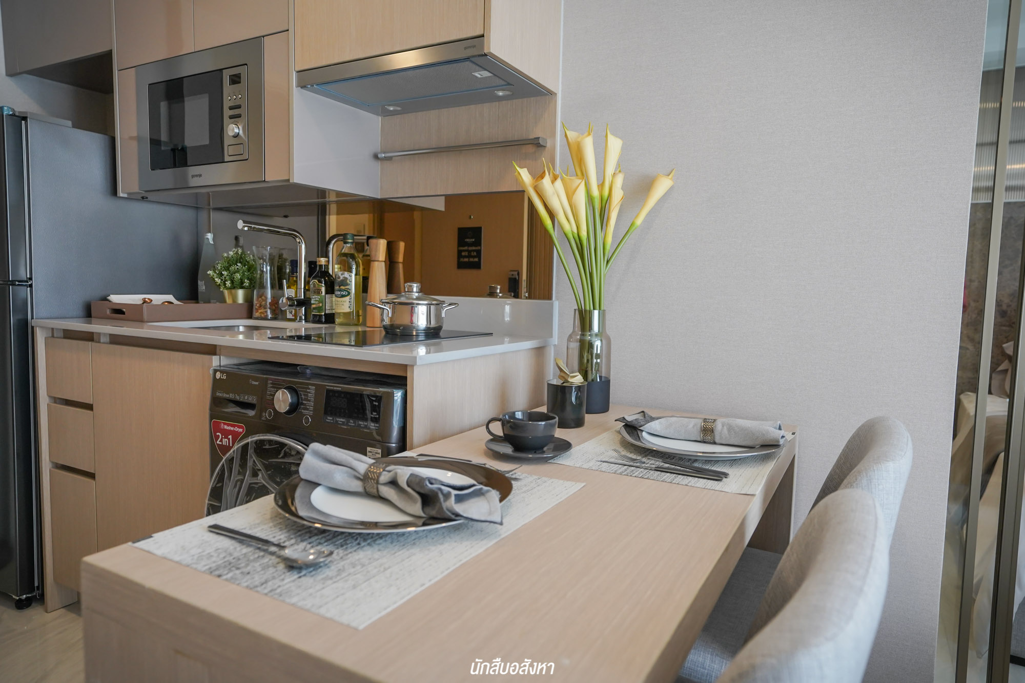 เมื่อเข้ามาพบกับส่วนพื้นที่ครัว มีชุด Built-in ที่วางเป็นแนวยาว และติดตั้งซิงค์ล้างจานแบบหลุมเดี่ยว ส่วนเตาไฟฟ้า 2 หัวครับ โดยบริเวณติดกับพื้นที่ครัว สามารถวางโต๊ะรับประทานอาหารขนาด 2 ที่นั่งได้ครับ