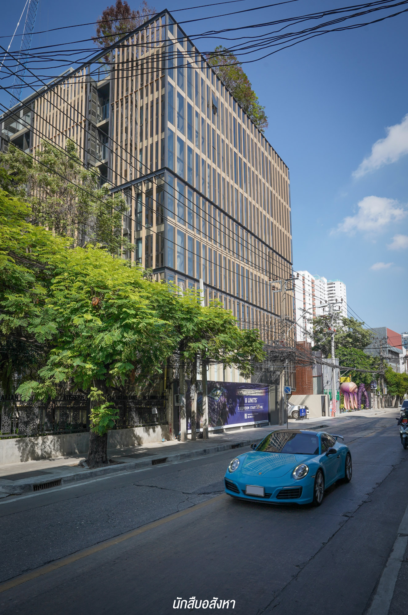 การออกแบบในงานสถาปัตยกรรม ด้านข้างอาคารตกแต่งด้วย Facade ระแนงไม้ ทำให้อาคารดูอบอุ่น และเป็นการ สร้างมิติให้ตัวอาคาร อีกทั้งช่วยพราง เพิ่มความส่วนตัวครับ