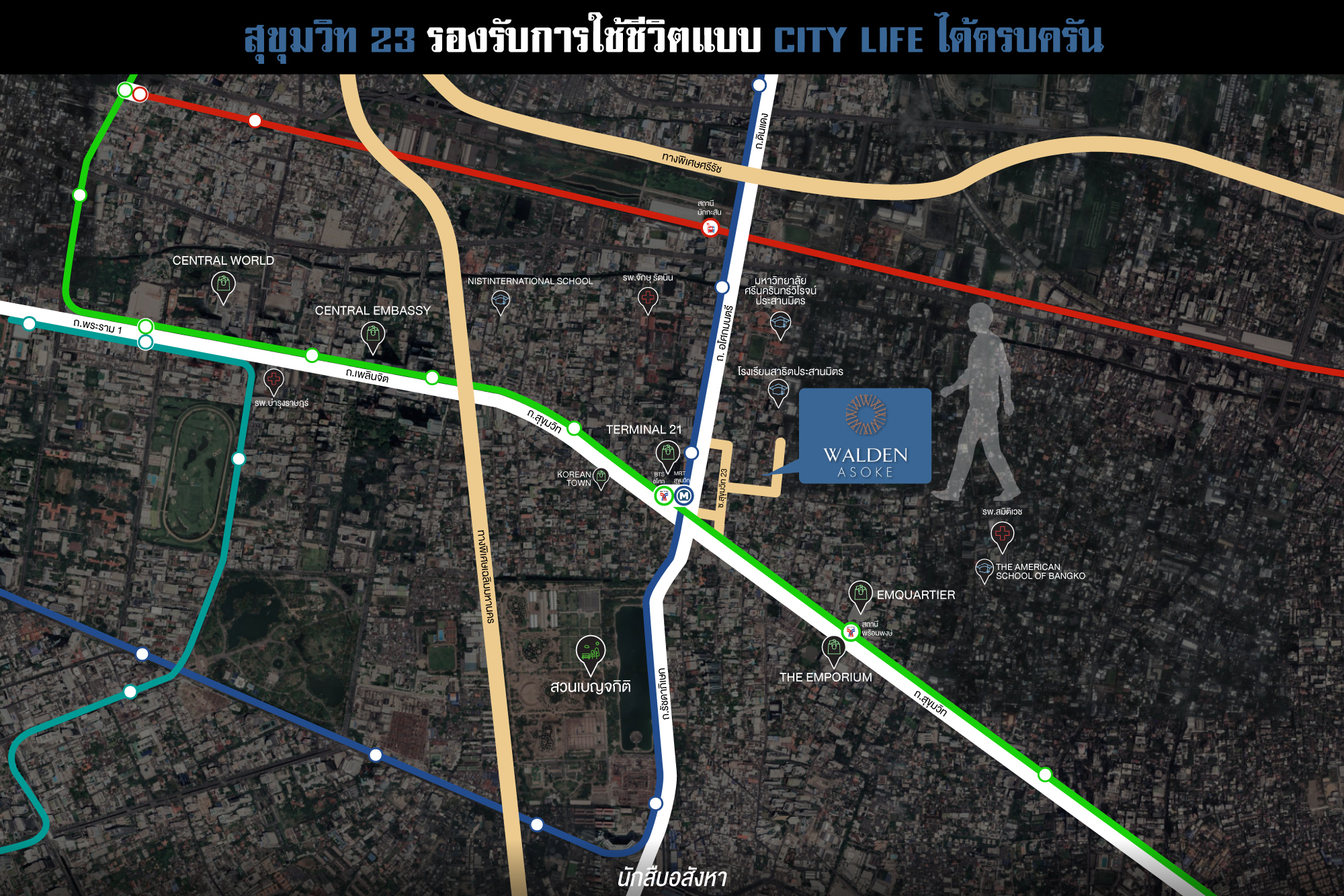 ทำเลอโศก ย่านธุรกิจที่สำคัญของกรุงเทพฯ แหล่งรวมความเจริญต่างๆ นอกจากเป็นศูนย์กลางการเดินทาง ยังเป็นแหล่งรวมไลฟ์สไตล์ ที่มีความหลากหลาย ไม่าว่าจะเป็น แหล่งรวมร้านอาหาร ย่านแฮงเอาท์สุดฮิต Co-Working Space เรียกได้ว่า อโศก “HUB of Bangkok กิน อยู่ ช้อป ทำงาน ครบจบในที่เดียว” โดยบริเวณโดยรอบโครงการ Walden Asoke ใกล้แหล่งช้อปปิ้ง อย่าง Terminal 21 เปรียบเสมือน Landmark ของย่านอโศก และ มีห้างใหญ่และหรูในเครือ The Mall คือ ห้างตระกูล Em (Emquartier, Emporium)