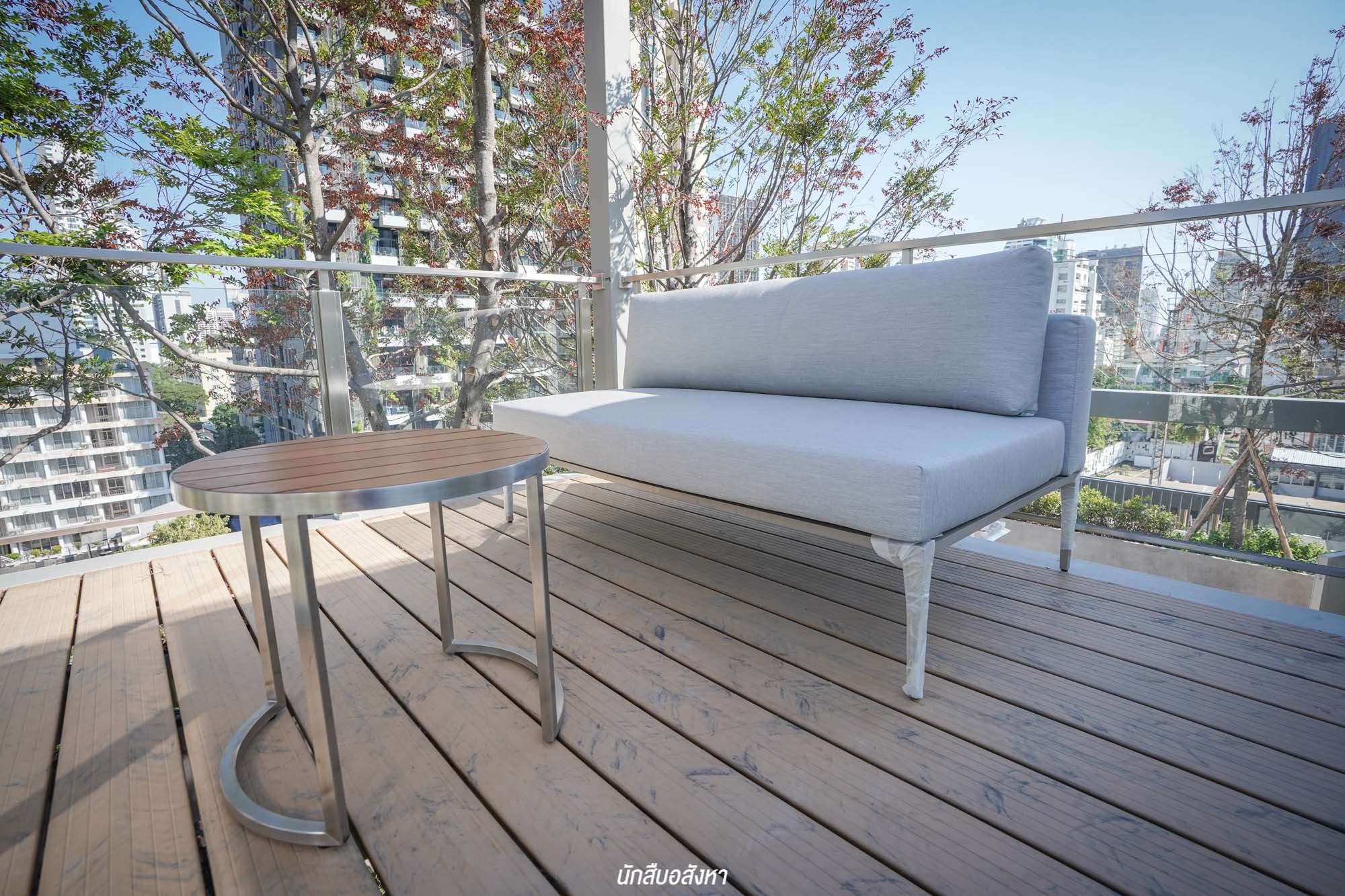 ระเบียงขนาดกำลังพอดี โดยโครงการซ่อน Condensing Unit มาให้เรียบร้อย พร้อมราวกั้นตกเป็นแบบ Frameless ครับ