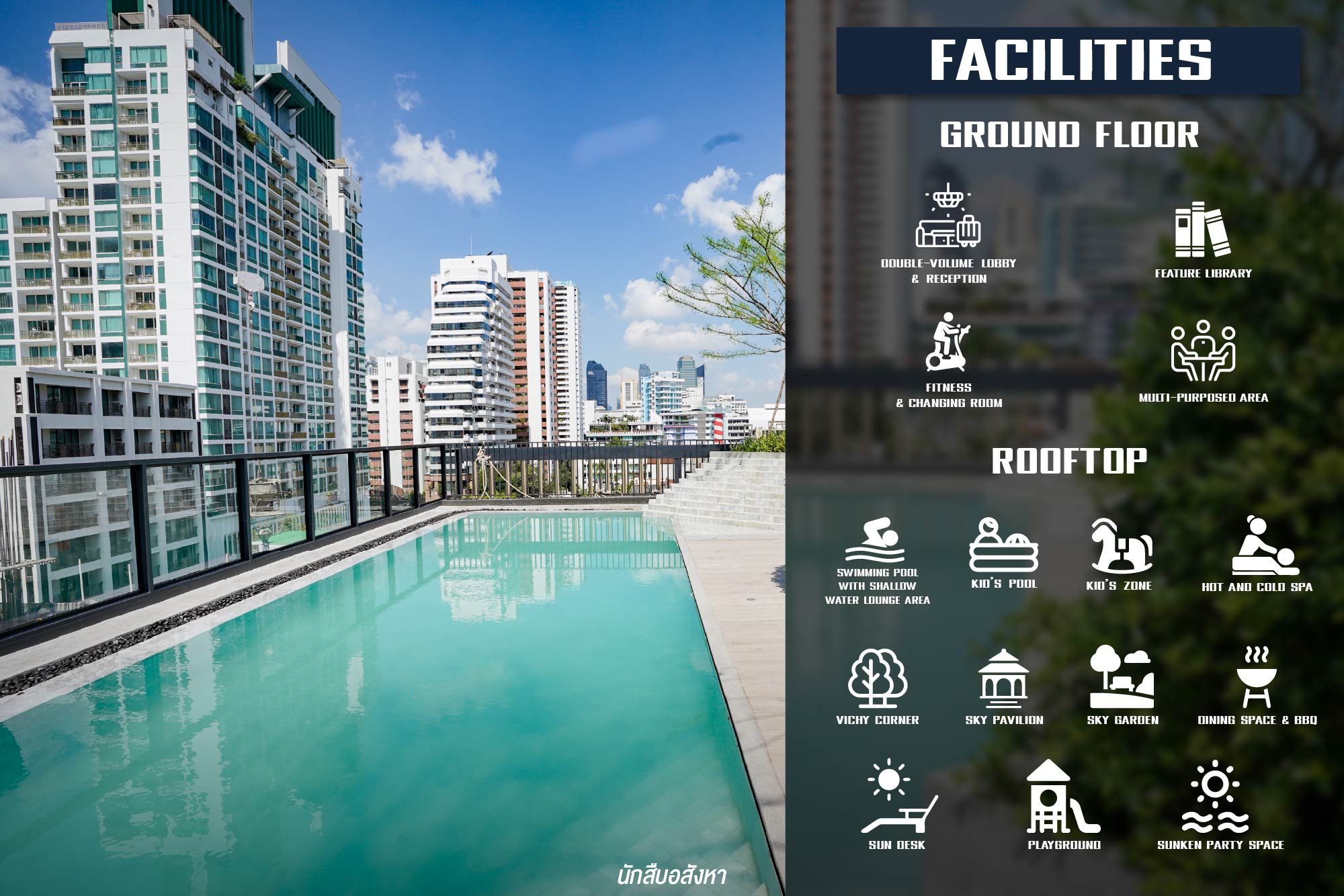 สิ่งอำนวยความสะดวกภายในโครงการครบครัน พร้อมการออกแบบมีความเป็นเอกลักษณ์ โดย Main Facilities อยู่บนชั้นดาดฟ้า รายล้อมด้วยพื้นที่สีเขียว บรรยากาศร่มรื่น