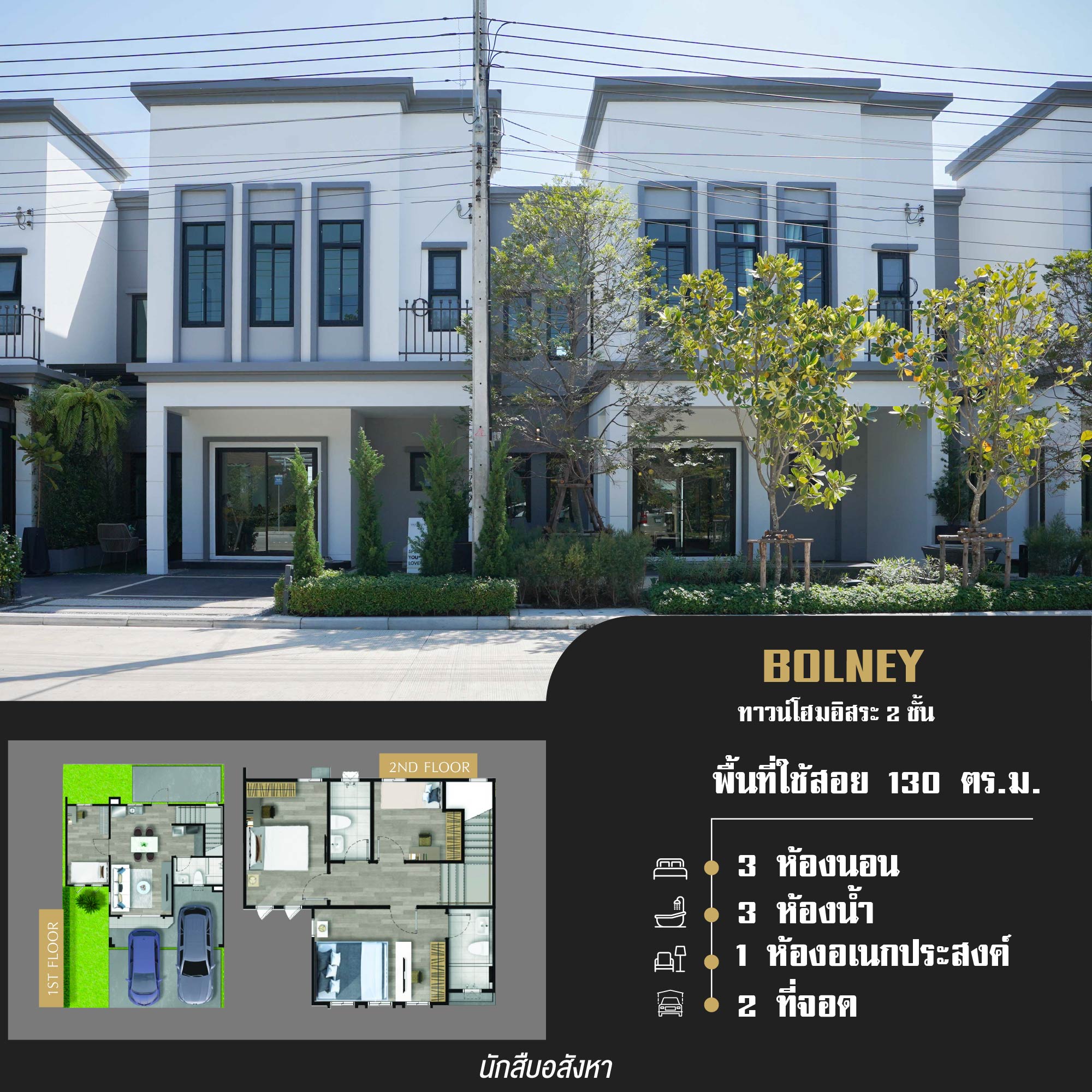 ▪ BOLNEY ทาวน์โฮมอิสระ 2 ชั้น พื้นที่ใช้สอย 130 ตร.ม. ประกอบด้วย 3 ห้องนอน 1 ห้องอเนกประสงค์ 3 ห้องน้ำ 1 ห้องนั่งเล่น และ 2 ที่จอดรถ