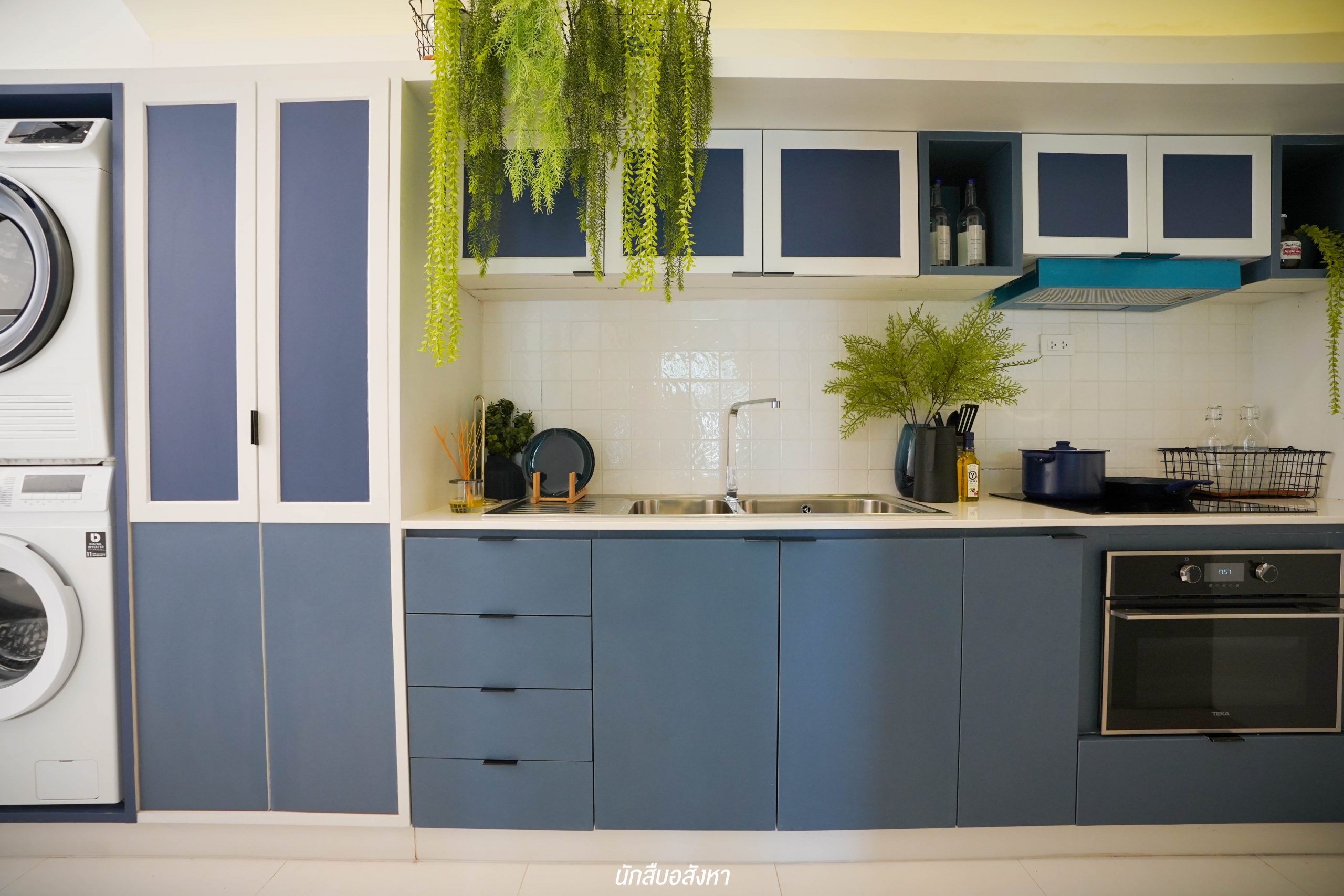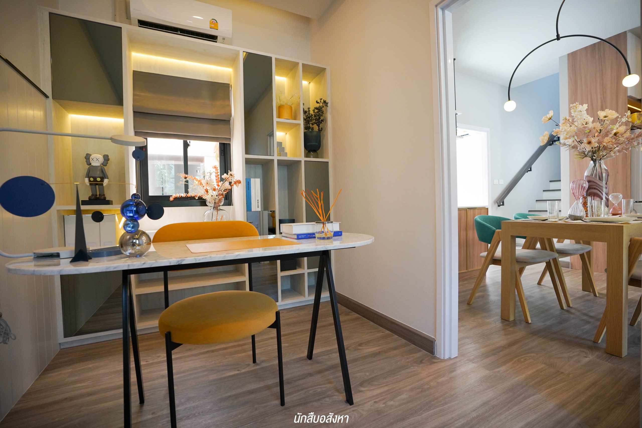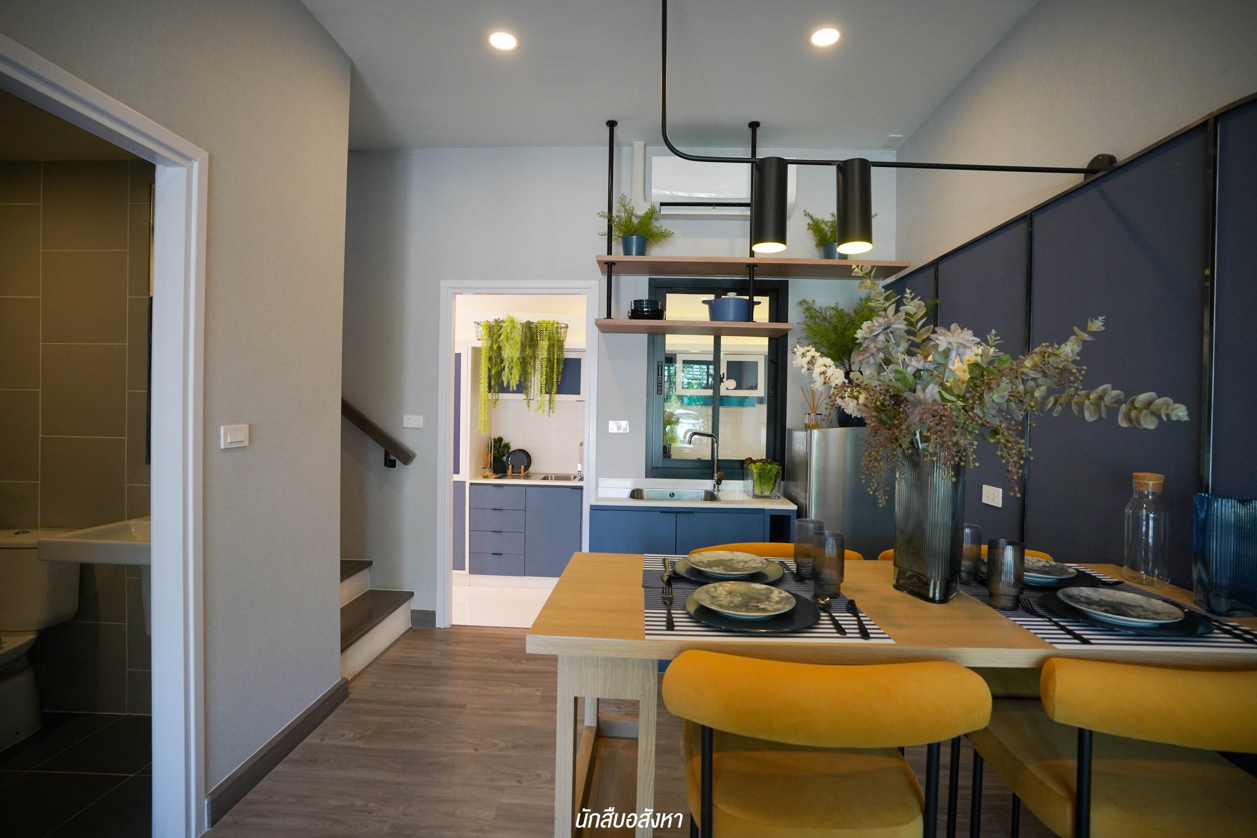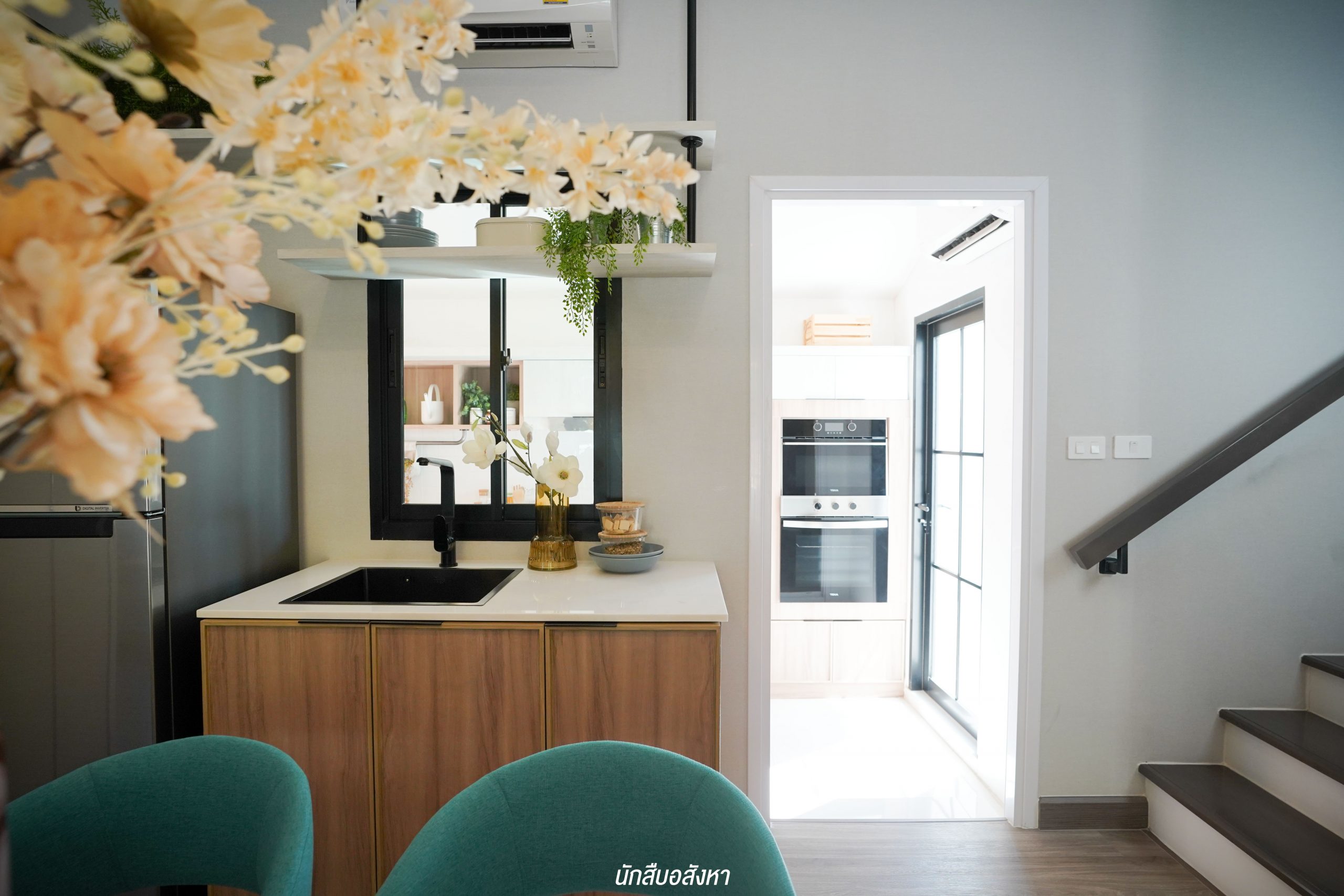 อีกหนึ่งไอเดียดี ๆ ที่บ้านตัวอย่างทำไว้ให้ดู บริเวณหน้าบันไดทำเป็นมุมซักรีด ทำให้เห็นได้ว่า โซนซักล้างไม่จำเป็นต้องอยู่บริเวณหลังบ้านเสมอไป