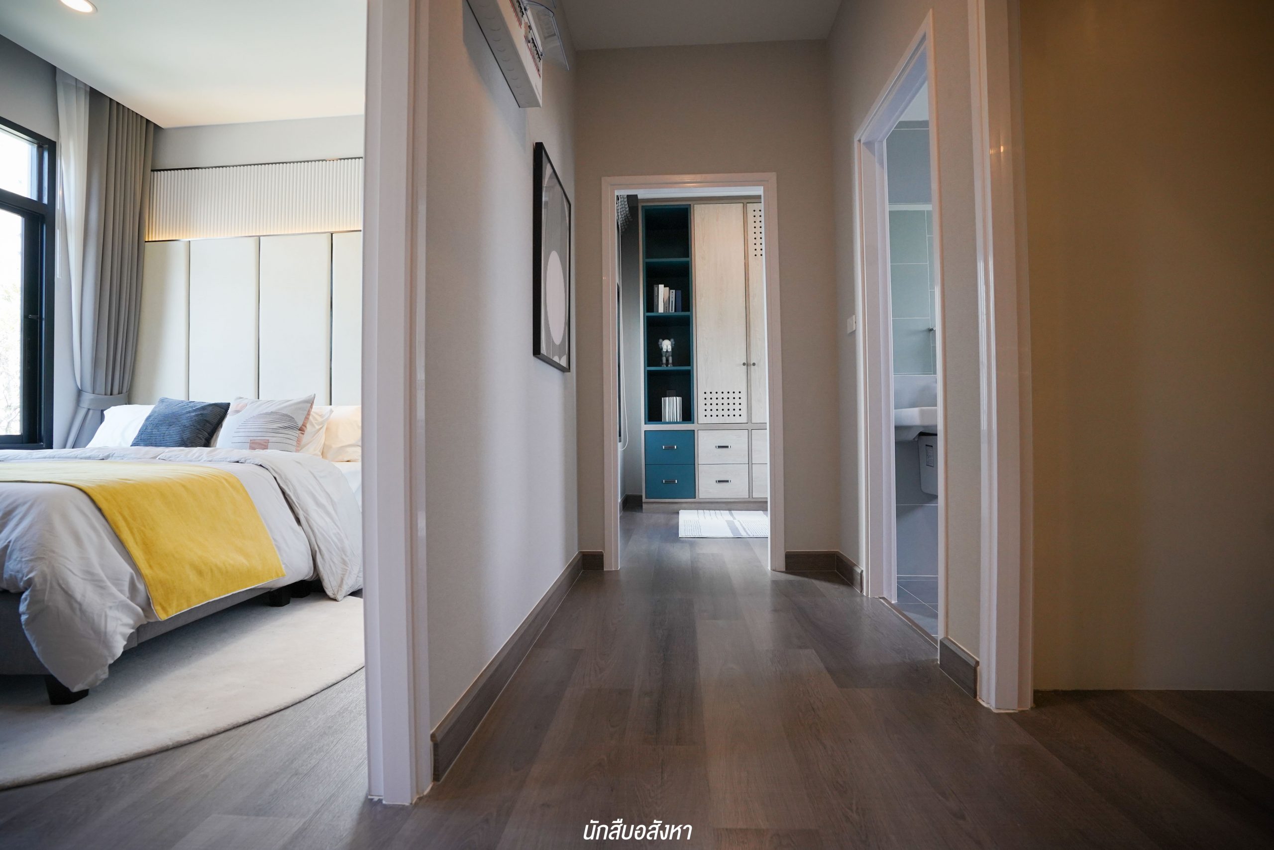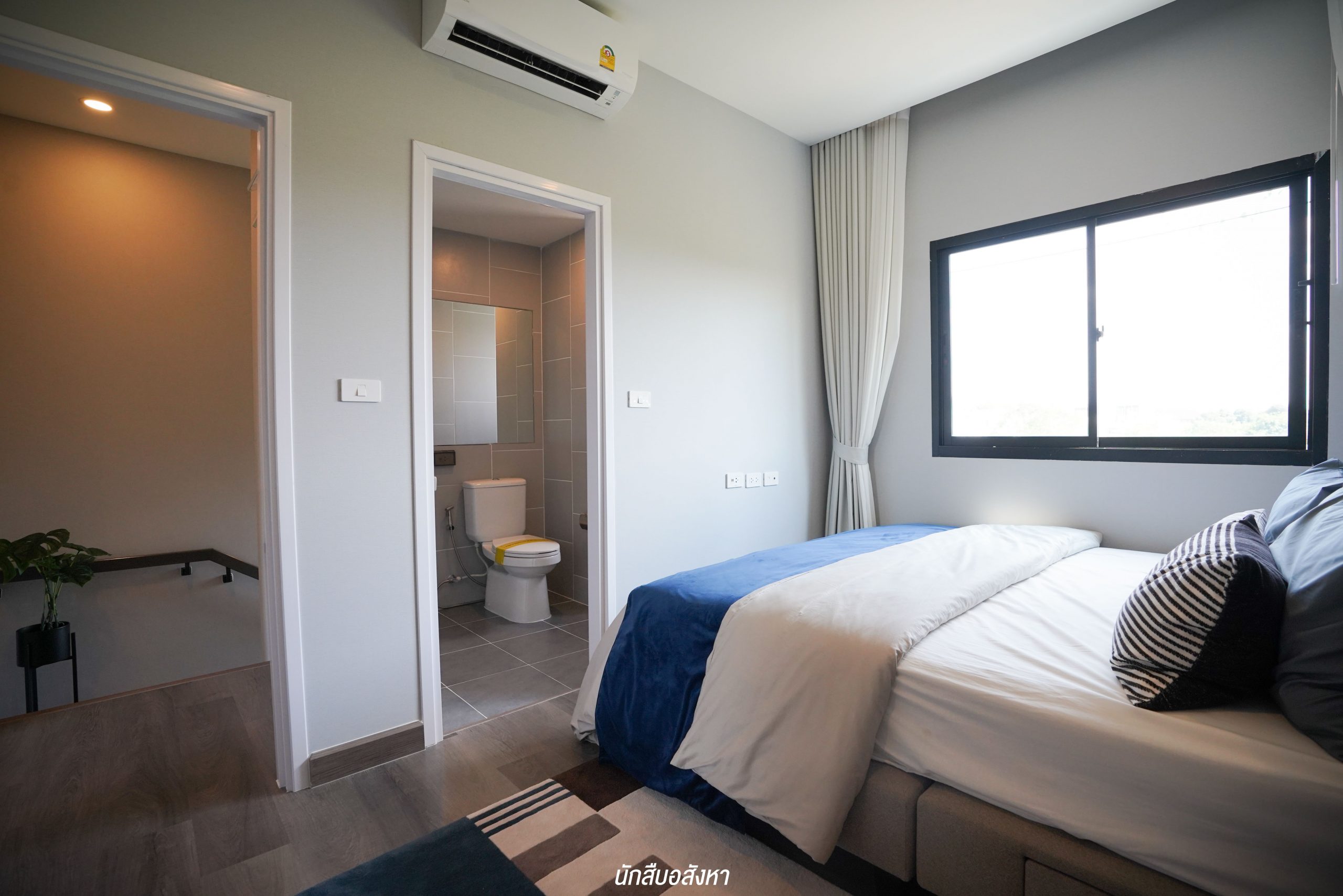 เมื่อขึ้นมาด้านบน จะเป็นพื้นที่ของห้องนอนและห้องน้ำชั้นบน โดยห้องมาสเตอร์จะมาพร้อมกับห้องน้ำในตัว ส่วนห้องนอน 2 และ 3 สามารถใช้ห้องน้ำด้านนอกร่วมกันได้ครับ
