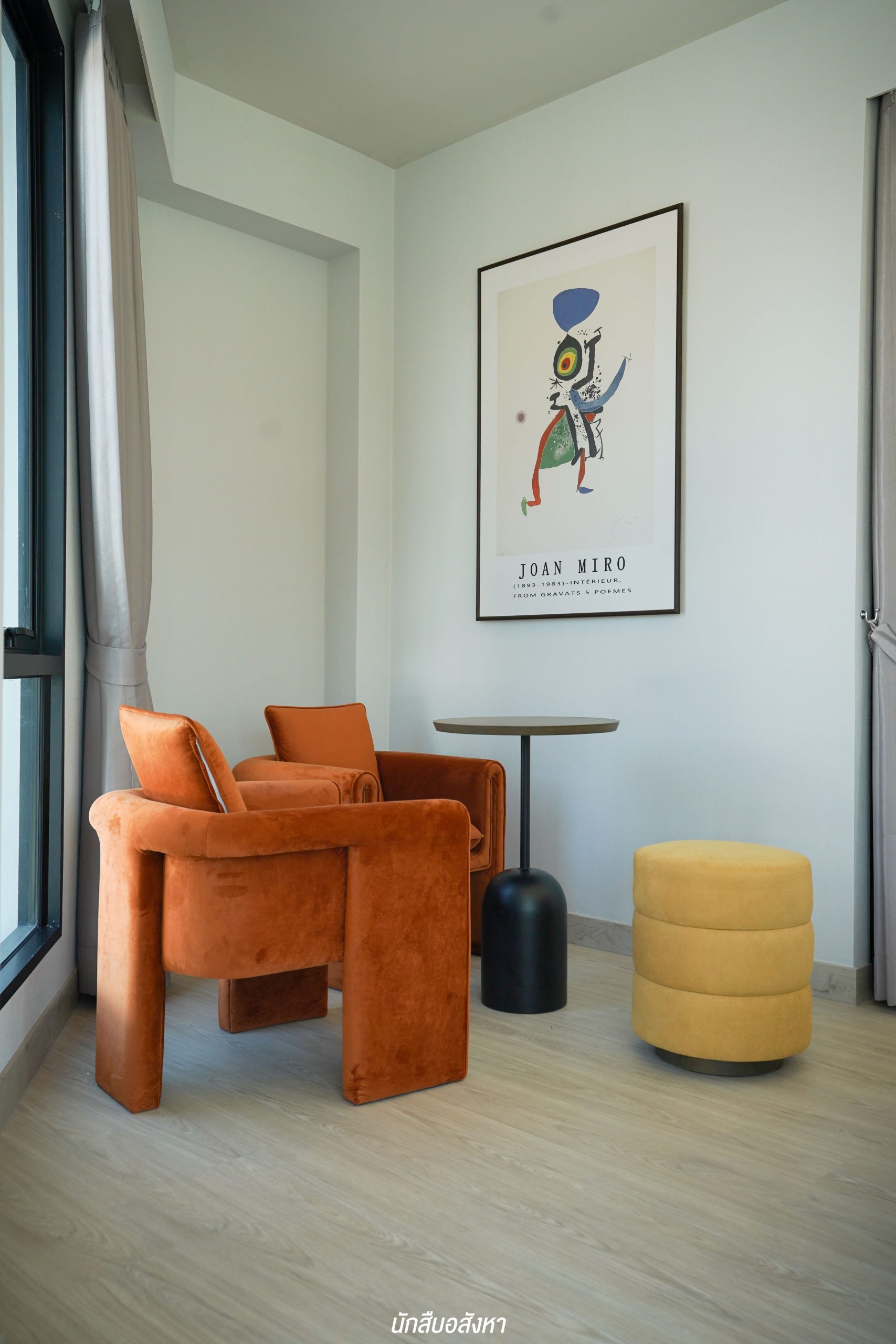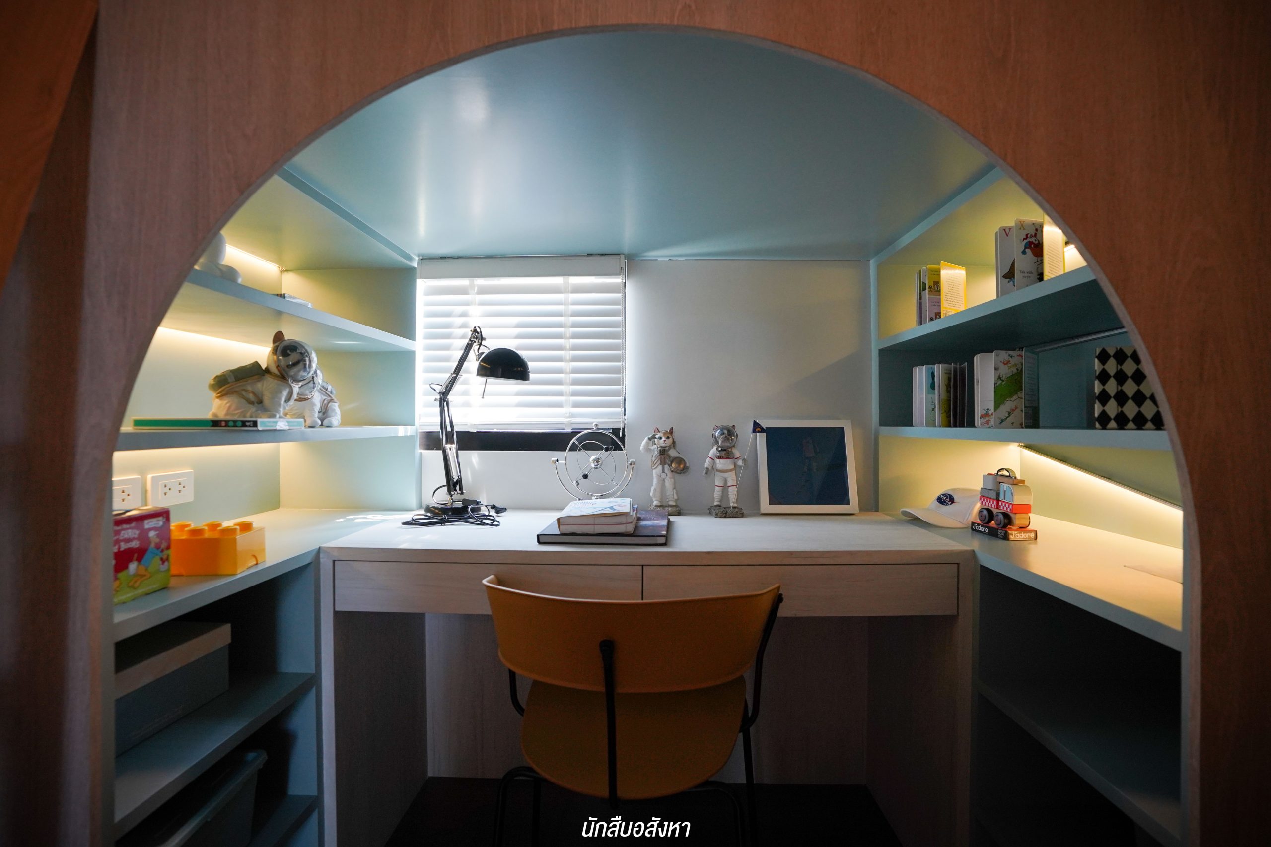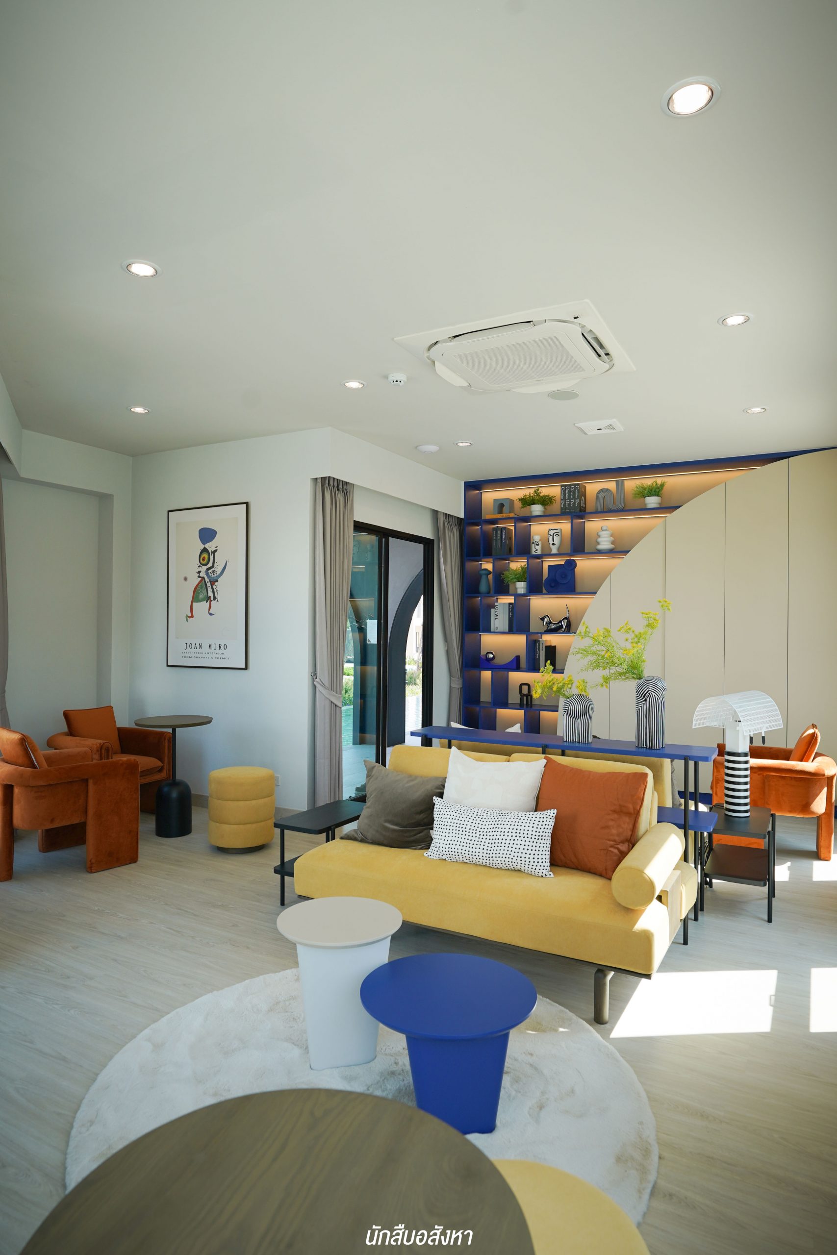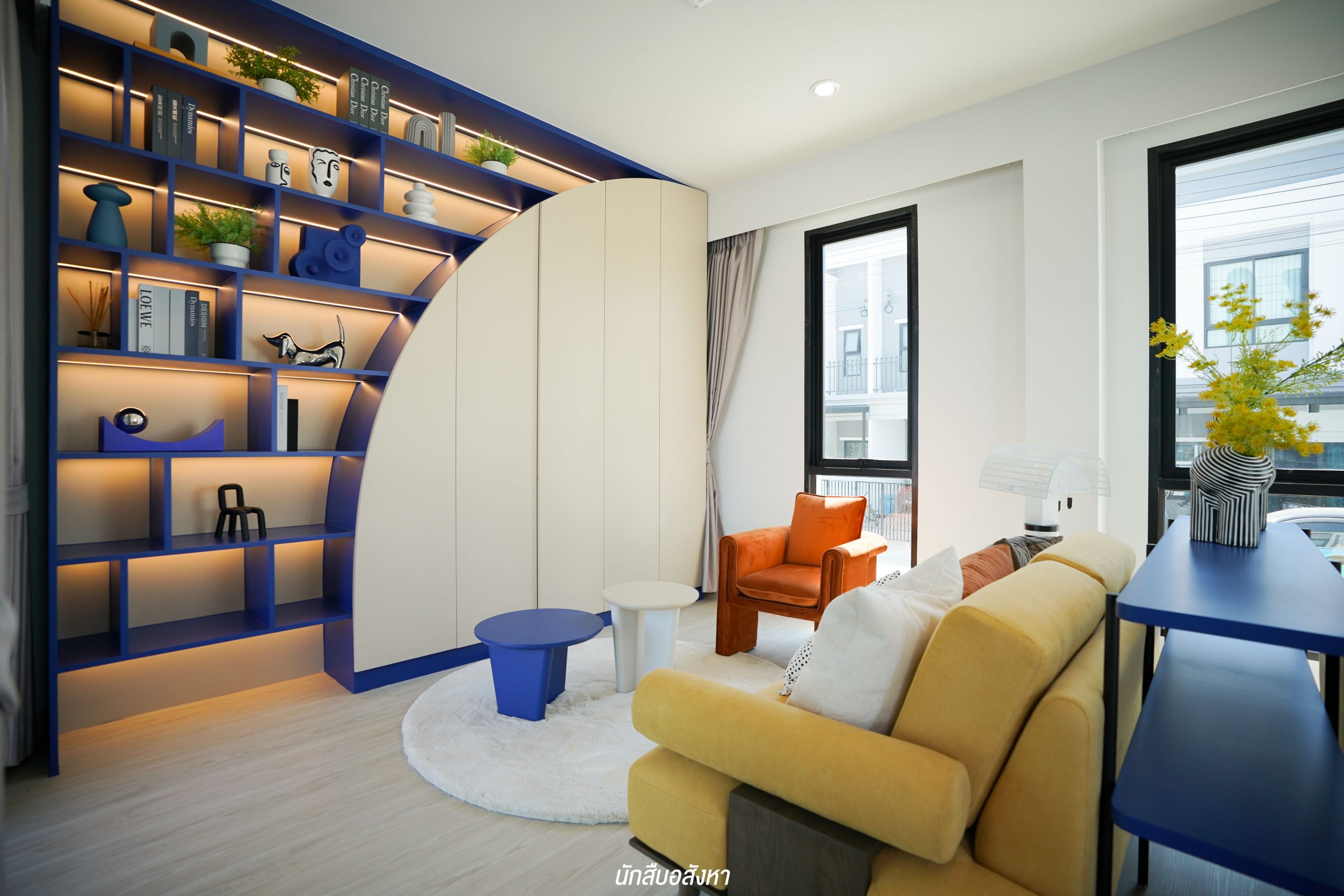 มุมนี้สามารถติดตั้งทีวีบิวท์อินและจัดวางโซฟาขนาด 3 ที่นั่งได้ ระยะห่างกำลังพอดีสายตา พื้นที่กว้าง ไม่ทำให้รู้สึกอึดอัดครับ