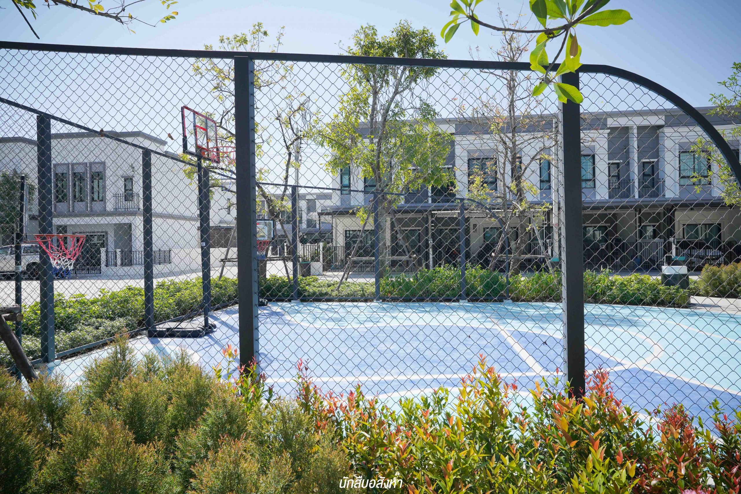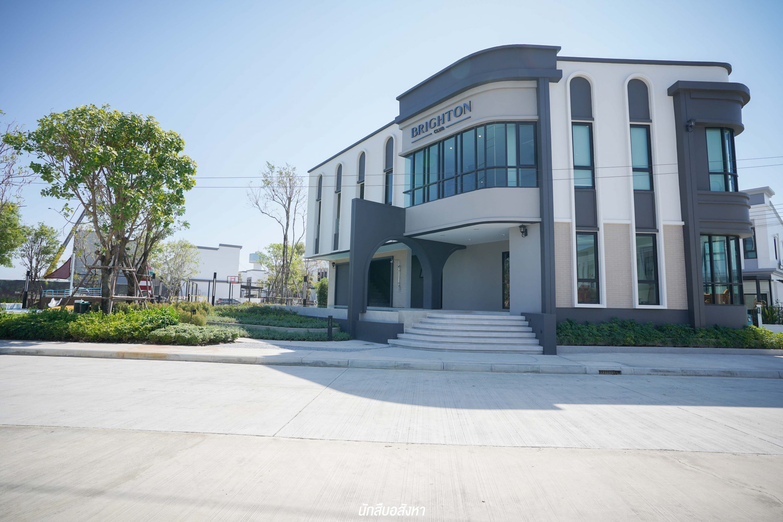 เมื่อผ่านซุ้มประตูโครงการเข้ามาแล้ว จะเป็นสิ่งอำนวยความสะดวกและพื้นที่ส่วนกลางที่อยู่บริเวณด้านหน้าครับ โดยคลับเฮ้าส์ถูกออกแบบภายใต้คอนเซ็ปต์ English Modern Style มาพร้อมกับฟังก์ชันมาตรฐานครบครัน ไม่ว่าจะเป็นสระว่ายน้ำระบบเกลือ, ฟิตเนส, Co-Working Space, Kids Room นอกจากนี้ ด้านนอกคลับเฮ้าส์ ยังมีสนามบาส และสวนส่วนกลาง ซึ่งเรียกได้ว่า Facilities แน่นมาก ๆ ครับ