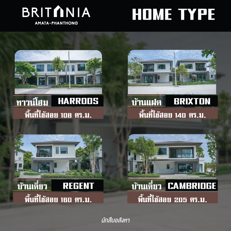 สำหรับรูปแบบบ้านโครงการ บริทาเนีย อมตะ พานทอง (Britania Amanta – Phanthong) จะมีให้เลือกทั้งหมด 4 แบบ มีทั้งทาวน์โฮม บ้านแฝด บ้านเดี่ยว พื้นที่ใช้สอย 108-205 ตร.ม. พื้นที่โครงการขนาด 73-1-32.7 ไร่ จำนวนบ้าน 440 หลัง เป็นบ้านสไตล์ Modern British จุดเด่นสำคัญคือความโปร่ง โล่ง ใช้วัสดุก่อสร้างที่เน้นความแข็งแรงคงทนและเข้าใจสภาวะอากาศบ้านเรา เช่น หลังคาสูงที่ช่วยในการเดินฉนวนกันความร้อนได้ง่ายขึ้น ฝ้าทนความชื้น สีทาภายนอกที่จะช่วยยืดอายุการใช้งานของโครงสร้าง ยังช่วยลดความร้อนในการเข้าสู่ตัวบ้าน ด้านดีไซน์มีความร่วมสมัย เอื้อต่อการอยู่อาศัยในระยะยาว เข้ากับทุกไลฟ์สไตล์ แบบบ้านในโครงการ มีดังนี้…