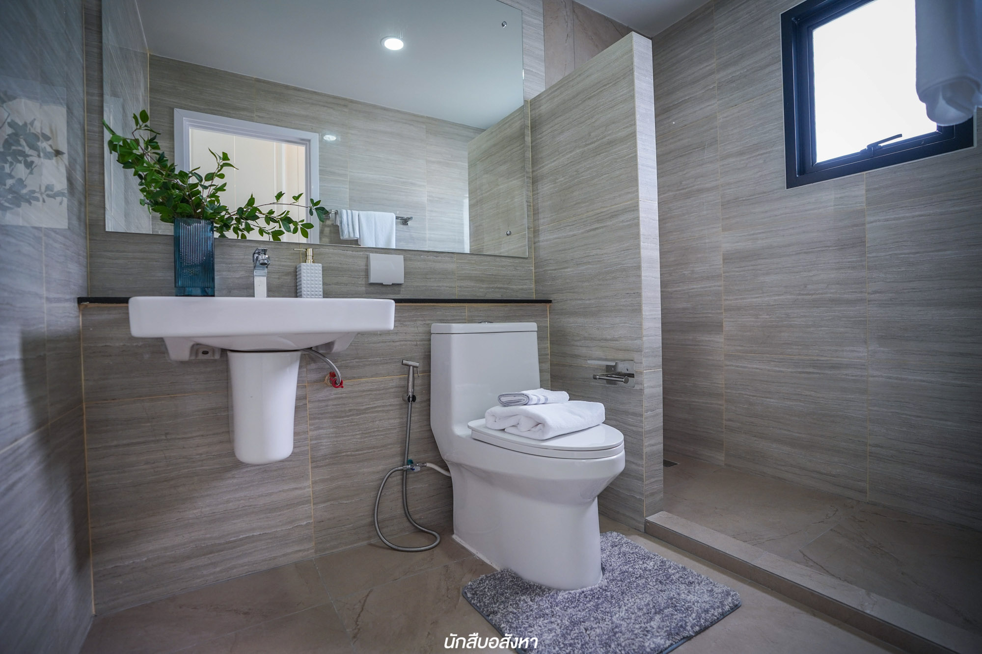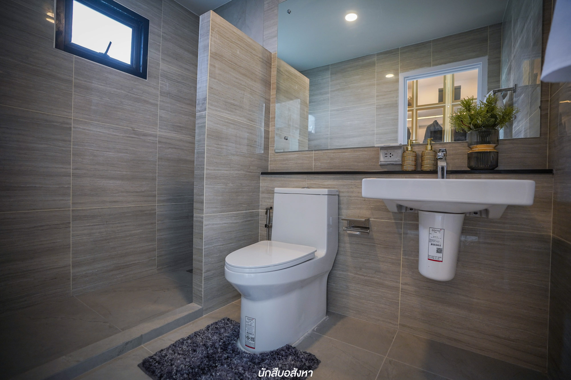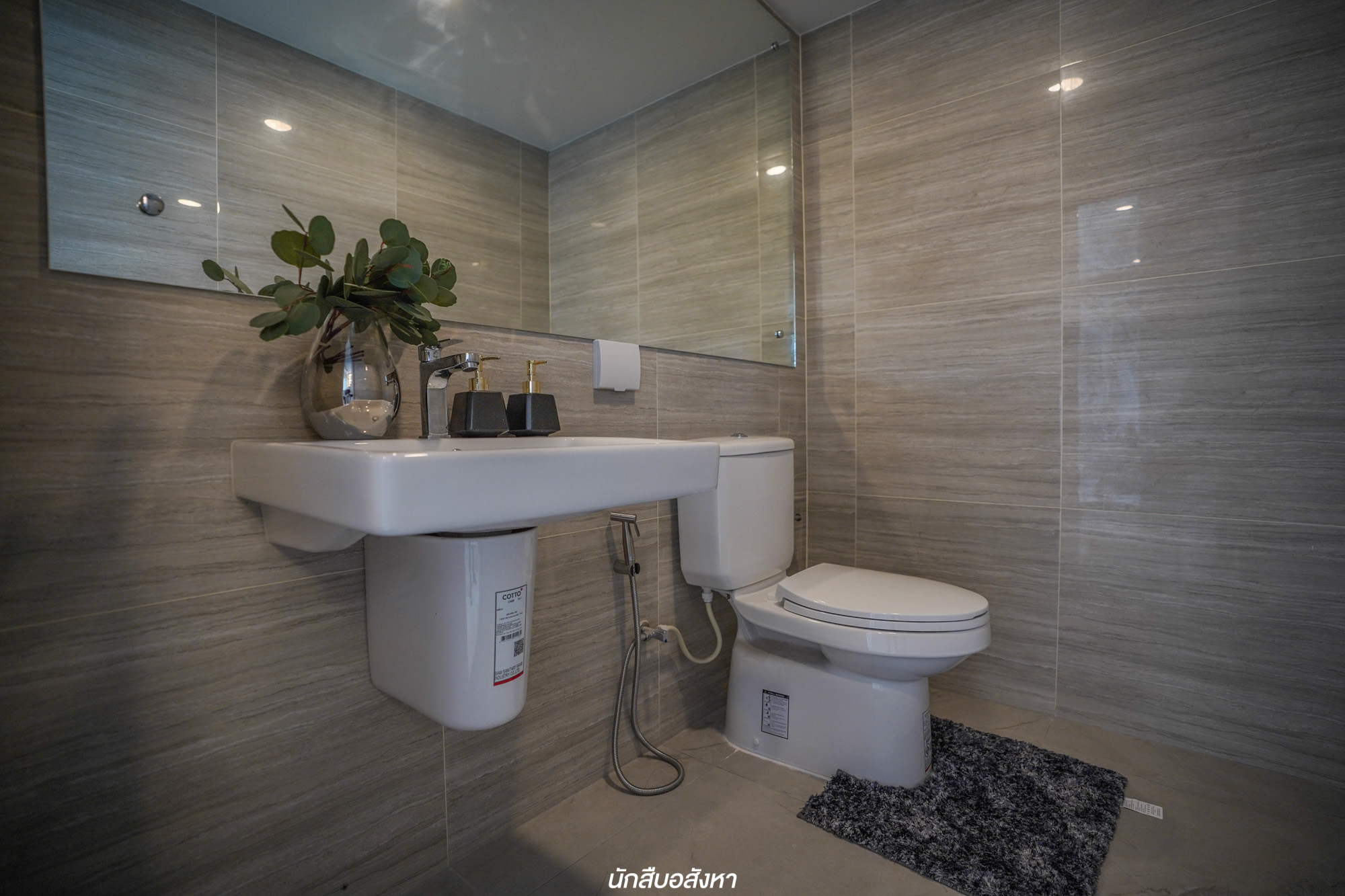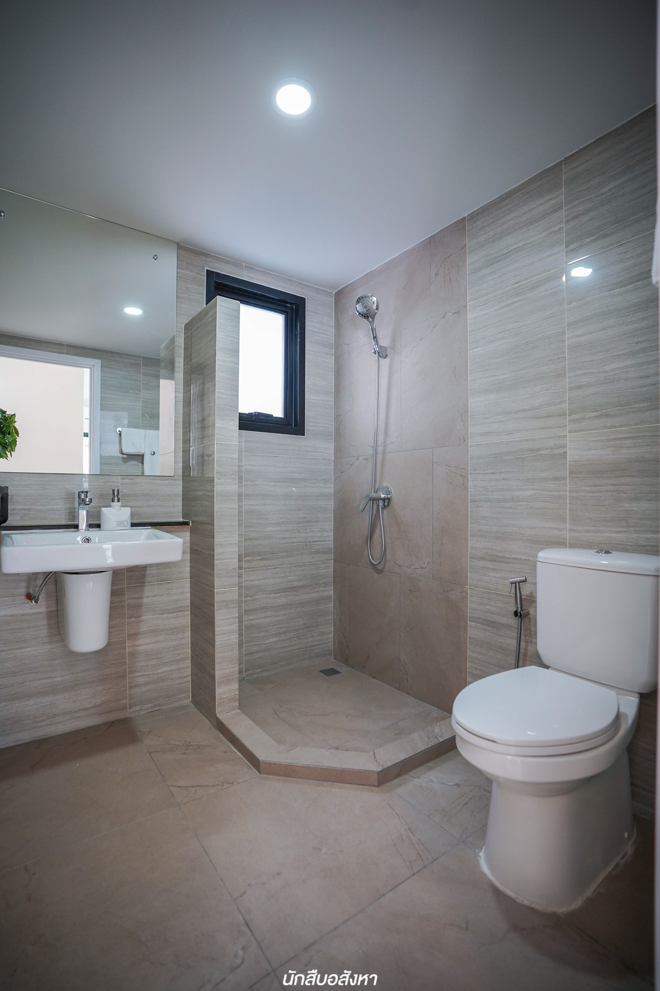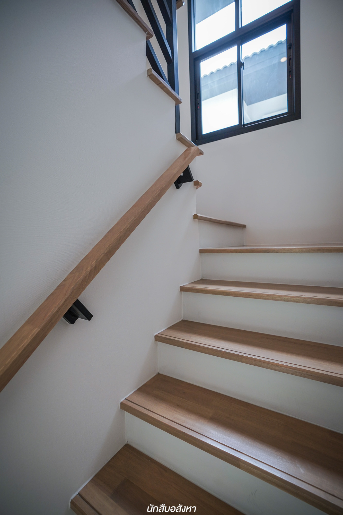 ห้องน้ำจะอยู่ติดบันได ซึ่งก็เป็นการใช้พื้นที่ใต้บันไดให้ได้ประโยชน์มากที่สุด ภายในฟังก์ชันครบ ส่วนบันไดเป็นโครงสร้างคอนกรีตเสริมเหล็ก มีช่องแสงธรรมชาติระหว่างทางเดินมี 2 จุดด้วยกันครับ