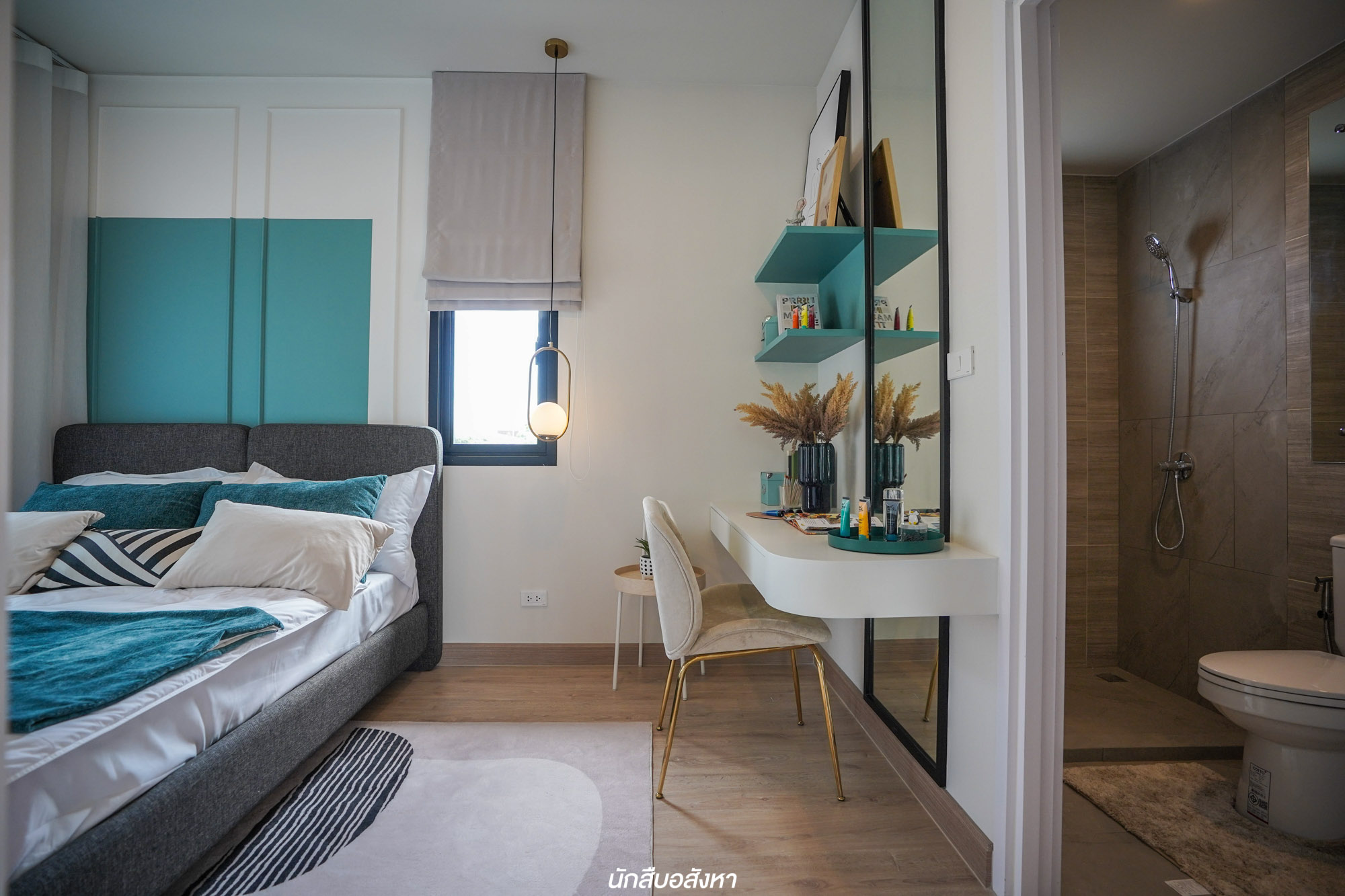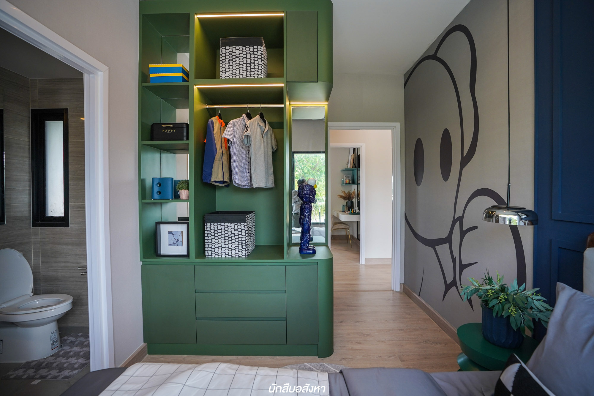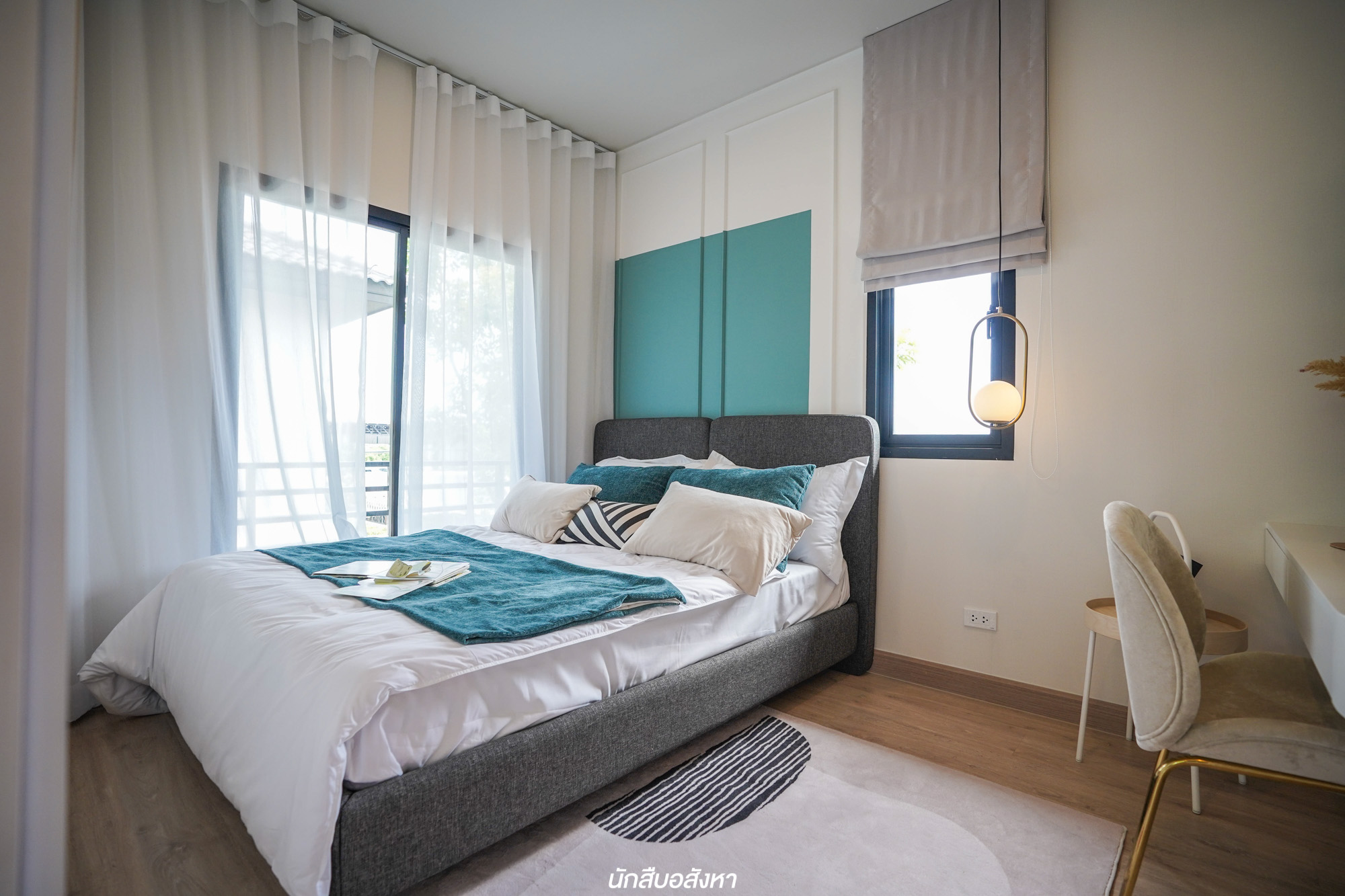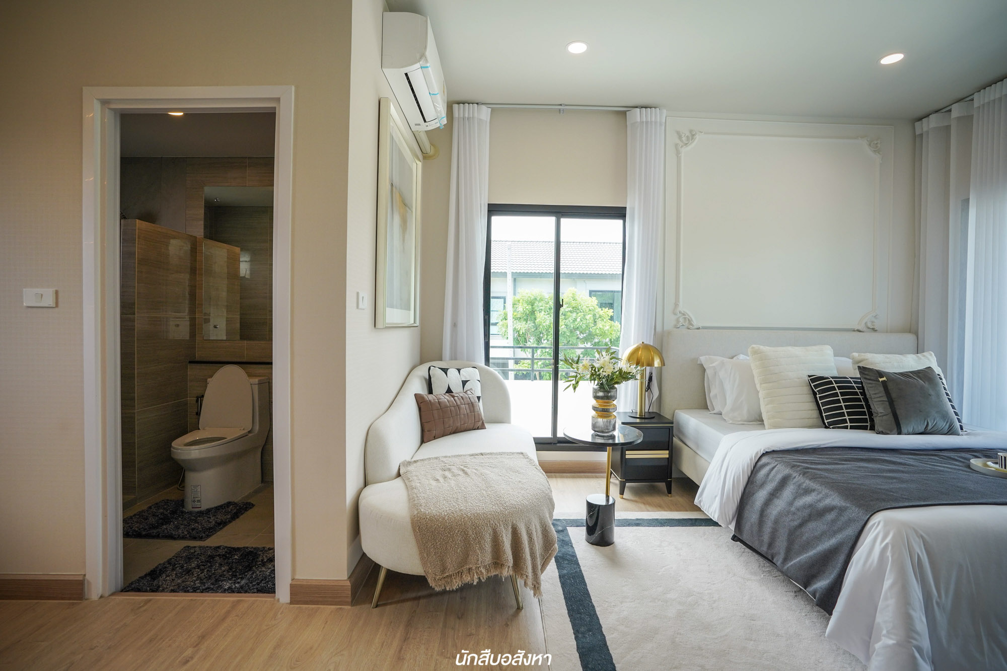 พามาชม Master Bedroom เป็นห้องแรกกันเลย ห้องนี้มีฟังก์ชันครบ ทั้ง Walk in Closet และห้องน้ำในตัว พื้นที่ปลายเตียงเหลือพอสมควร ทำให้เดินเข้าออกง่าย และยังมีระเบียงขนาดใหญ่ใช้งานได้จริง