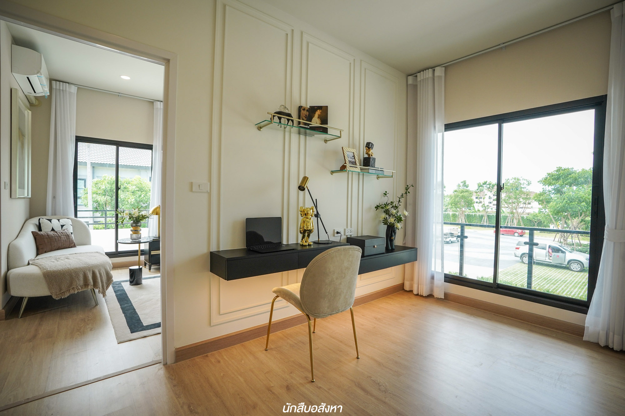 เมื่อขึ้นไปชั้นบนจะเจอกับโถงกลาง ซึ่งเหมาะที่จะทำเป็นมุม Work From Home มีผนังกระจกพร้อมระเบียงให้ได้เทควิว ในช่วงพักสายตา