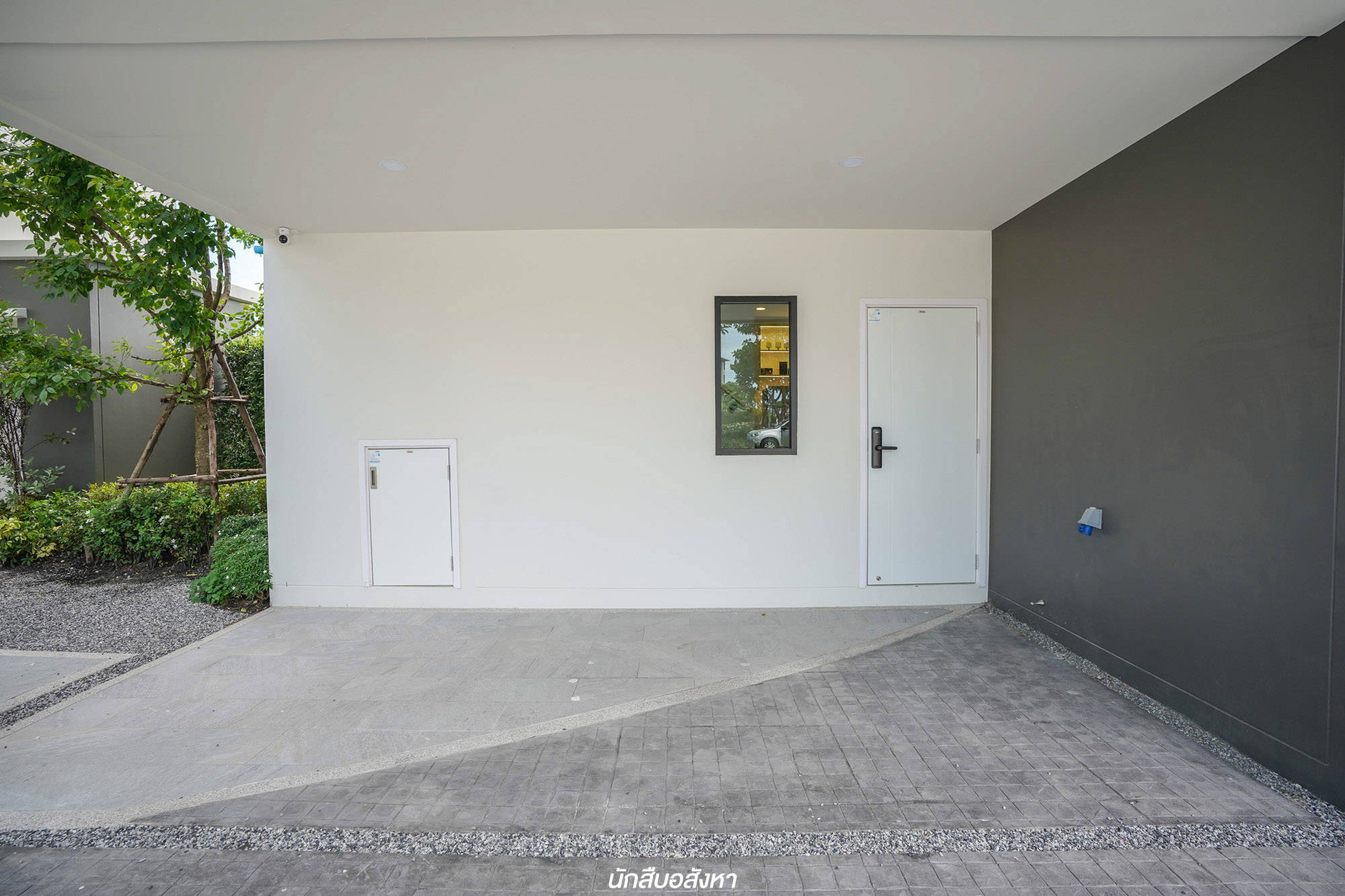 ตัวบ้านออกแบบด้วยแนวคิด บ้านแฝดอิสระ โดยจะมีส่วนที่ติดกับเพื่อนบ้านแค่ครัวไทย ทำให้มีพื้นที่เดินได้รอบบ้านเหมือนบ้านเดี่ยว ส่วนพื้นที่ใช้สอยหน้าบ้านสามารถจอดรถได้ถึง 2 คัน และทางโครงการได้ติด IP Camera ไว้ให้เลย ทางเข้าบ้านเป็นแบบกระจกบานเลื่อนขนาดใหญ่ ได้ประตูระบบ Digital Door Lock แถมมาด้วย จะเห็นได้ว่าหน้าบ้านจะมีช่องแสงถึง 2 จุดด้วยกัน เพื่อทำให้แต่ละส่วนของบ้านมีความโปร่งสบาย ใช้ไฟฟ้าน้อยลง