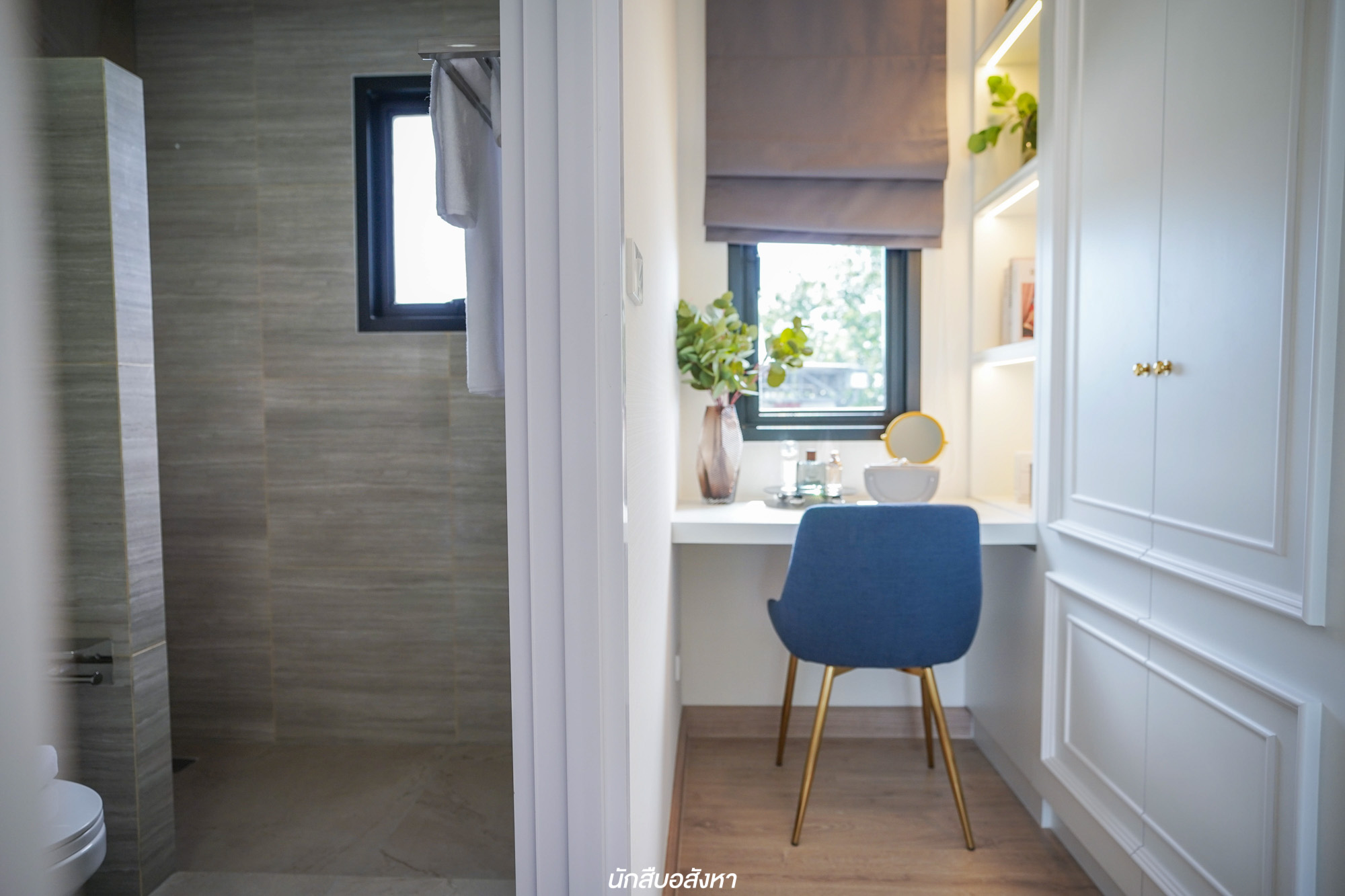 ถัดมาอีกโซนตั้งแต่บันไดจะเป็นส่วนของ Pantry ครัวในบ้าน และห้องน้ำชั้นล่าง มุมนี้จะถูกกั้นโซนด้วย Pantry ยังช่วยบดบังสายตาจากห้องน้ำ สำหรับห้องน้ำจะแยกโซนเปียกและแห้ง มีสเตปกั้นน้ำไม่ให้ล้นออกข้างนอก สามารถหากระจกมาติดเพิ่มได้ ส่วนครัวที่อยู่ภายในบ้าน เน้นทำอาหารเบาๆ เบเกอรี่ที่กลิ่นไม่รุนแรง ถ้าอยากจะทำอาหารหนักๆ ก็สามารถมูฟไปทำอาหารครัวไทยที่อยู่เชื่อมต่อกัน