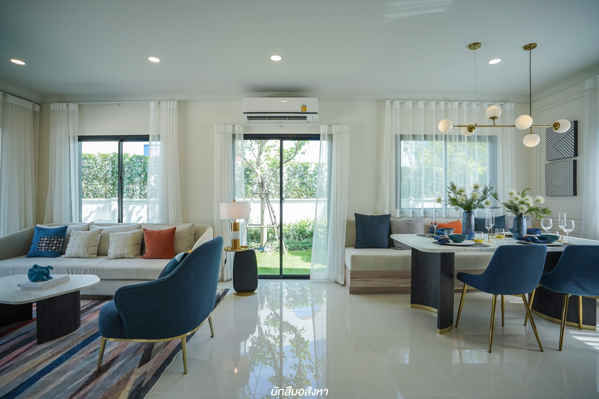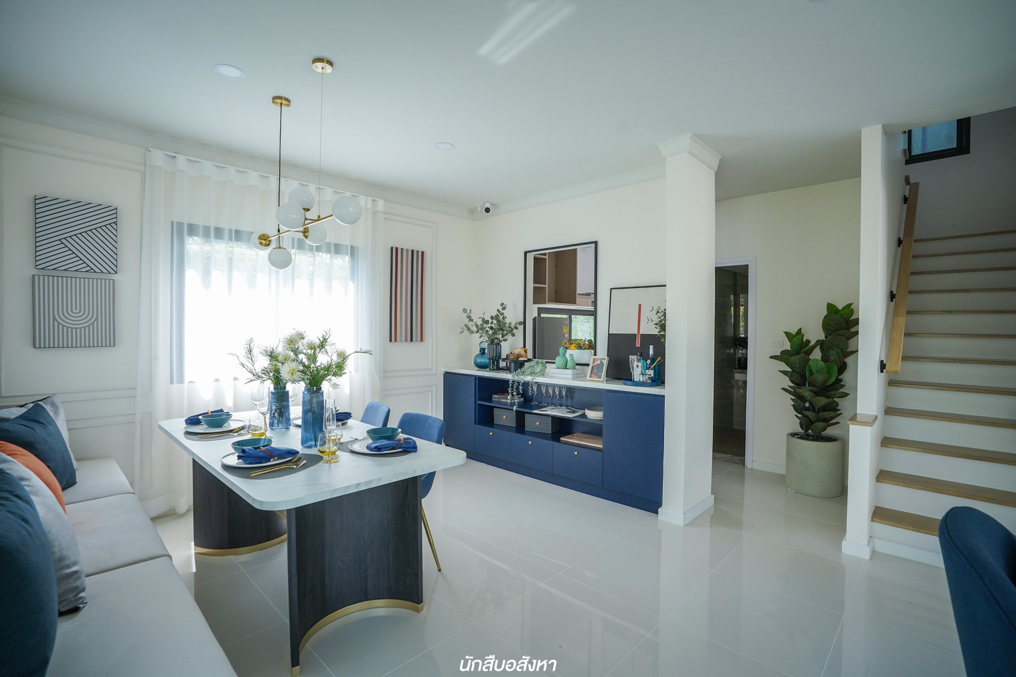 และเมื่อเข้ามาในตัวบ้านแล้ว จะเห็นเลยว่า Living Area นั้นมีขนาดใหญ่ เหลือพื้นที่เยอะจริงๆ ในขณะที่ Dining Area นั้นจะเชื่อมต่อกับ Living Area แบบ Open Space  เน้นพื้นที่เปิดโล่ง ทำให้ตัวบ้านดูกว้างมากยิ่งขึ้น