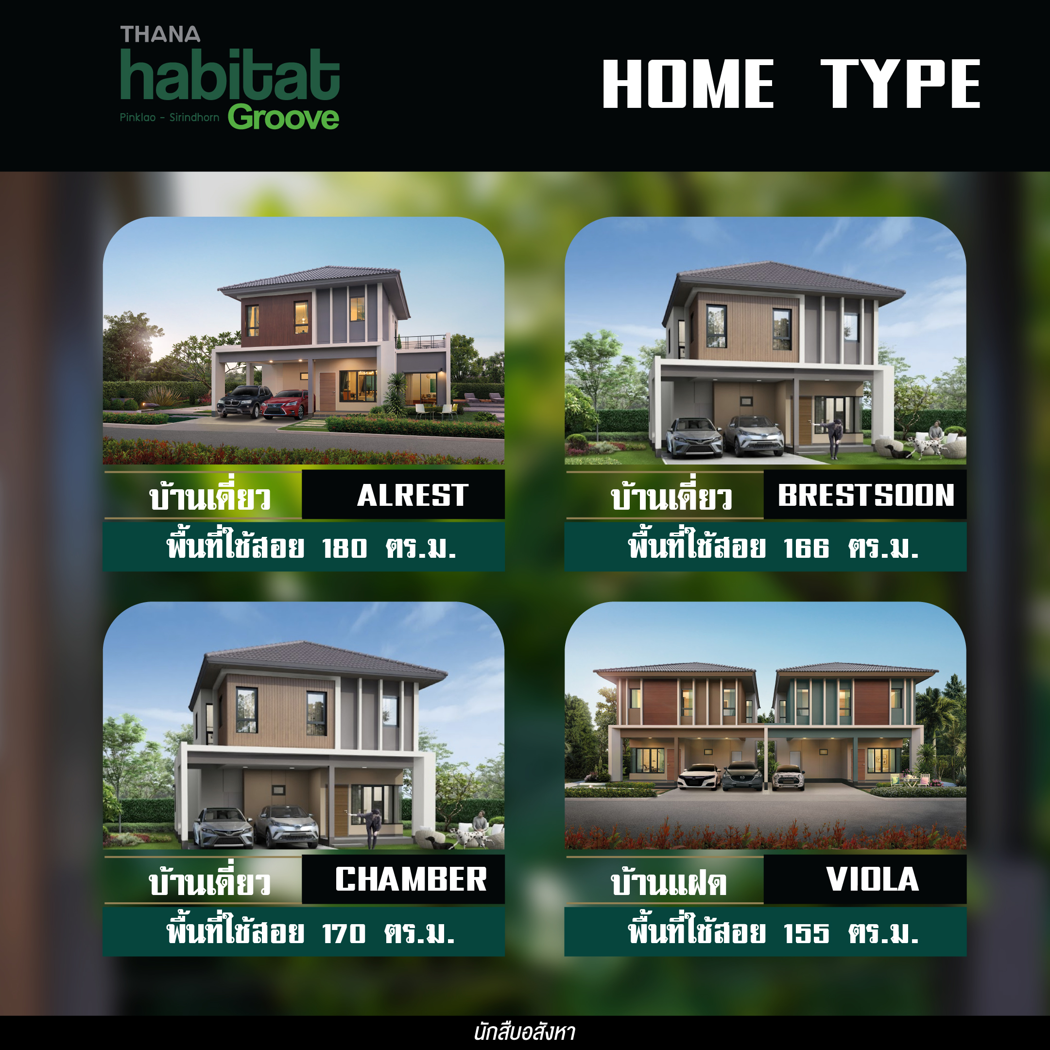 สำหรับรูปแบบบ้านโครงการ ธนาฮาบิแทต กรู๊ฟ ปิ่นเกล้า-สิรินธร (Thanahabitat Groove Pinklao – Sirindhorn) จะมีให้เลือกทั้งหมด 4 แบบ มีทั้งบ้านแฝด และบ้านเดี่ยว พื้นที่โครงการขนาด 23-3-43 ไร่ จำนวนบ้าน 125 ยูนิต เป็นเดี่ยวและบ้านแฝด สไตล์ Modern Tropical & Minimal style จุดเด่นสำคัญคือ แบบบ้านเป็นสไตล์หน้ากว้างเพื่อให้ทุกฟังก์ชั่นได้สัมผัสกับธรรมชาติด้านหน้าบ้านได้อย่างเต็มที่ ออกแบบบ้านให้มีความเป็นส่วนตัวและแบ่งฟังก์ชั่นใช้สอยได้อย่างลงตัวและเป็นสัดส่วน และตัวบ้านก่อสร้างด้วยผนังก่ออิฐมวลเบา ที่แข็งแรง ทนทาน กันความร้อนและเก็บเสียงได้มากกว่าผนังทั่วไป